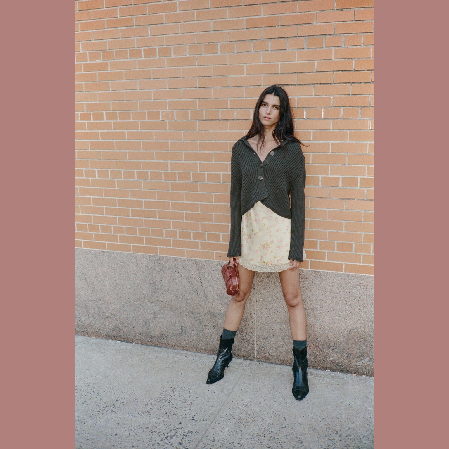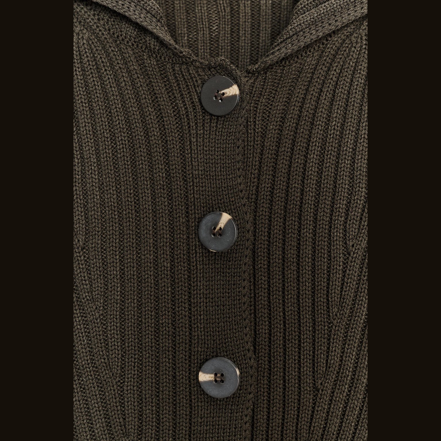 كارديغان محبوك مضلع بأزرار – لون طبيعي (كاكي داكن) – Dark Khaki (Rib Knit Cardigan with Buttons) كارديغان أنيق بلون كاكي داكن طبيعي، مصنوع من خامة محبوكة مضلعة تمنح راحة وملمسًا ناعمًا، مع تصميم كلاسيكي مزود بياقة مطوية وأكمام طويلة. يتميز بأزرار أمامية للإغلاق تضيف لمسة عصرية أنيقة. قطعة مثالية للتنسيقات اليومية الكاجوال الأنيقة أو كطبقة إضافية في المواسم الانتقالية.