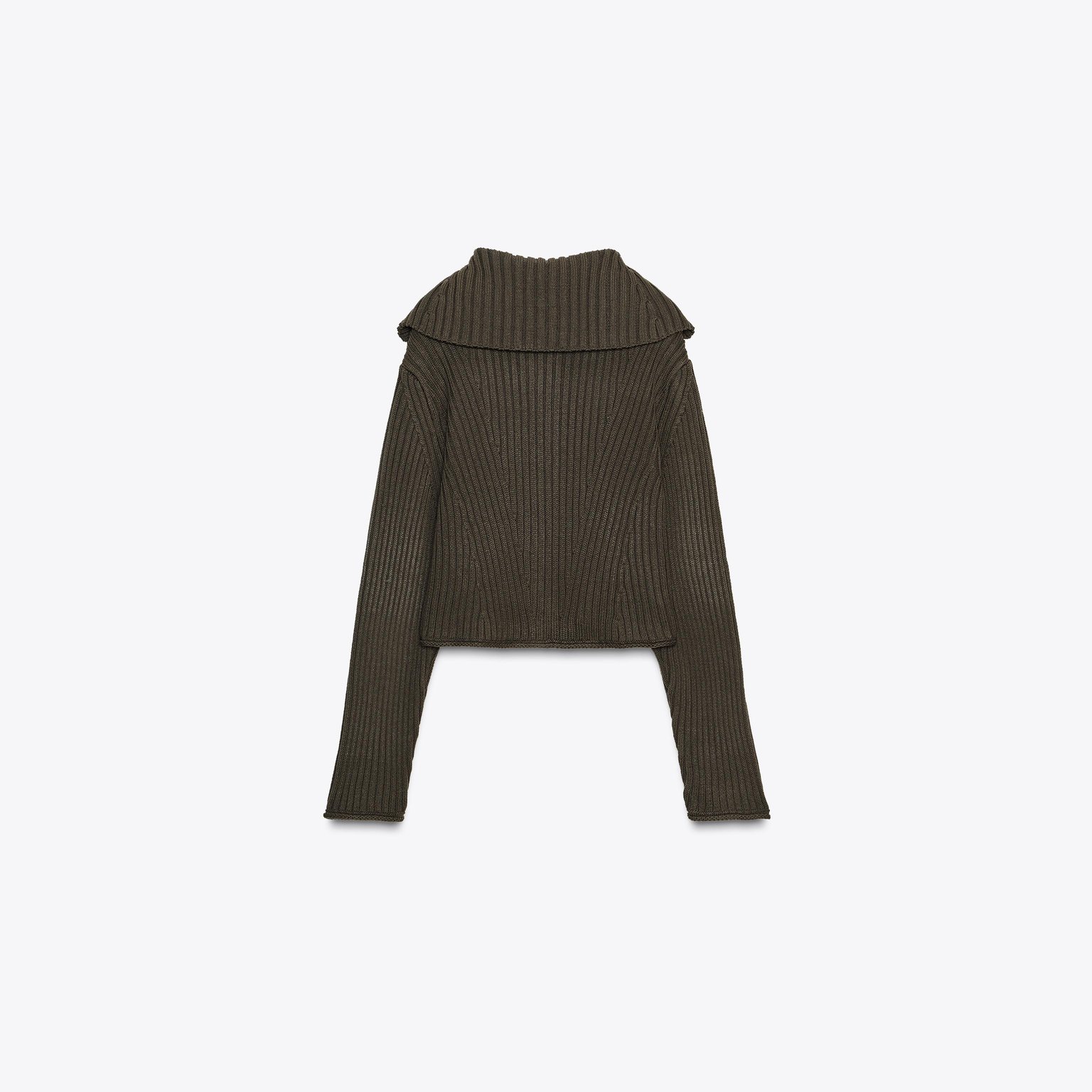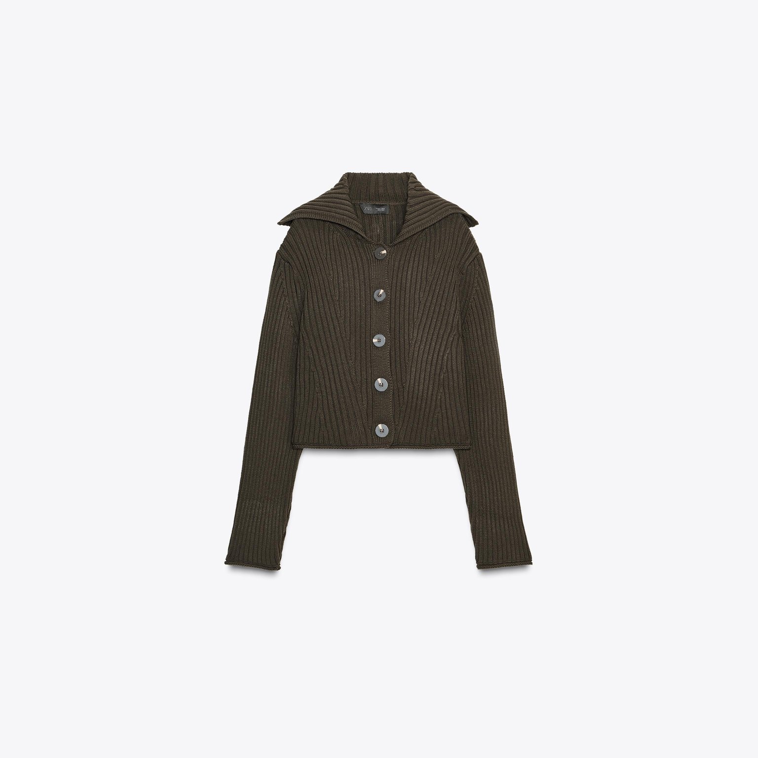 - التصميم: كارديغان محبوك مضلع بأزرار (Rib Knit Cardigan with Buttons)