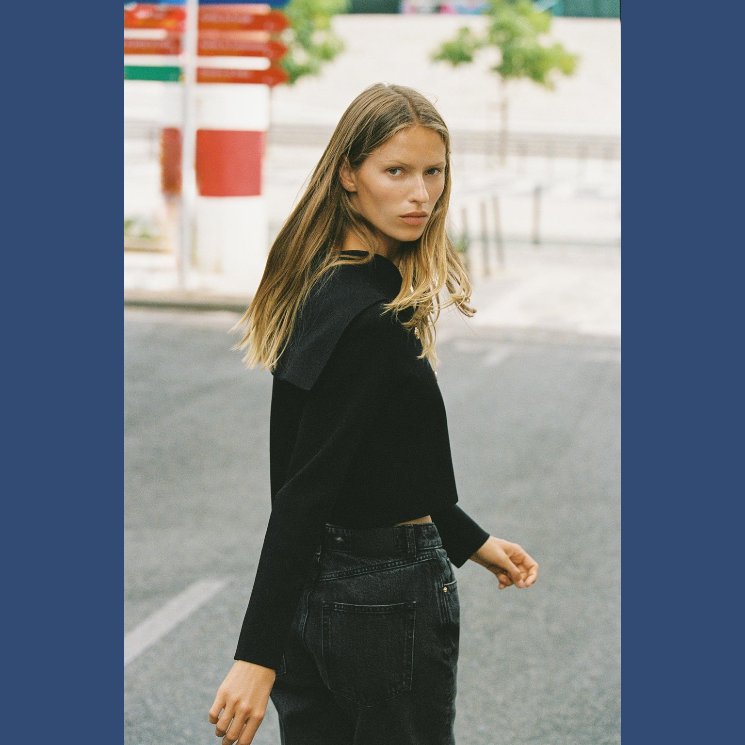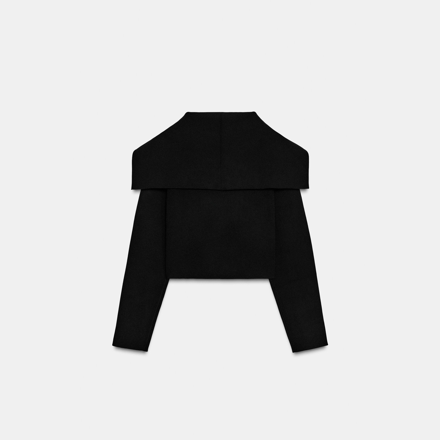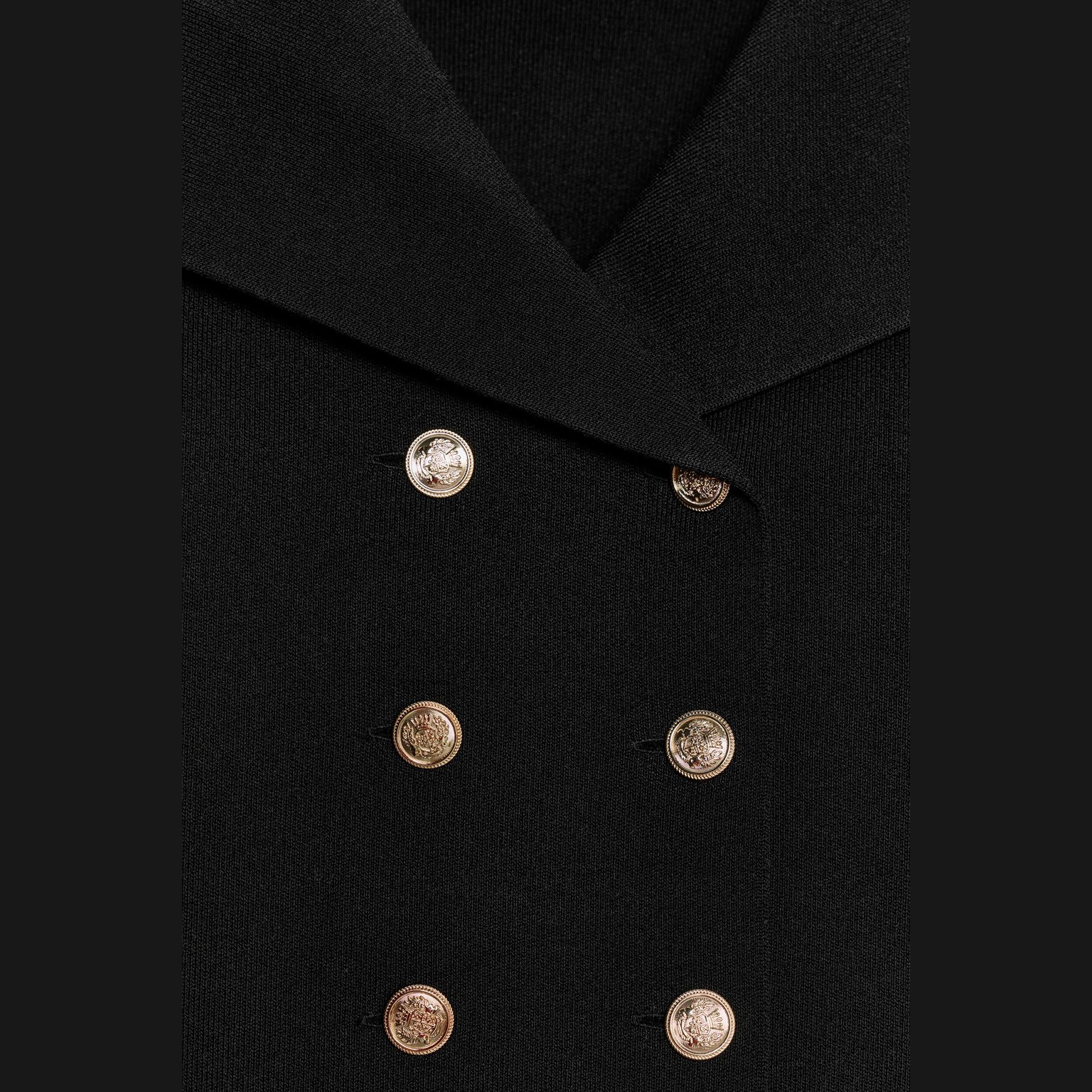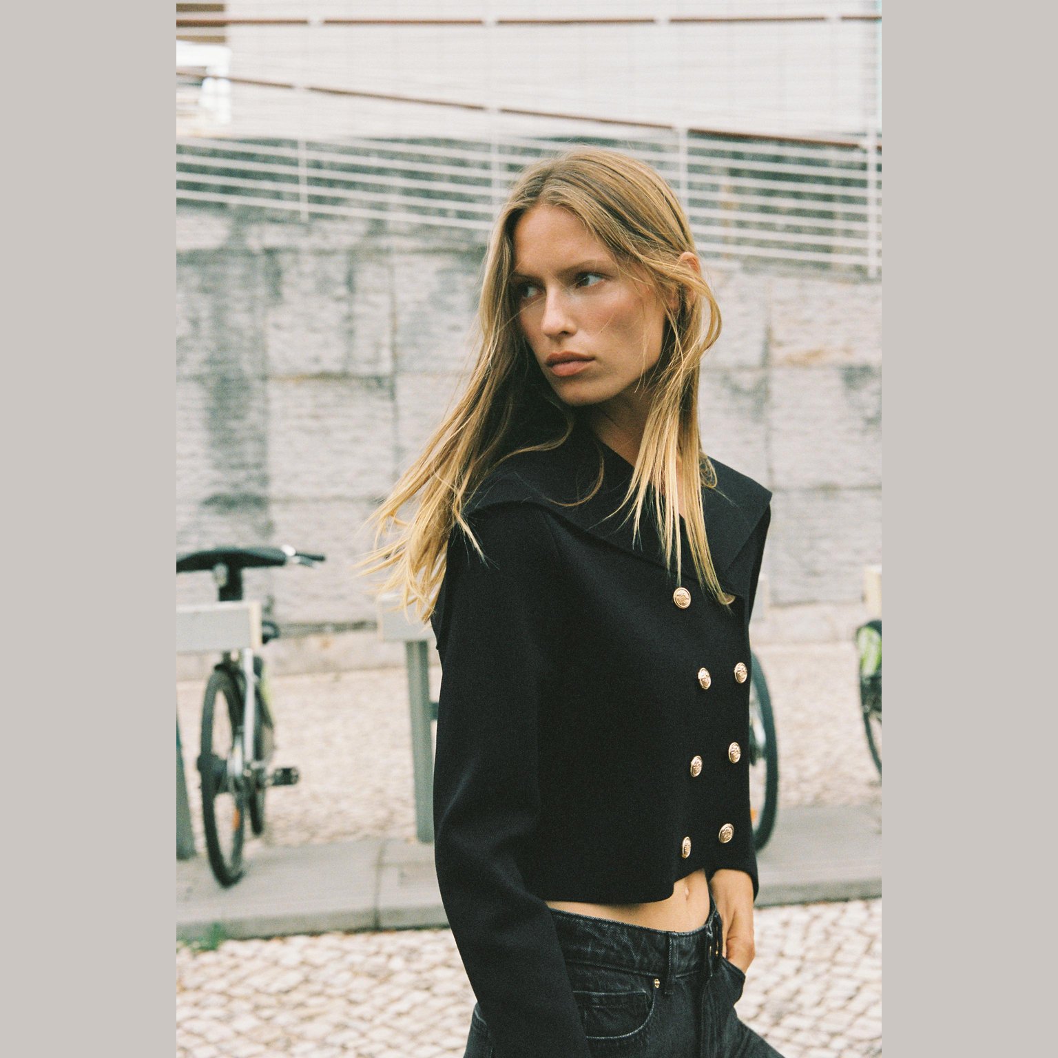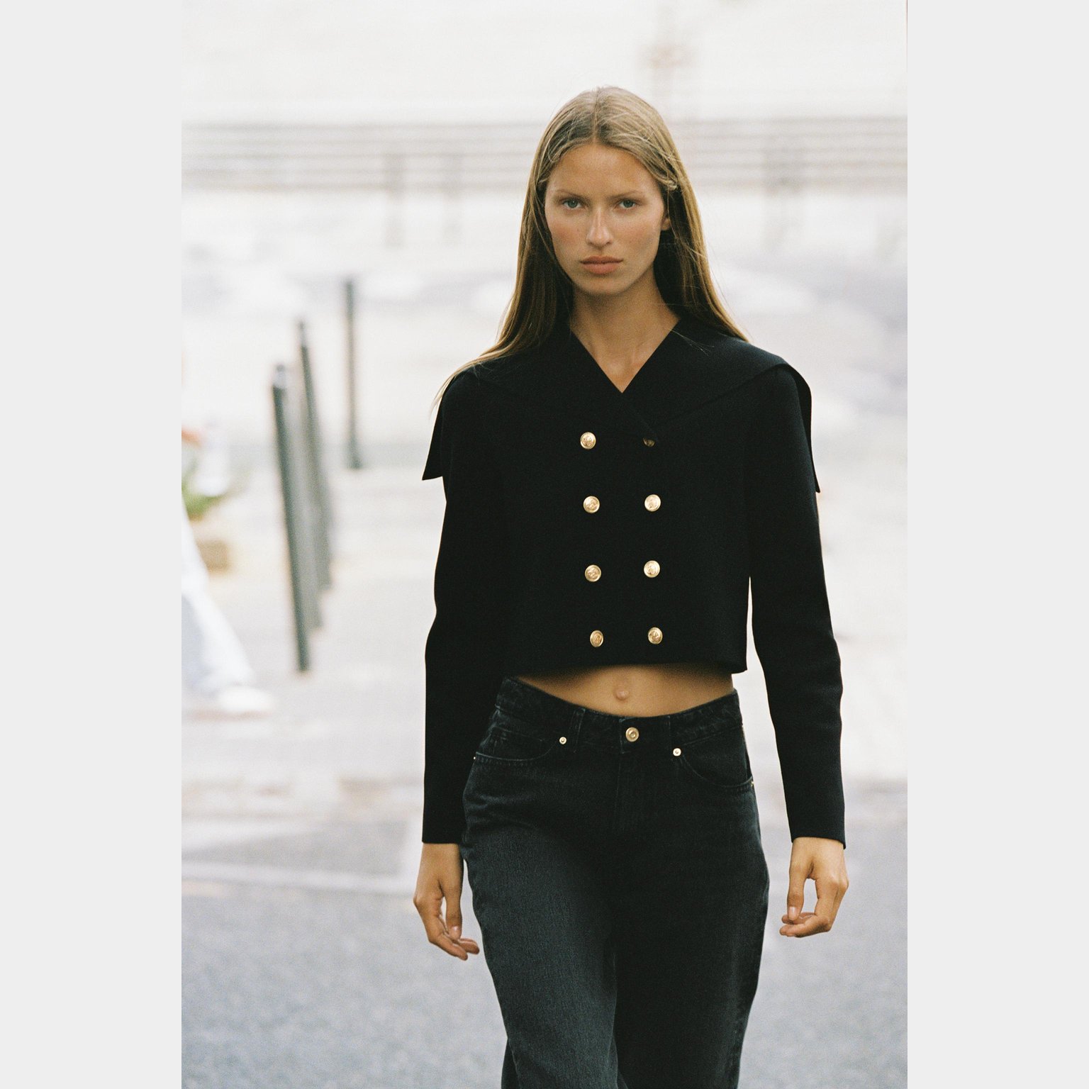 - التصميم: جاكيت محبوك قصير مزدوج الصدر (Double-Breasted Cropped Knit Jacket)