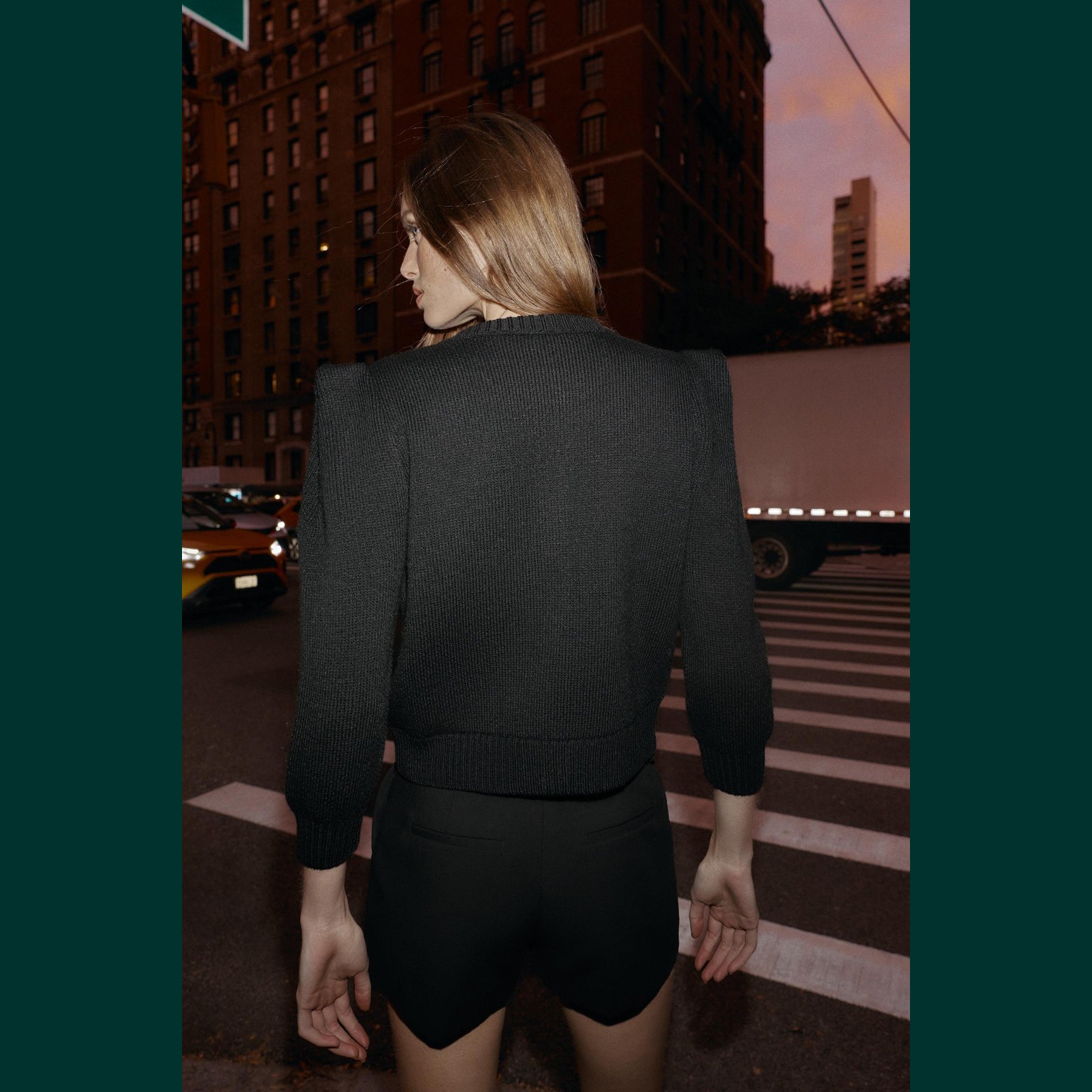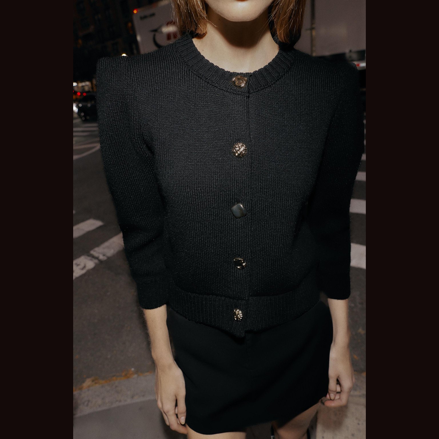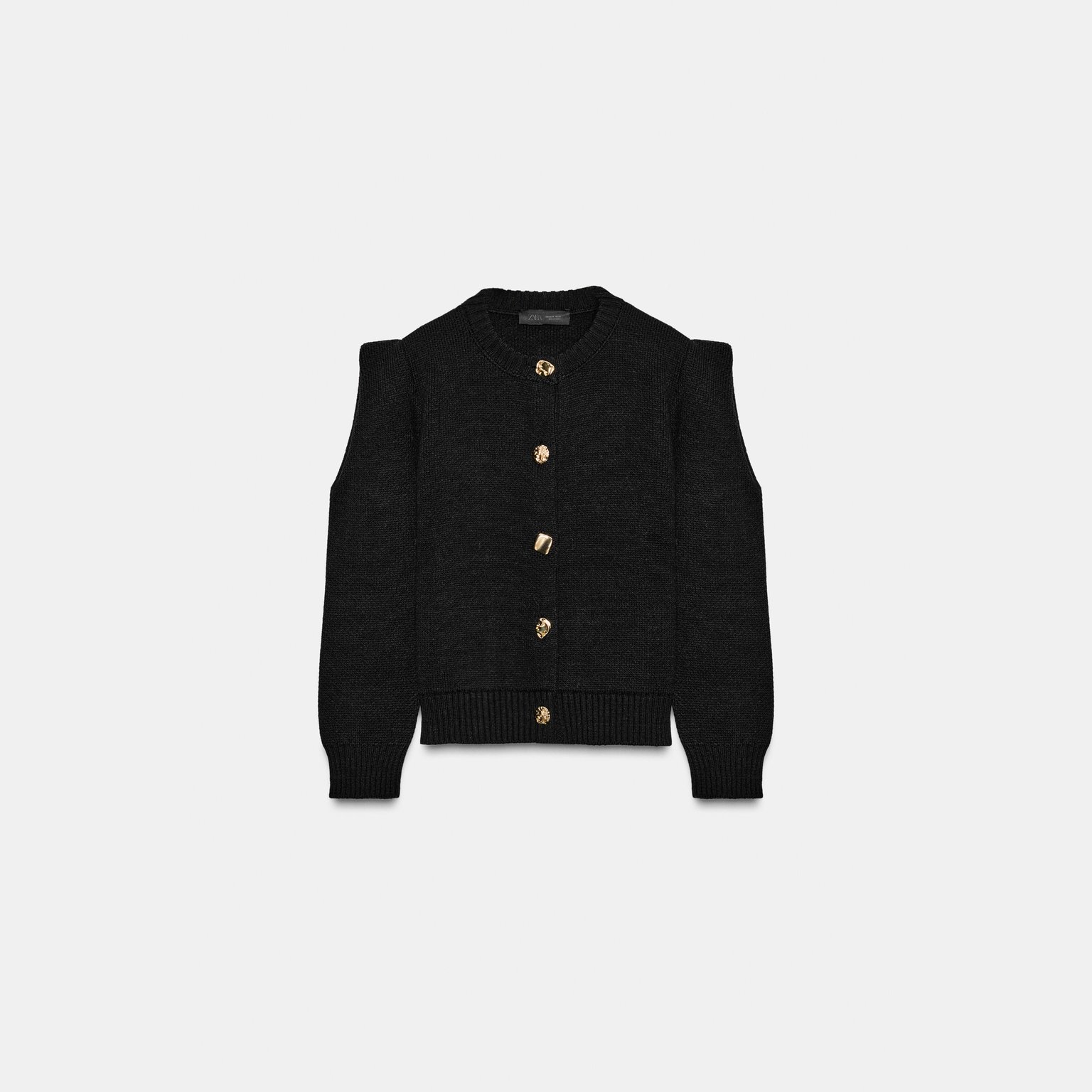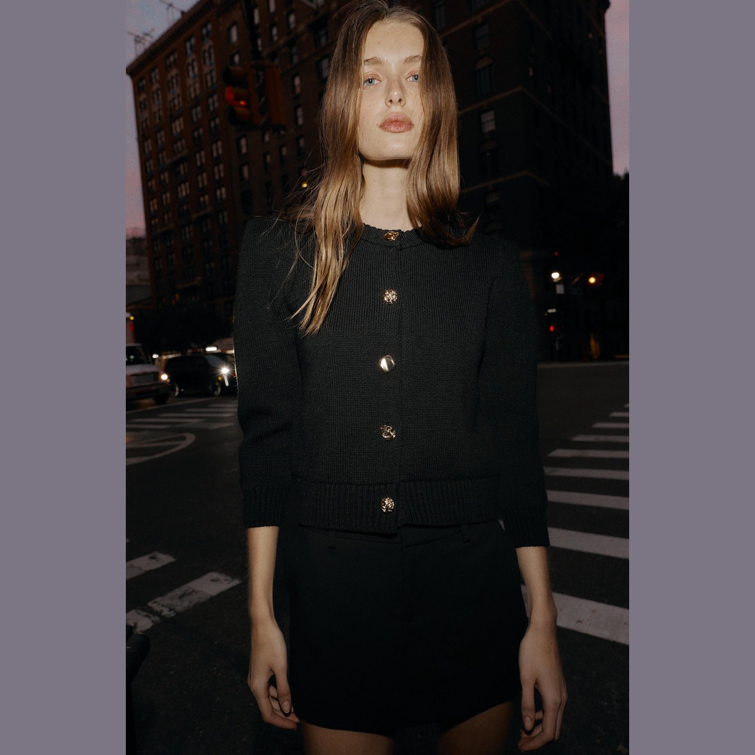 كارديغان محبوك بأكتاف محددة – لون طبيعي (أسود) – Black (Cardigan with Defined Shoulders) كارديغان أنيق بلون أسود طبيعي، مصنوع من خامة محبوكة عملية تمنح راحة وملمسًا ناعمًا، مع تصميم مزود بأكتاف محددة تضيف لمسة عصرية مميزة. يتميز بياقة مستديرة، أكمام بطول ما تحت المرفق، وأزرار ذهبية أمامية للإغلاق. قطعة مثالية للتنسيقات اليومية الكاجوال الأنيقة أو كطبقة إضافية في المواسم الانتقالية.