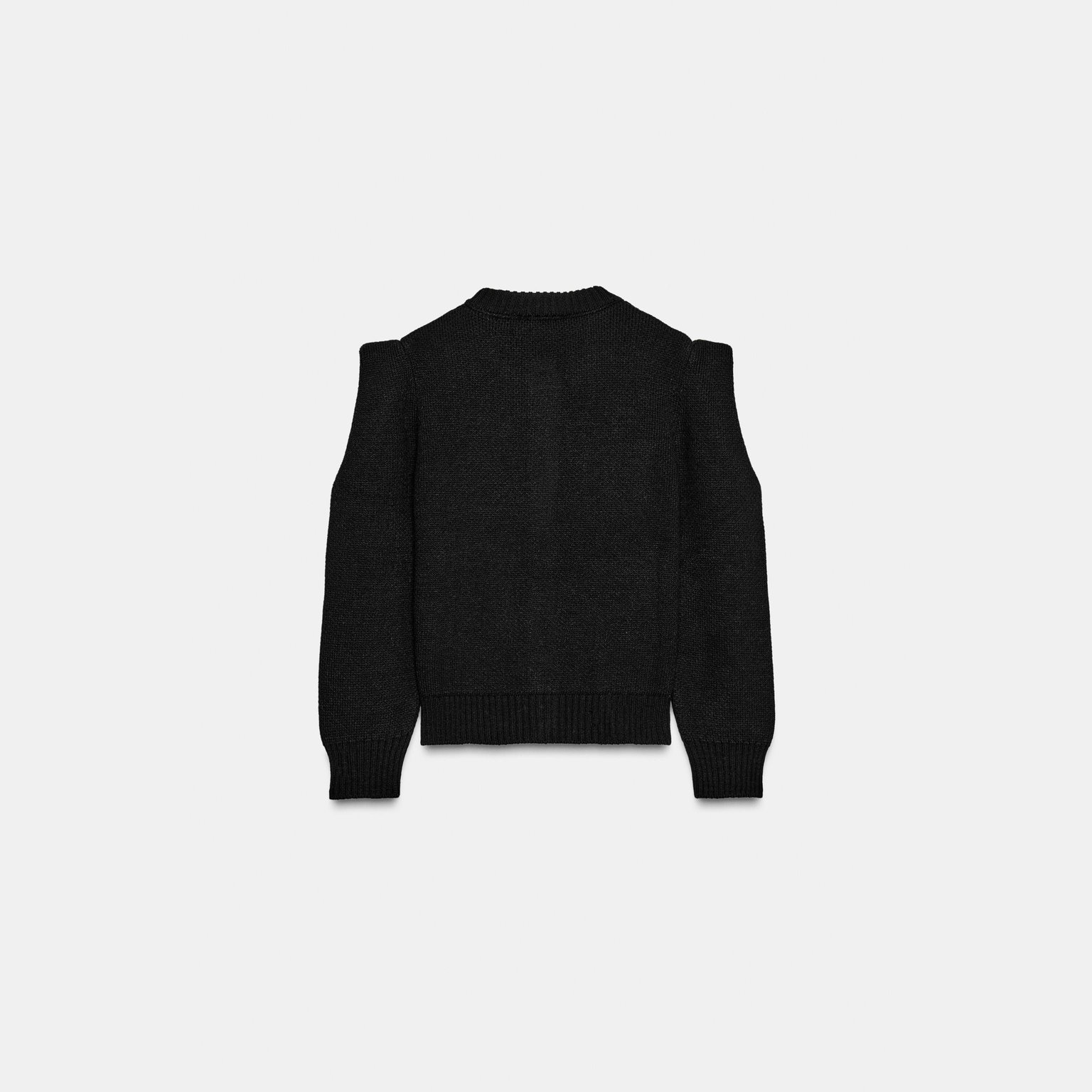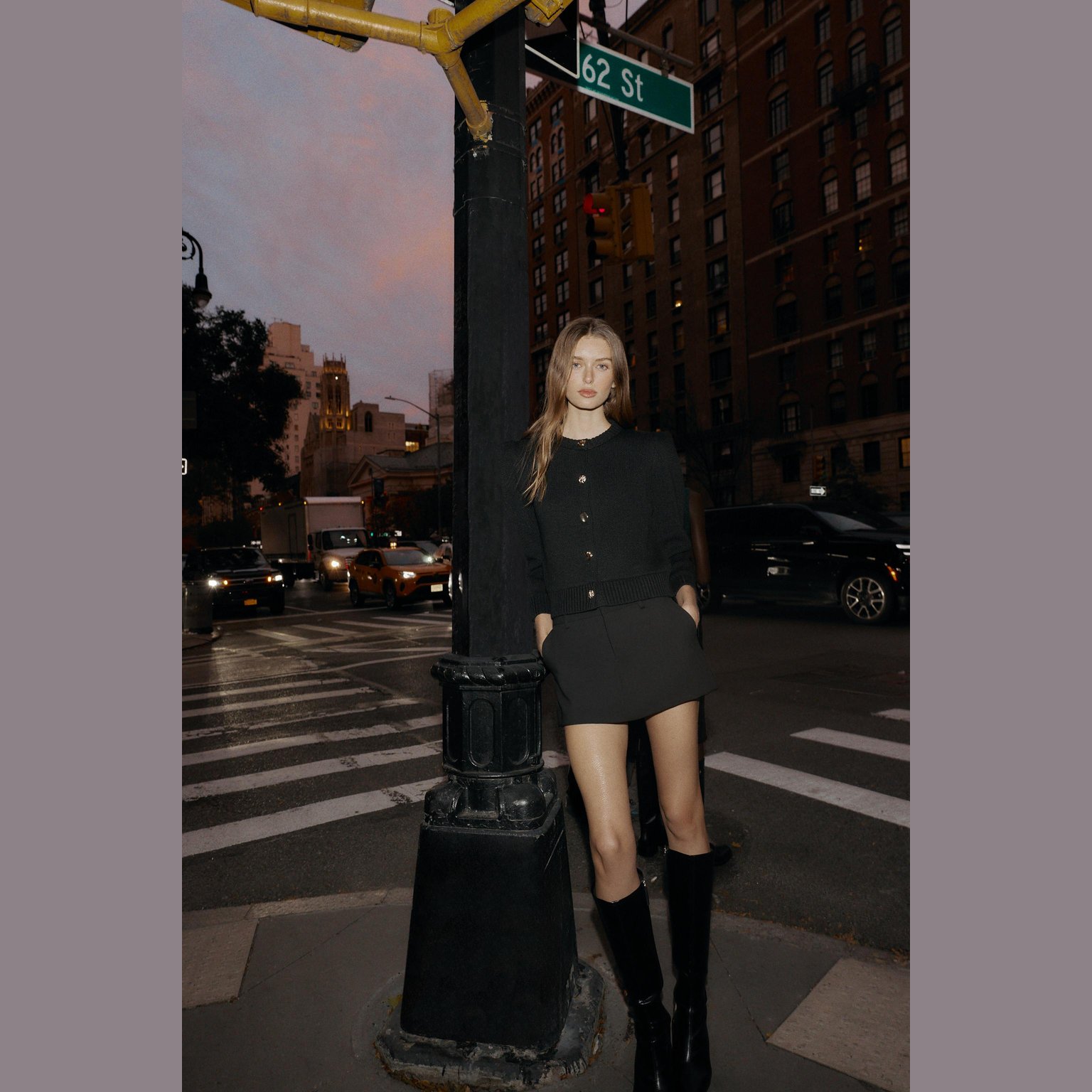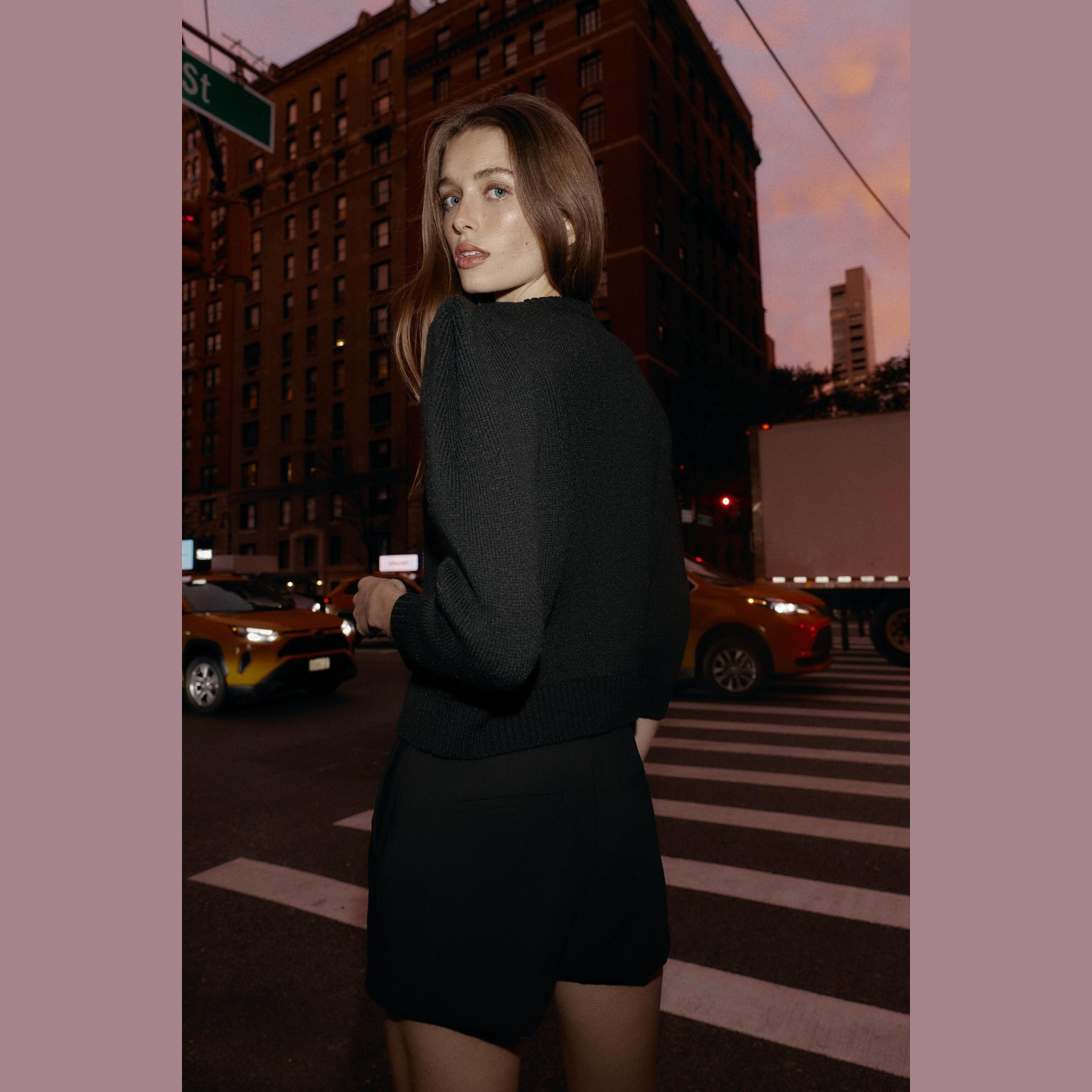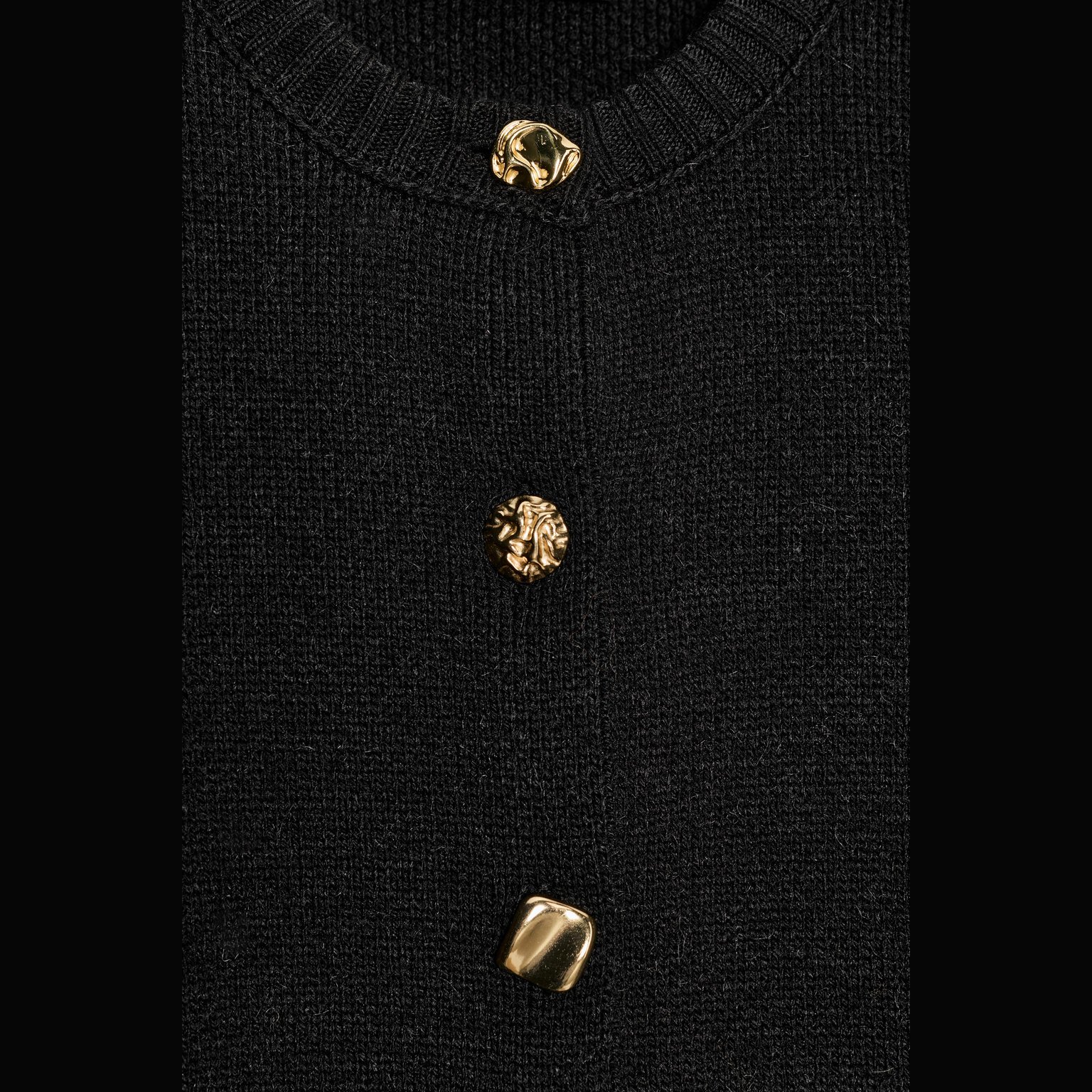 كارديغان محبوك بأكتاف محددة – لون طبيعي (أسود) – Black (Cardigan with Defined Shoulders) كارديغان أنيق بلون أسود طبيعي، مصنوع من خامة محبوكة عملية تمنح راحة وملمسًا ناعمًا، مع تصميم مزود بأكتاف محددة تضيف لمسة عصرية مميزة. يتميز بياقة مستديرة، أكمام بطول ما تحت المرفق، وأزرار ذهبية أمامية للإغلاق. قطعة مثالية للتنسيقات اليومية الكاجوال الأنيقة أو كطبقة إضافية في المواسم الانتقالية.