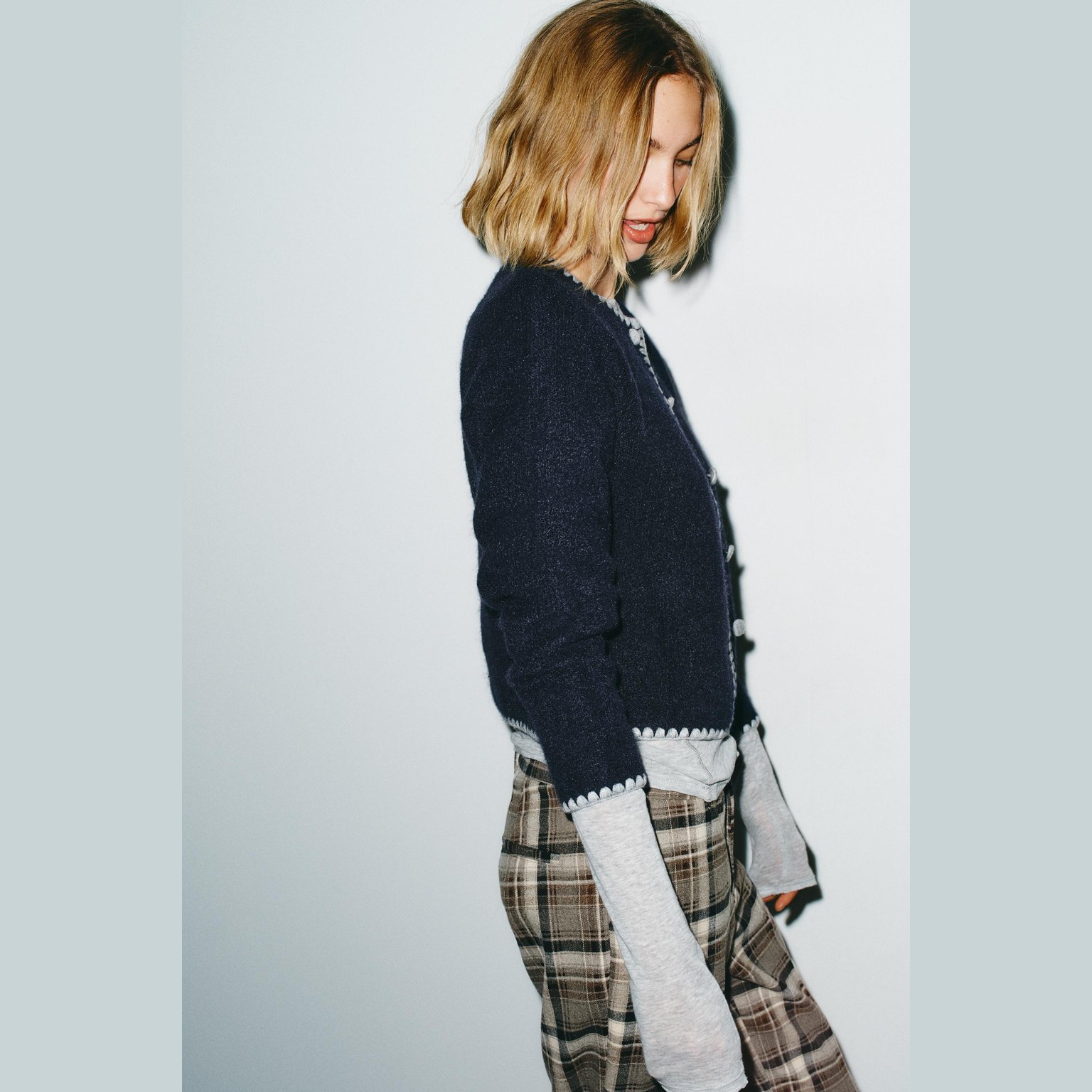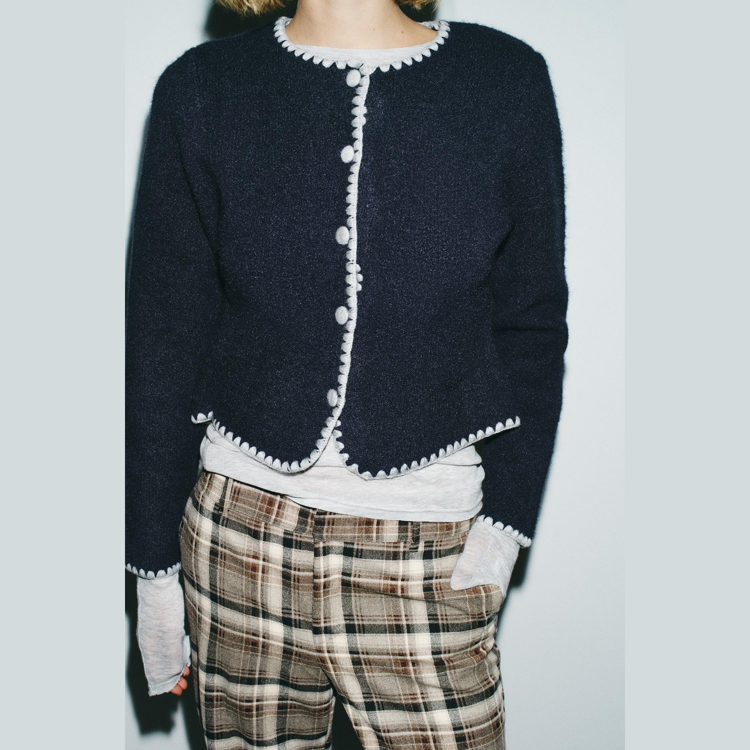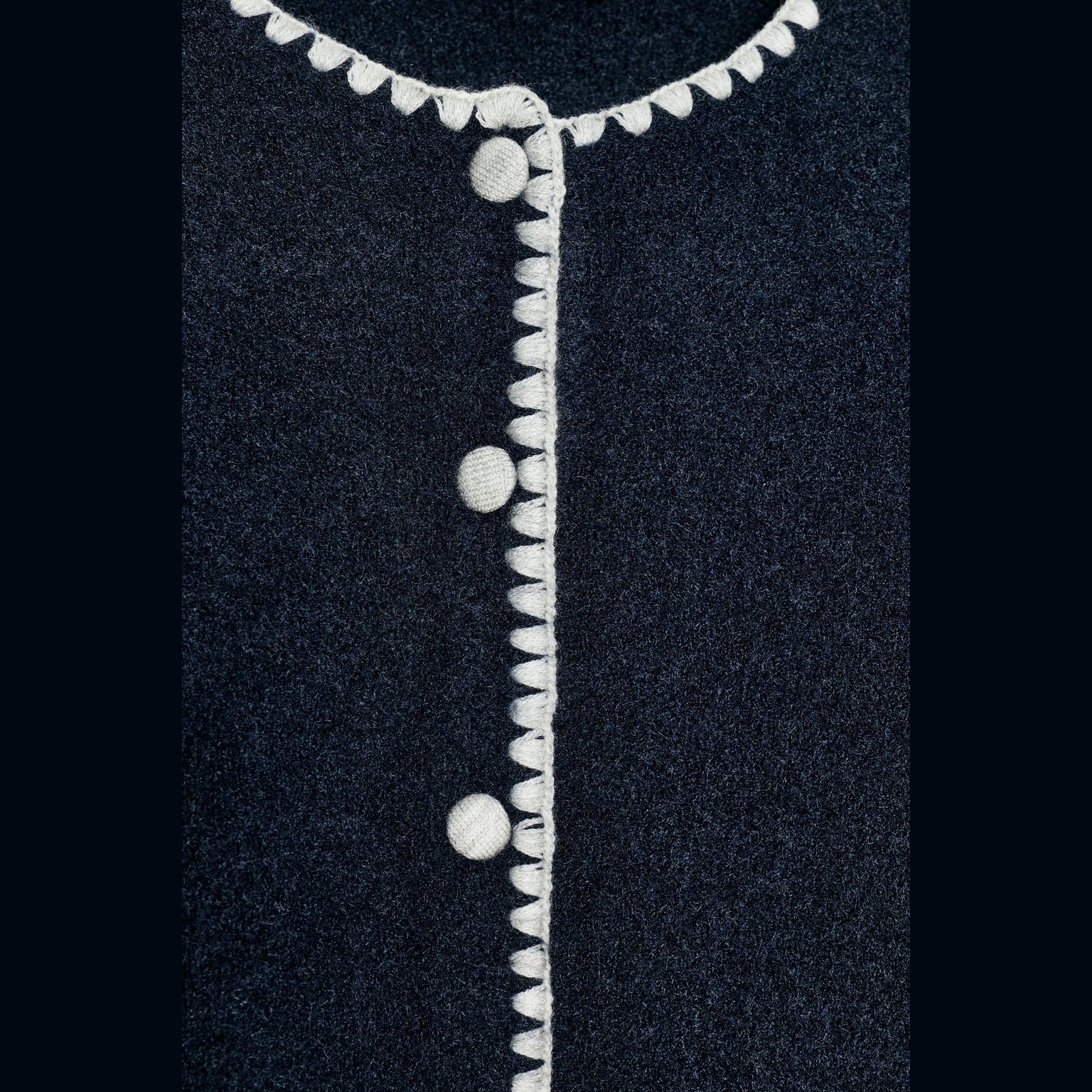كارديغان محبوك مطرز بتفاصيل متباينة – لون طبيعي (كحلي) – Navy Blue (Contrast Embroidered Cardigan) كارديغان أنيق بلون كحلي طبيعي، مصنوع من خامة محبوكة عملية تمنح راحة وملمسًا ناعمًا، مع تصميم كلاسيكي مزود بياقة مستديرة وأكمام طويلة. يتميز بتطريز متباين على الحواف وأزرار أمامية مغطاة تضيف لمسة عصرية أنيقة. قطعة مثالية للتنسيقات اليومية الكاجوال الأنيقة أو كطبقة إضافية في المواسم الانتقالية.