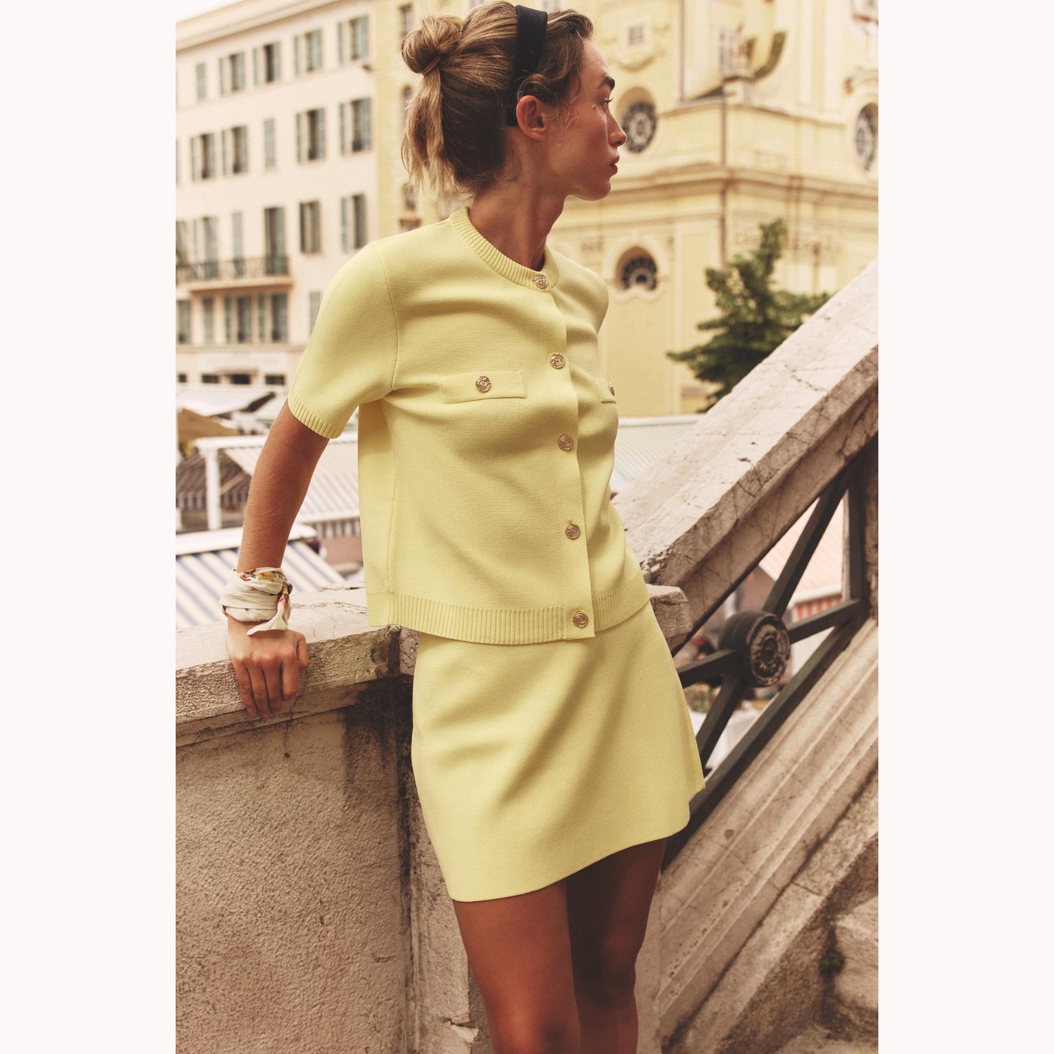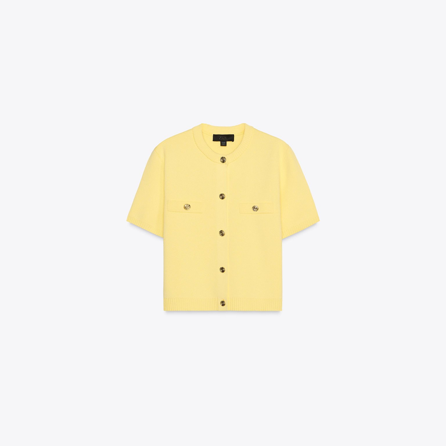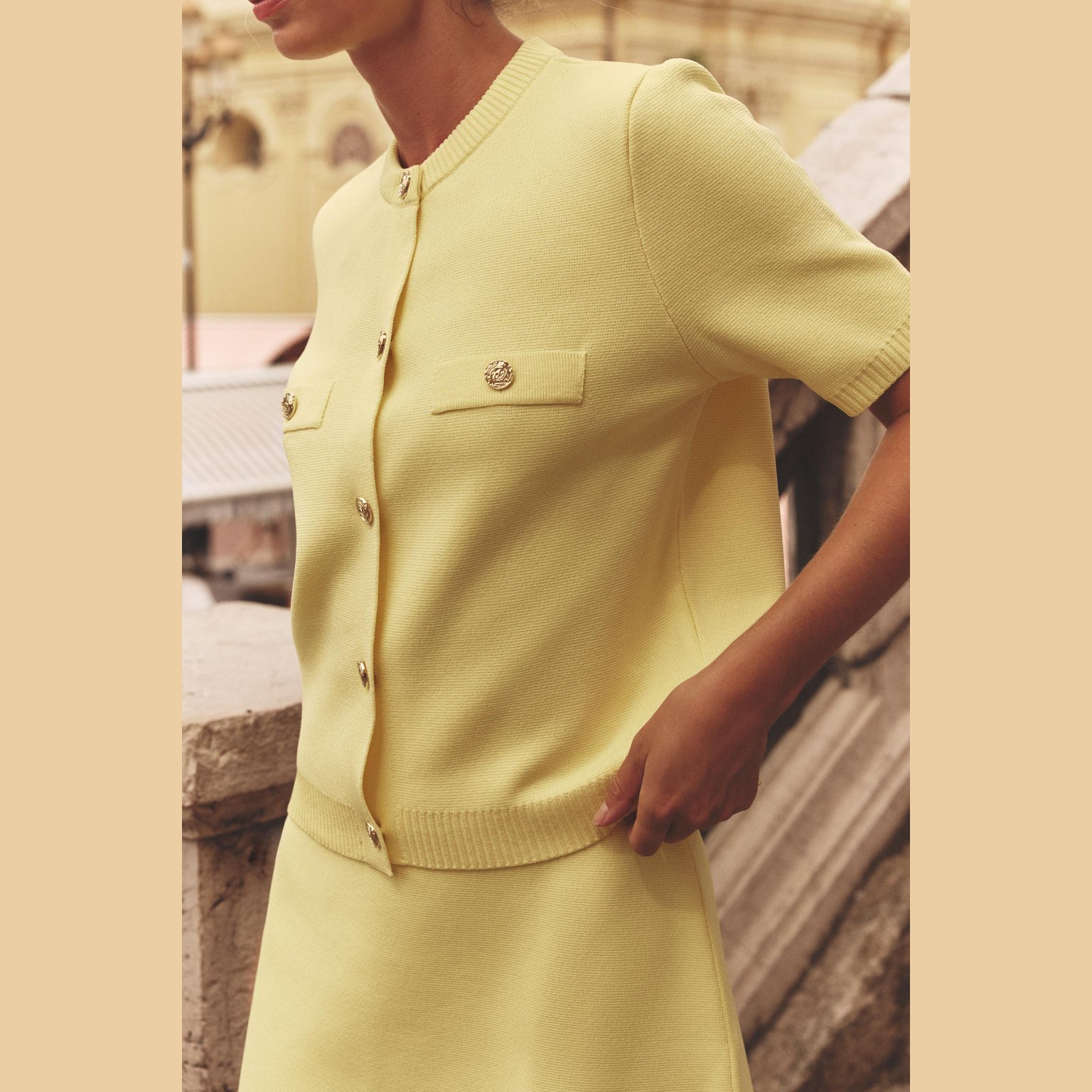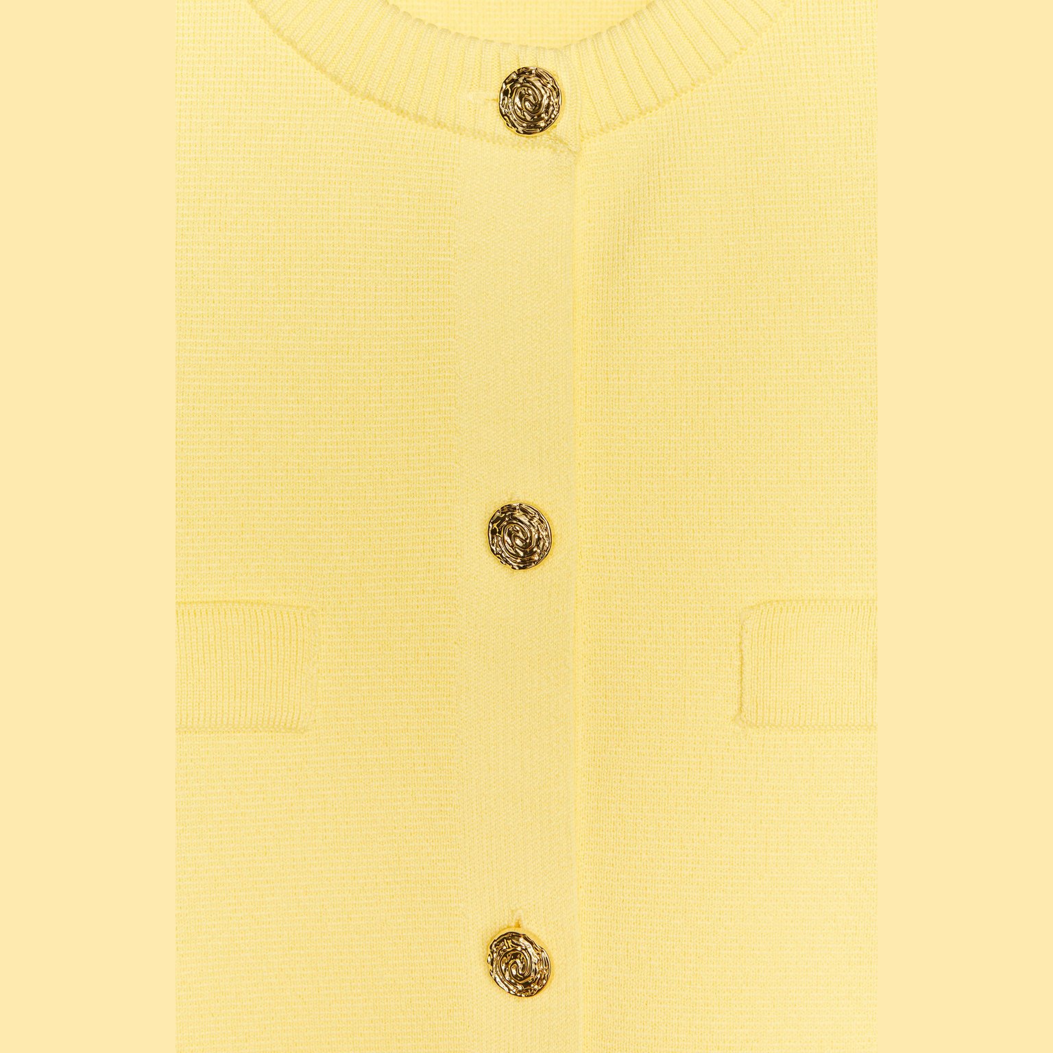 كارديغان محبوك قصير الأكمام – لون طبيعي (أصفر) – Yellow (Short Sleeve Knit Cardigan) كارديغان أنيق بلون أصفر طبيعي، مصنوع من خامة محبوكة عملية تمنح راحة وملمسًا ناعمًا، مع تصميم قصير الأكمام مزود بياقة مستديرة وأزرار أمامية ذهبية للإغلاق. قطعة مثالية للتنسيقات اليومية الكاجوال الأنيقة أو كطبقة خفيفة في المواسم الانتقالية.