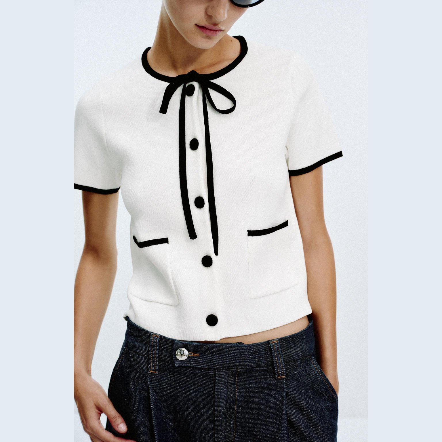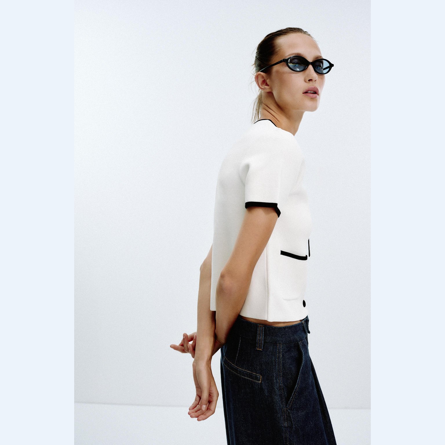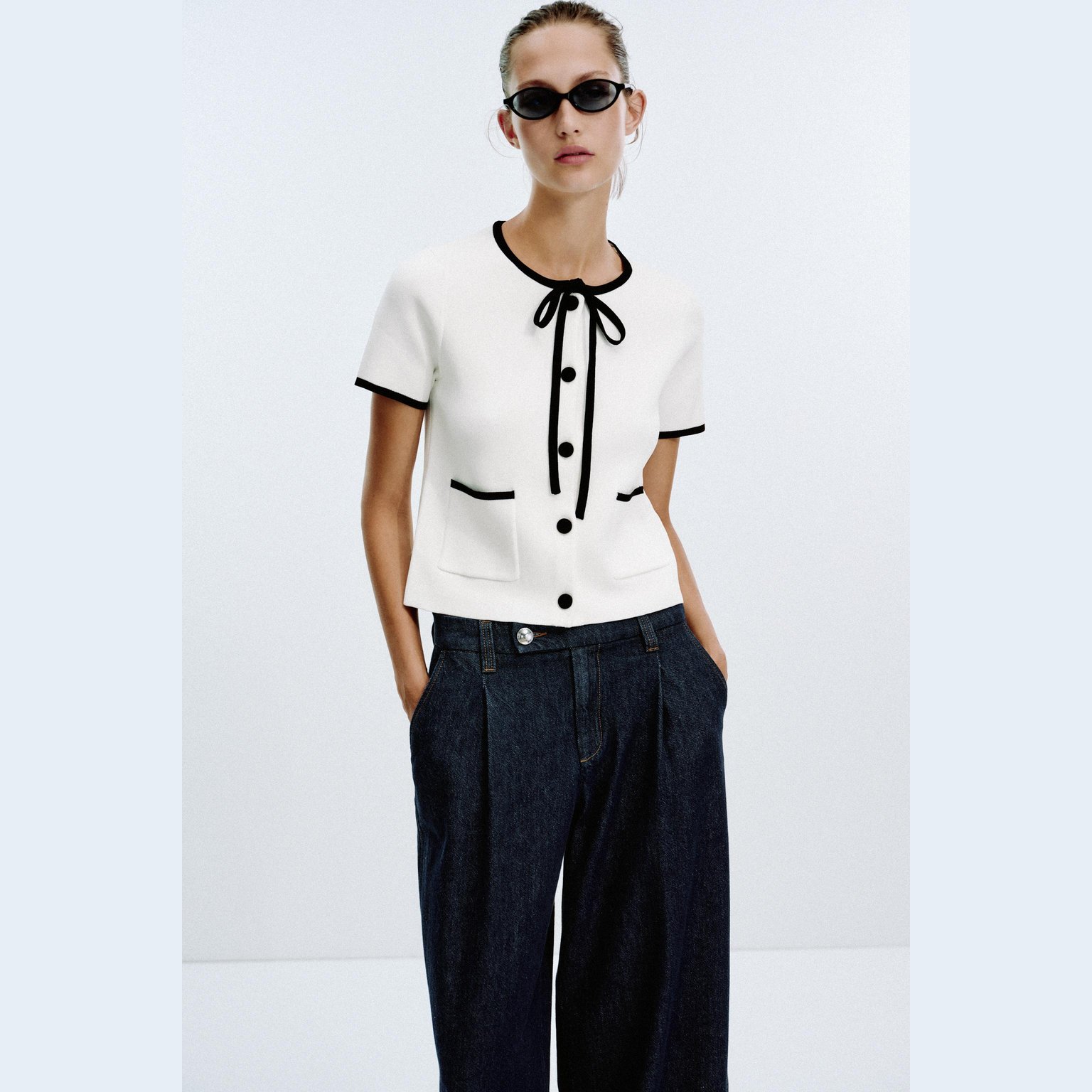 كارديغان محبوك بتفاصيل متباينة – لون طبيعي (أبيض) – White (Cardigan with Contrast Trims) كارديغان أنيق بلون أبيض طبيعي، مصنوع من خامة محبوكة عملية تمنح راحة وملمسًا ناعمًا، مع تصميم قصير الأكمام مزود بياقة مستديرة وجيوب أمامية عملية. يتميز بتفاصيل متباينة على الحواف وأزرار أمامية للإغلاق، مما يمنح لمسة عصرية أنيقة. قطعة مثالية للتنسيقات اليومية الكاجوال الأنيقة أو كطبقة خفيفة في المواسم الانتقالية.