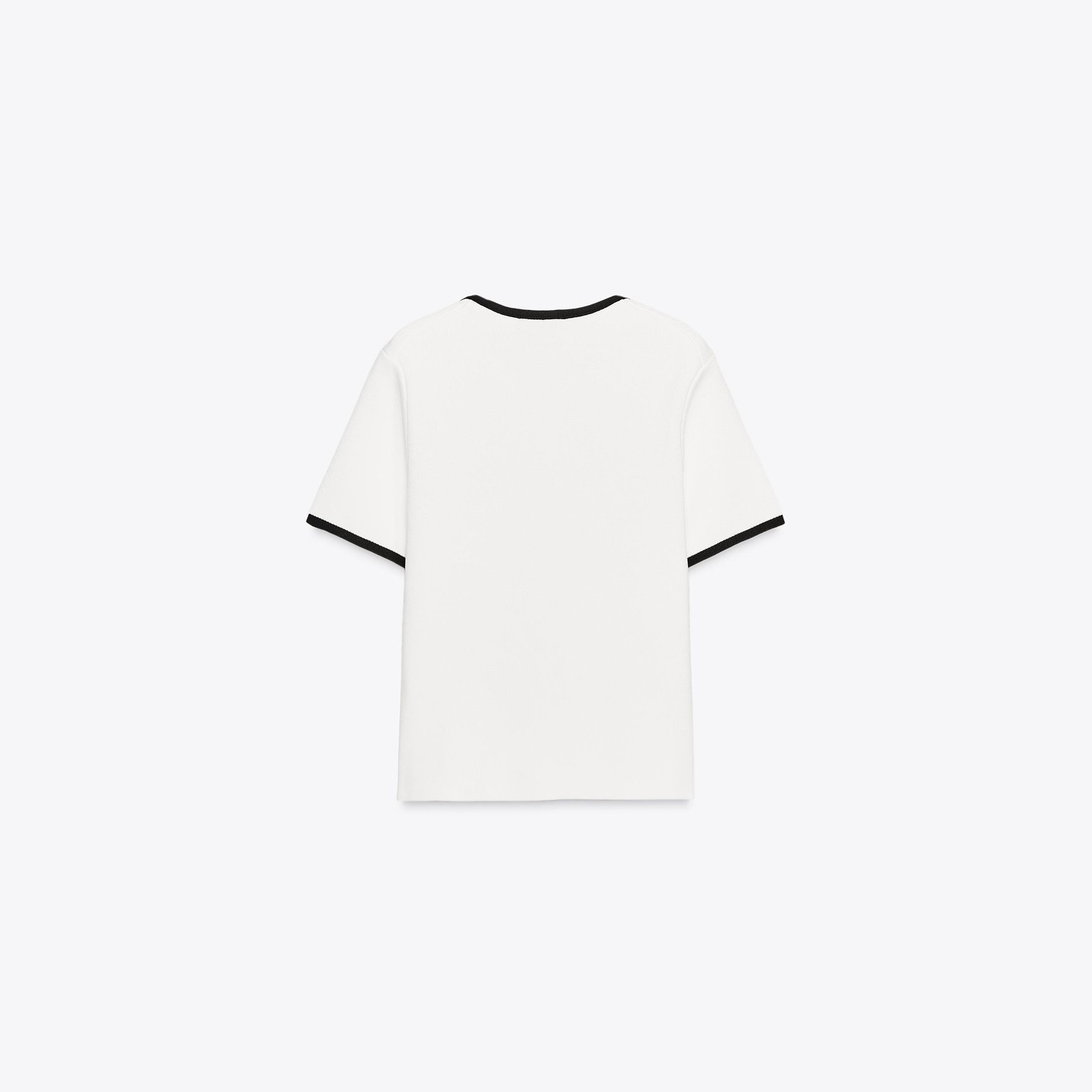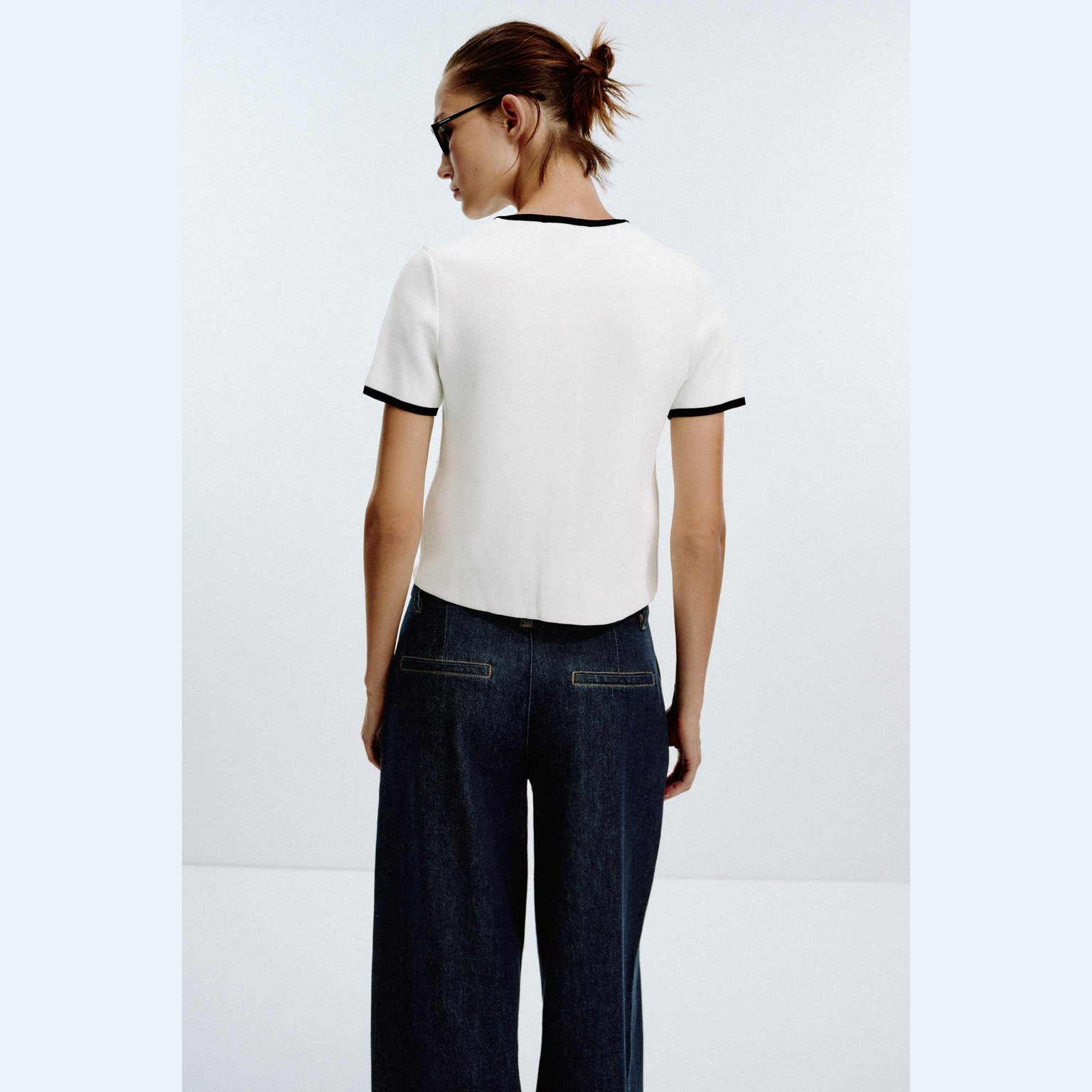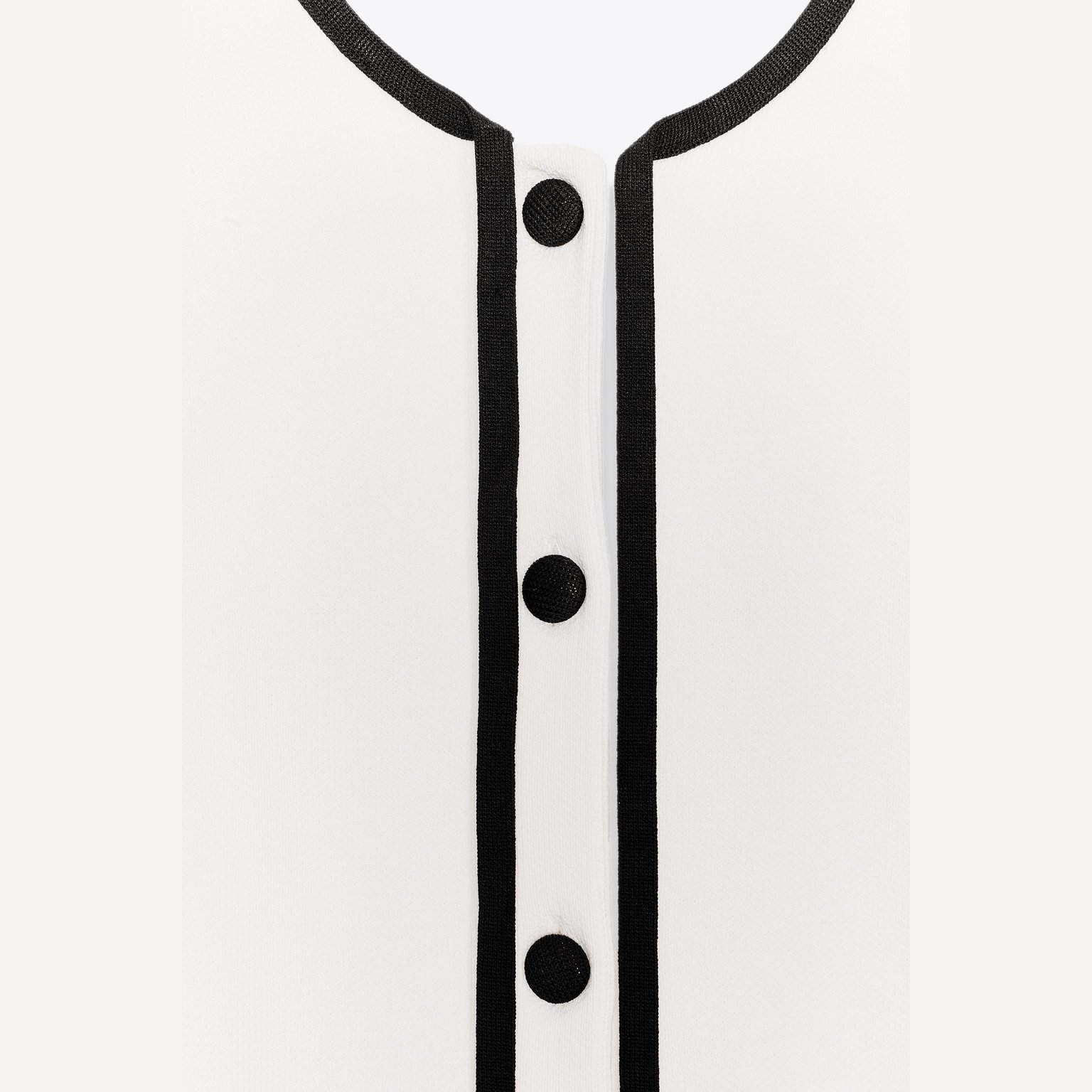 كارديغان محبوك بتفاصيل متباينة – لون طبيعي (أبيض) – White (Cardigan with Contrast Trims) كارديغان أنيق بلون أبيض طبيعي، مصنوع من خامة محبوكة عملية تمنح راحة وملمسًا ناعمًا، مع تصميم قصير الأكمام مزود بياقة مستديرة وجيوب أمامية عملية. يتميز بتفاصيل متباينة على الحواف وأزرار أمامية للإغلاق، مما يمنح لمسة عصرية أنيقة. قطعة مثالية للتنسيقات اليومية الكاجوال الأنيقة أو كطبقة خفيفة في المواسم الانتقالية.