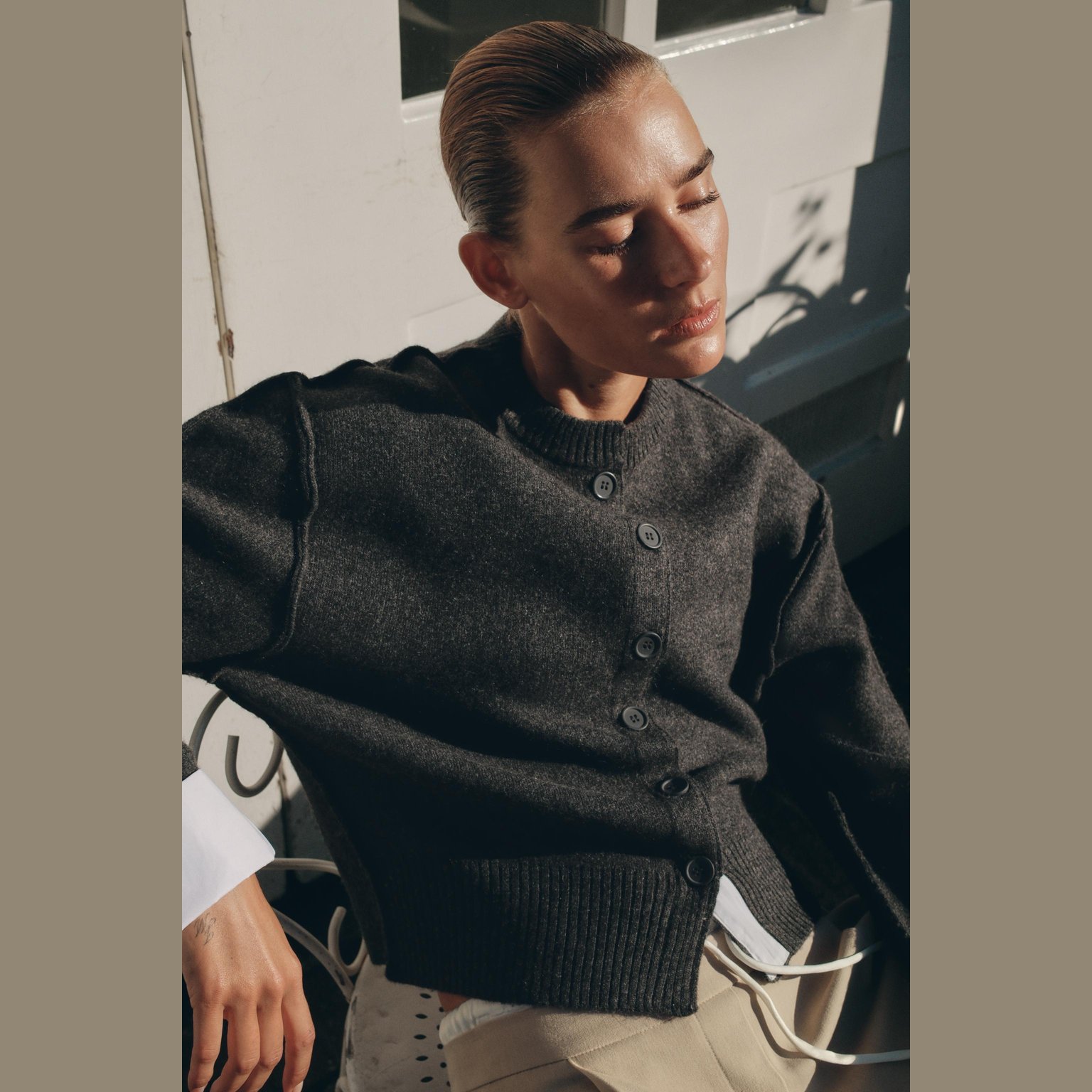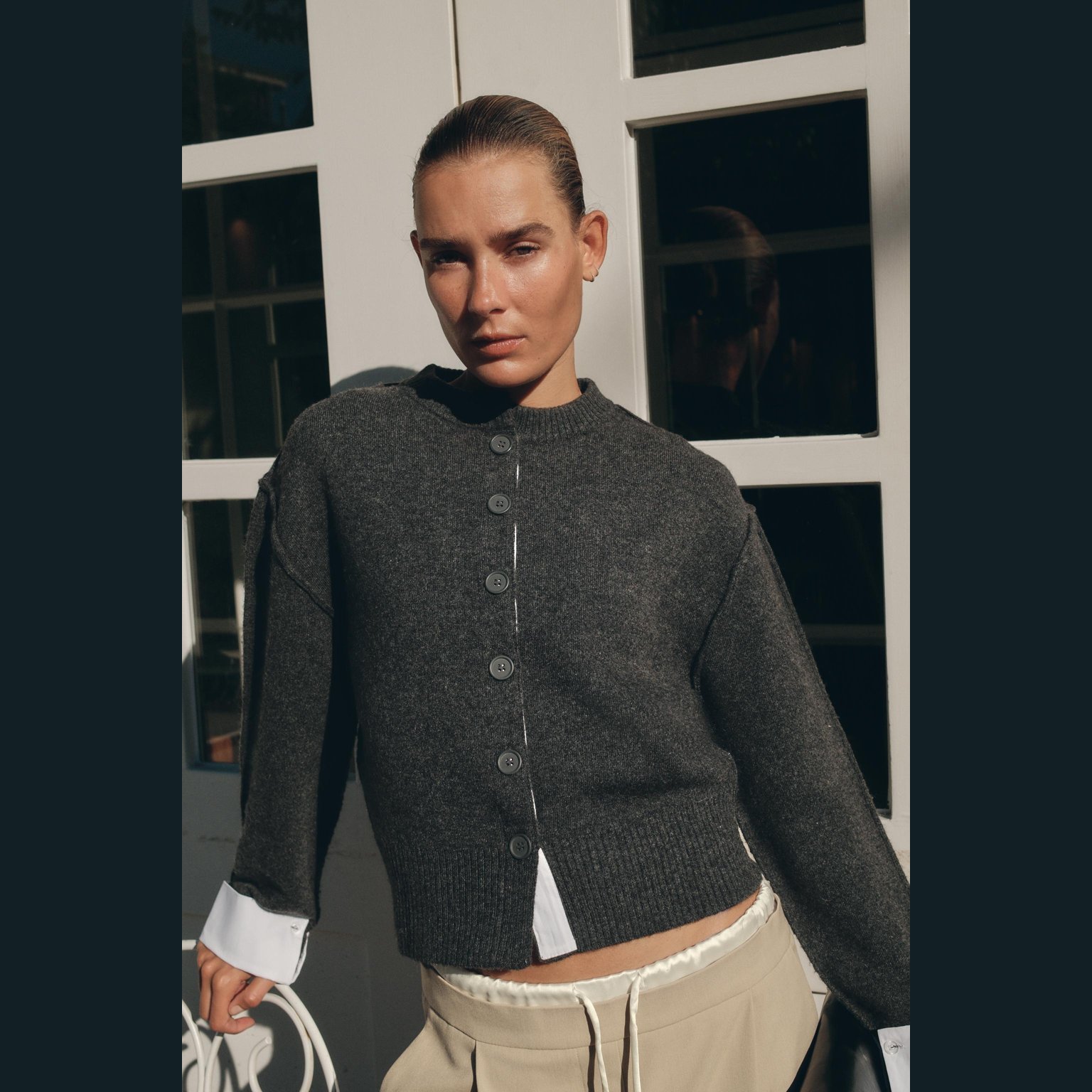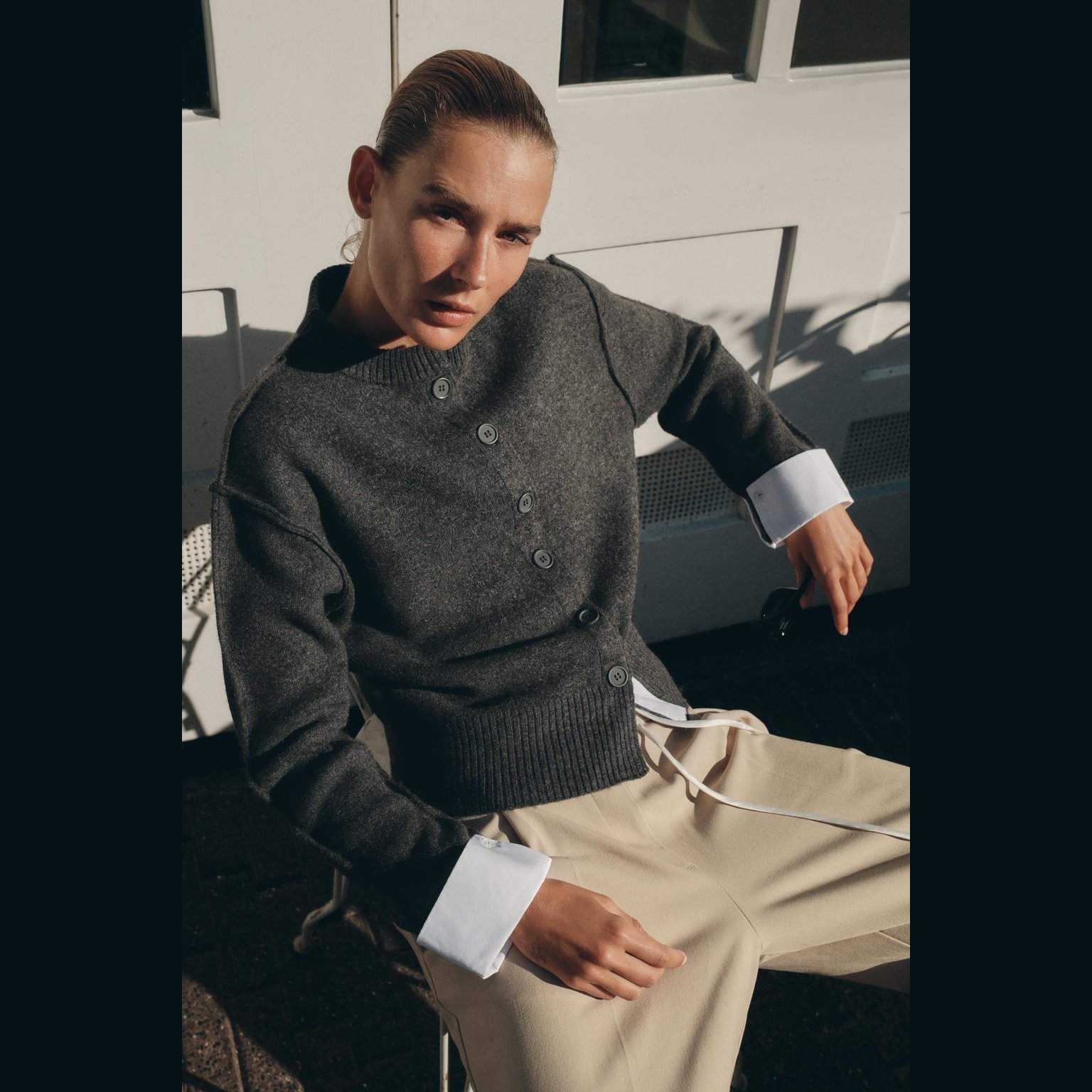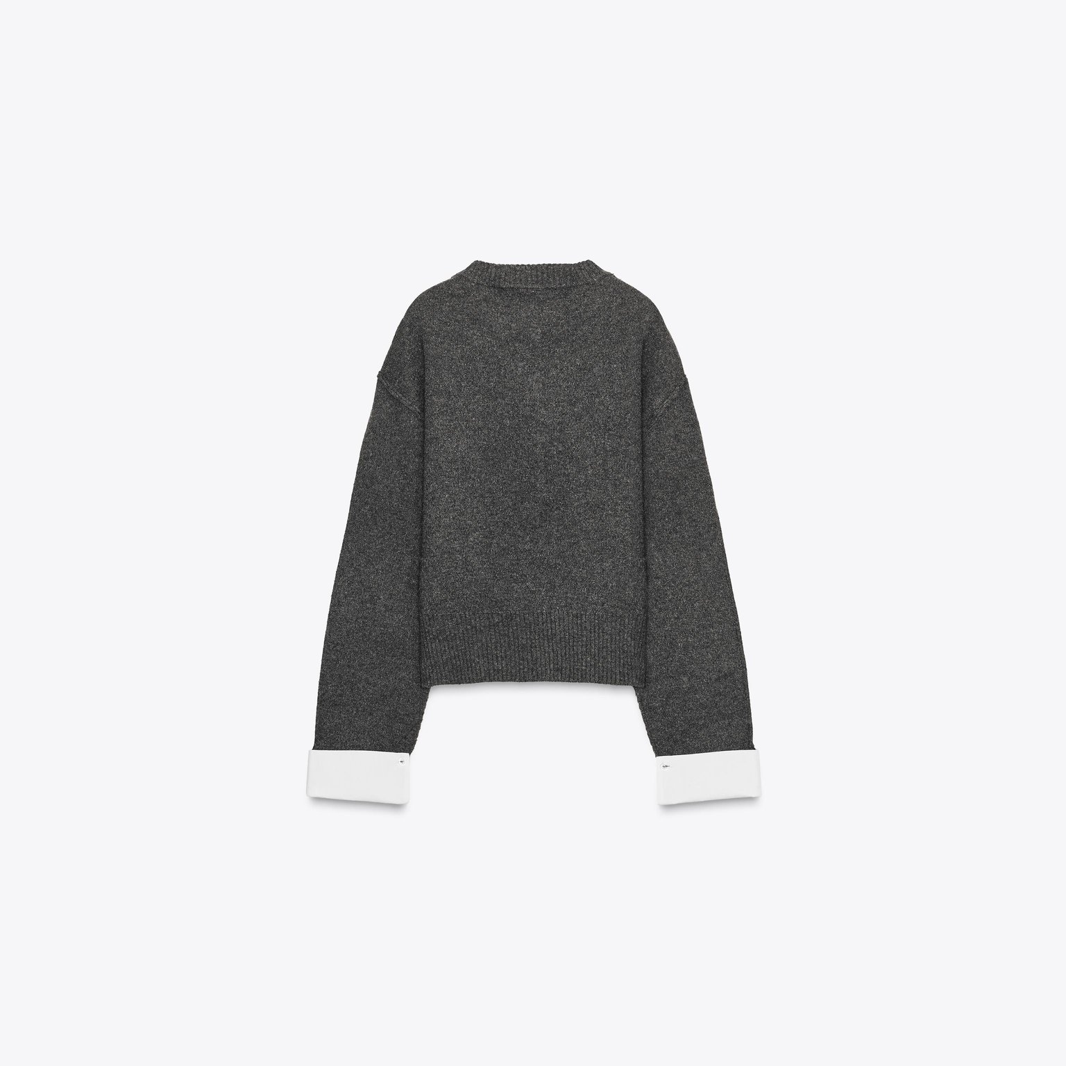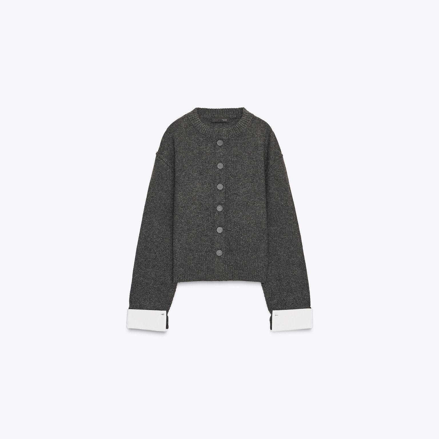 - التصميم: كارديغان محبوك بخليط خامات (Combined Cardigan)