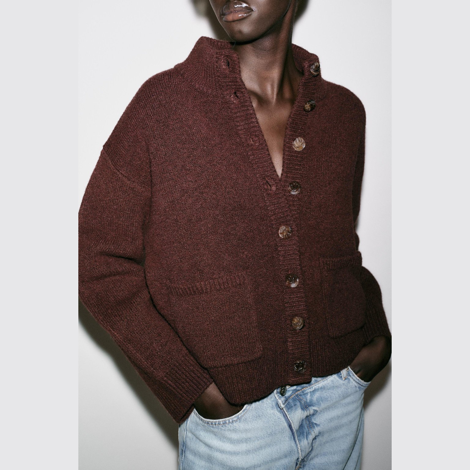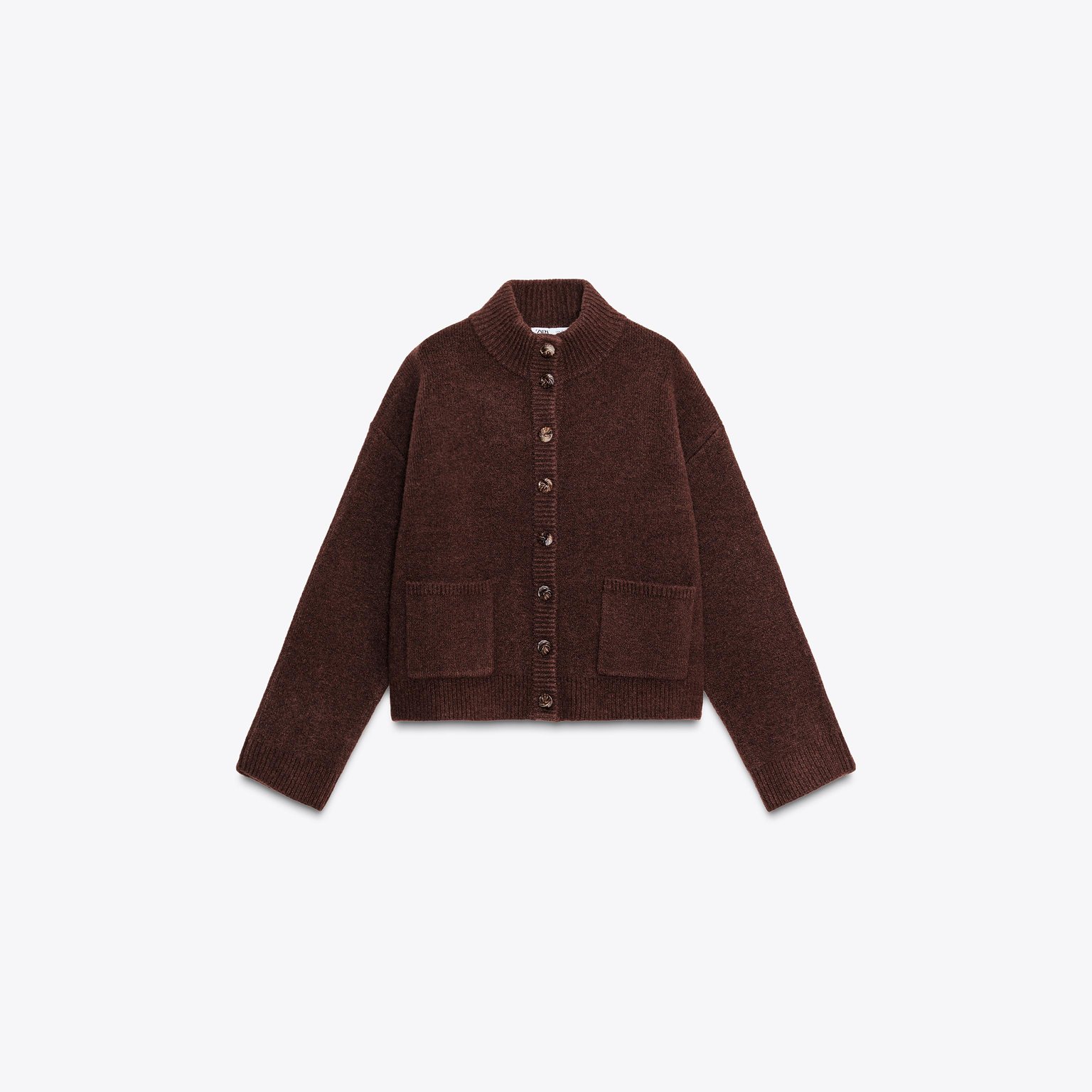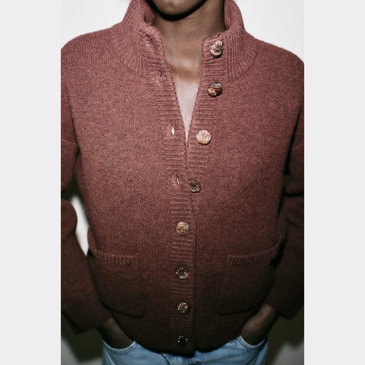 جاكيت بومبر محبوك بياقة عالية – لون طبيعي (بني) – Brown (High Neck Knit Bomber Jacket) جاكيت بومبر أنيق بلون بني طبيعي، مصنوع من خامة محبوكة عملية بخليط ألياف تمنح دفئًا وملمسًا ناعمًا، مع تصميم مزود بياقة عالية وأكمام طويلة. يتميز بجيوب أمامية عملية وأزرار للإغلاق، مما يمنح لمسة كلاسيكية عصرية. قطعة مثالية للتنسيقات اليومية الكاجوال الأنيقة أو كطبقة إضافية في المواسم الانتقالية.