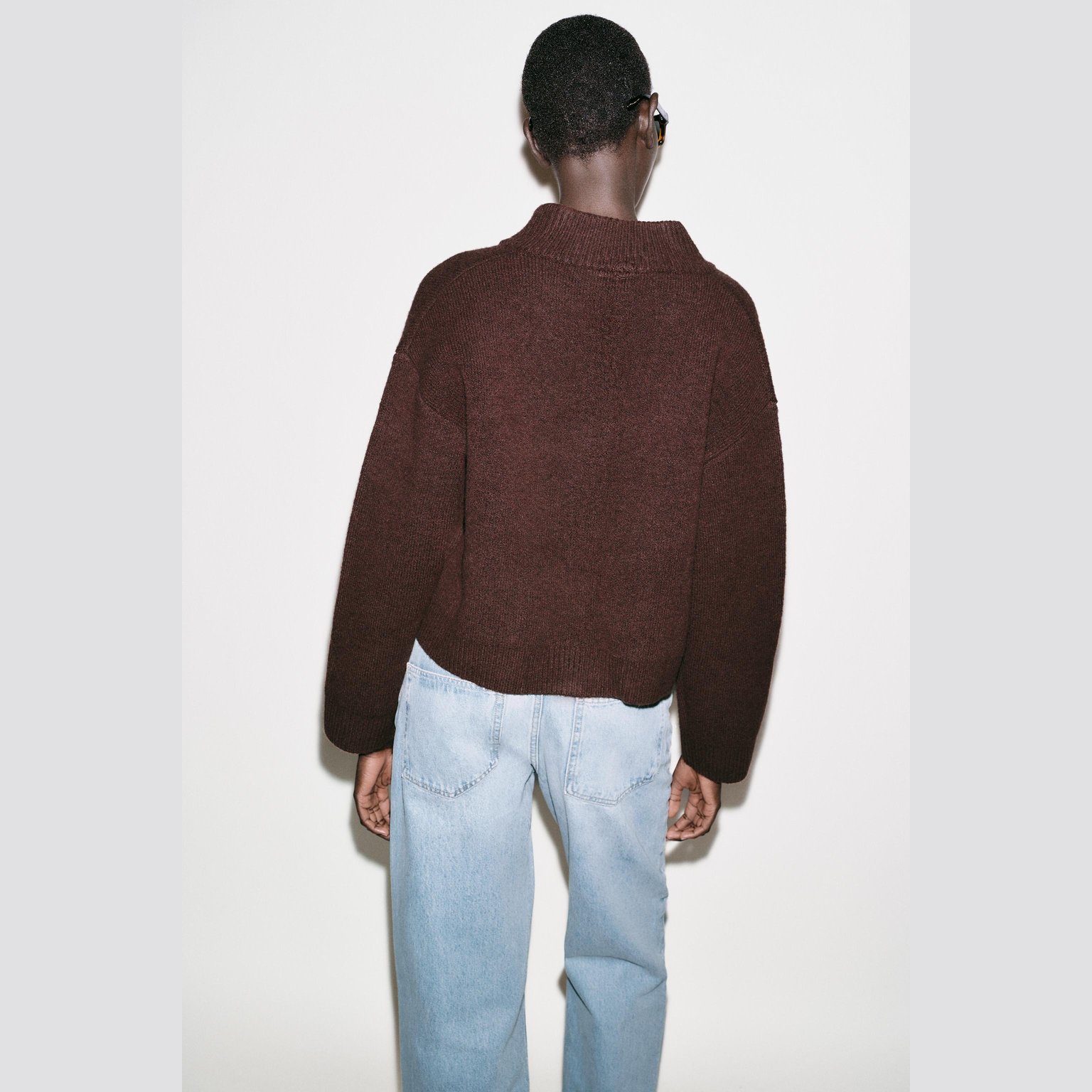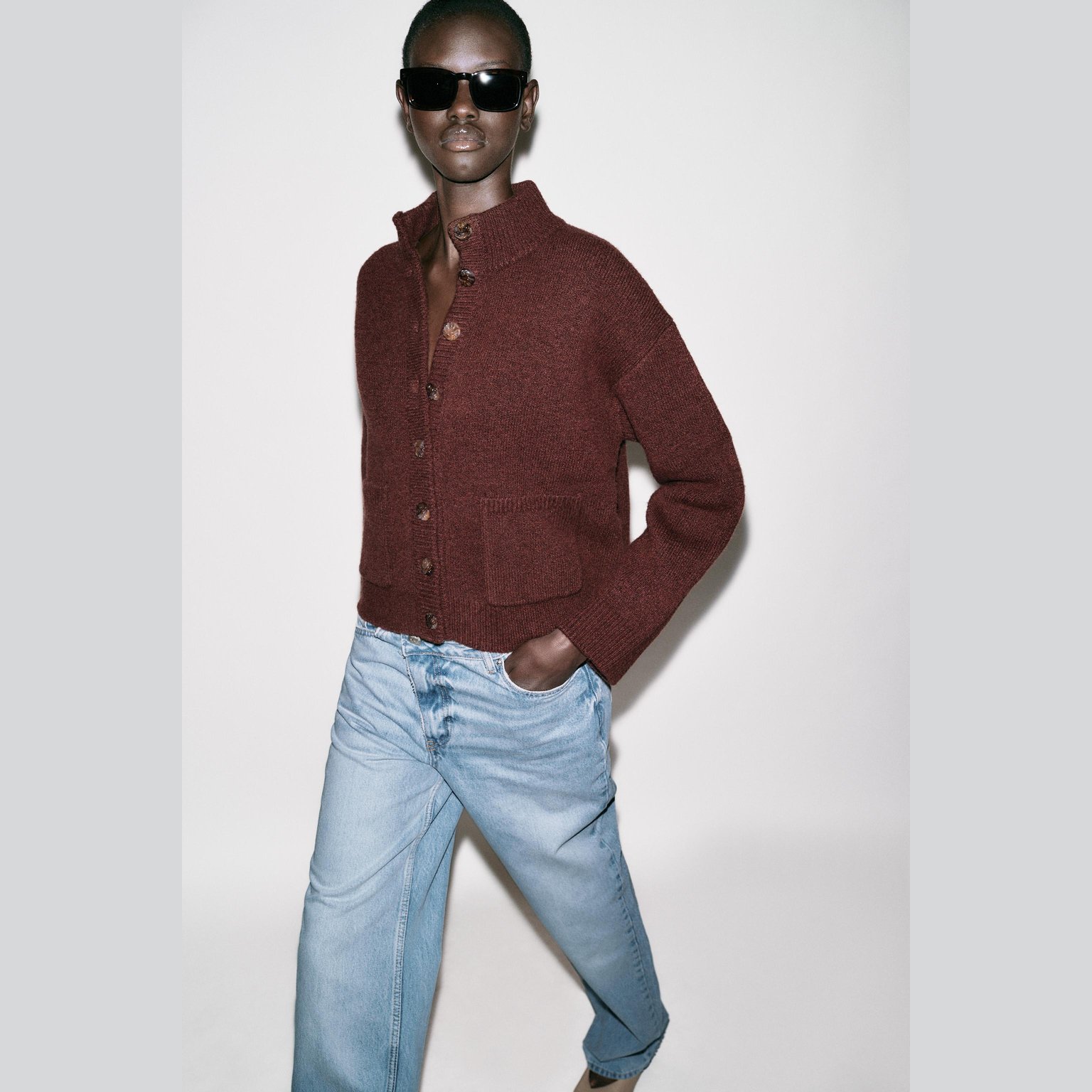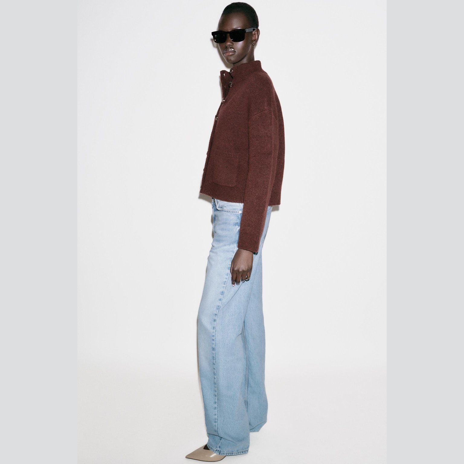 جاكيت بومبر محبوك بياقة عالية – لون طبيعي (بني) – Brown (High Neck Knit Bomber Jacket) جاكيت بومبر أنيق بلون بني طبيعي، مصنوع من خامة محبوكة عملية بخليط ألياف تمنح دفئًا وملمسًا ناعمًا، مع تصميم مزود بياقة عالية وأكمام طويلة. يتميز بجيوب أمامية عملية وأزرار للإغلاق، مما يمنح لمسة كلاسيكية عصرية. قطعة مثالية للتنسيقات اليومية الكاجوال الأنيقة أو كطبقة إضافية في المواسم الانتقالية.