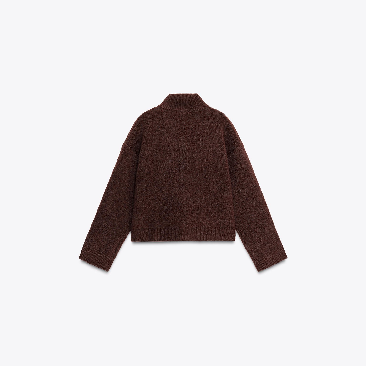 - التصميم: جاكيت بومبر محبوك بياقة عالية (High Neck Knit Bomber Jacket)