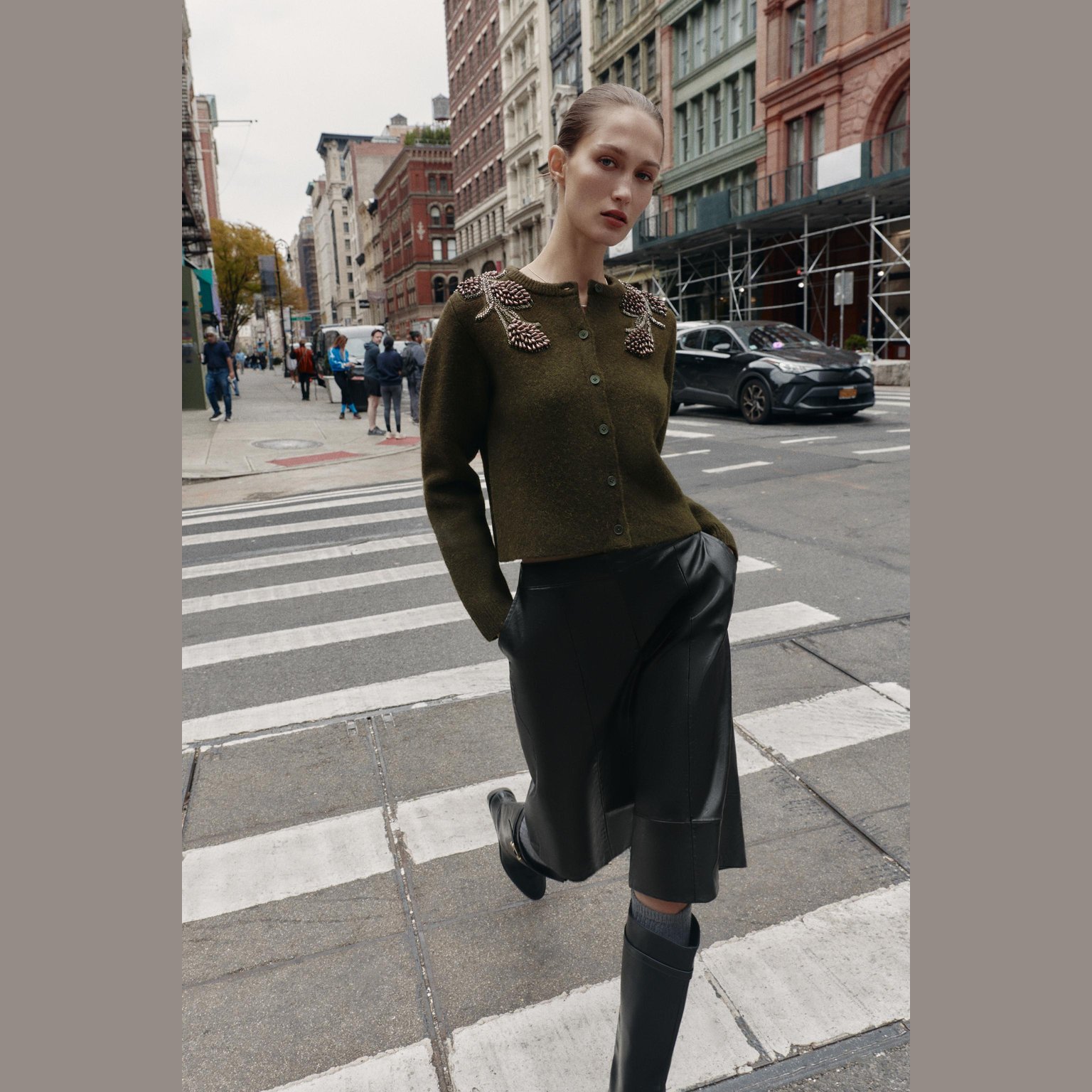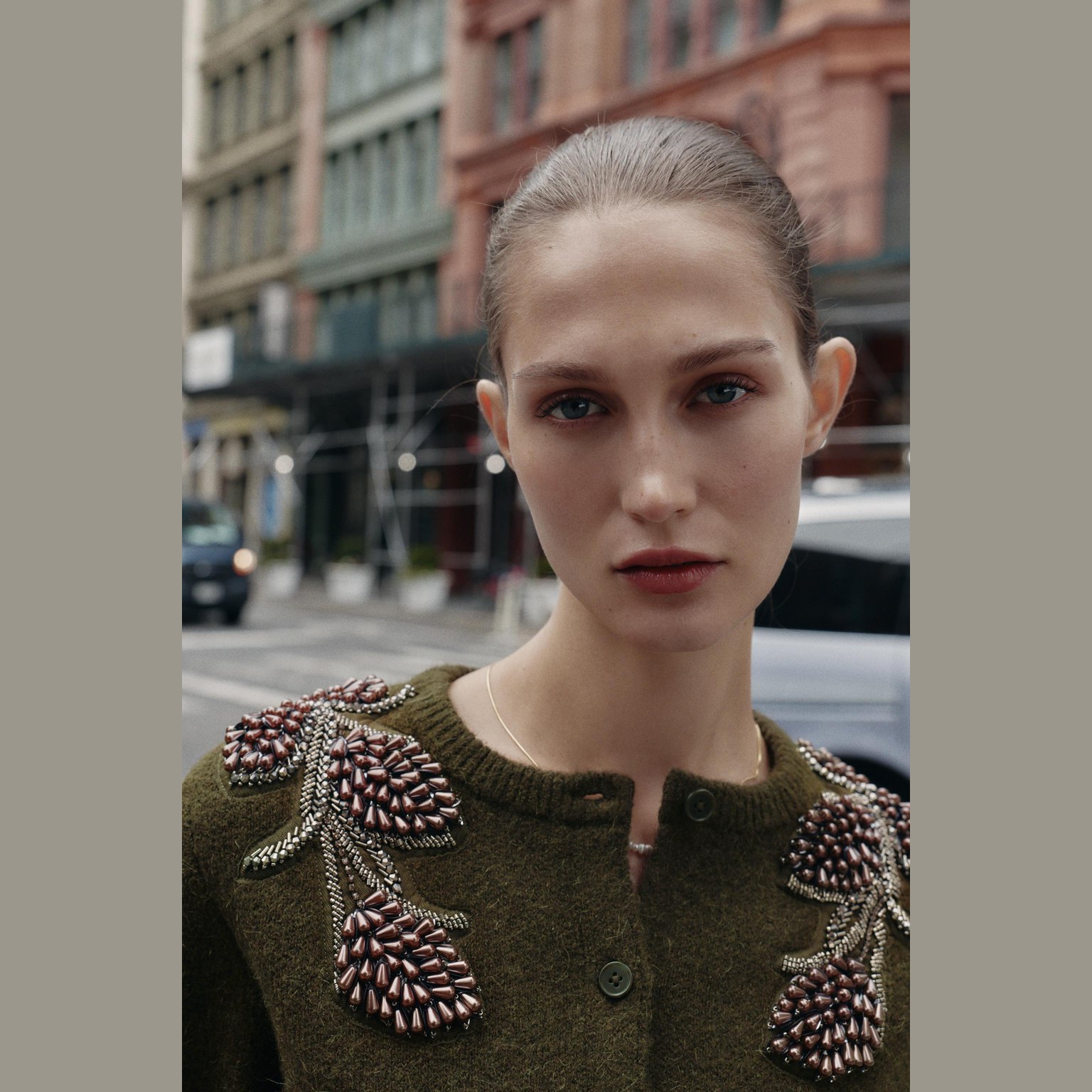- التصميم: كارديغان محبوك مزين بخرز (Cardigan with Beads)