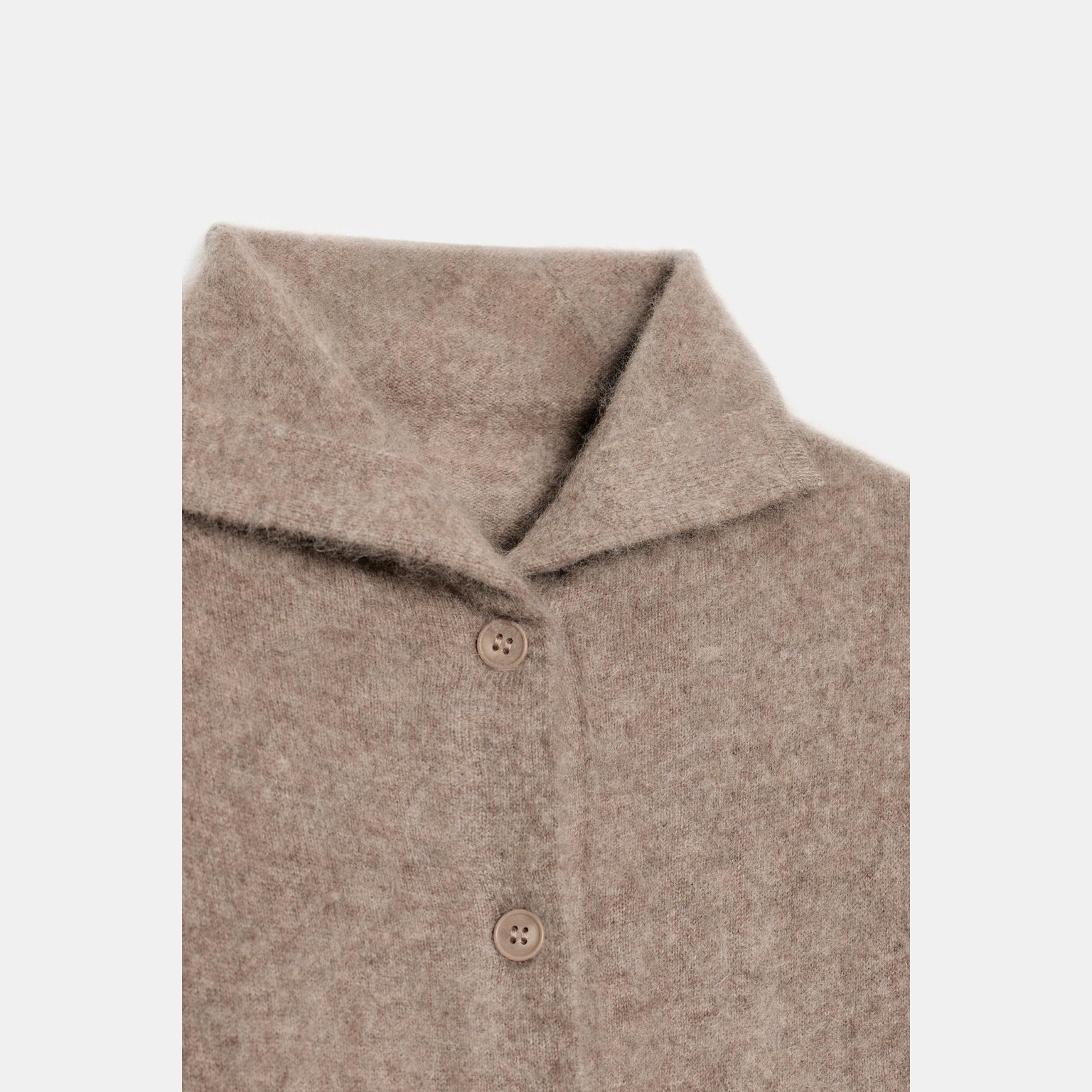 كارديغان محبوك من الصوف الخالص بياقة عالية – لون طبيعي (بني/تاوب) – Brown/Taupe (100% Wool High Neck Cardigan) كارديغان أنيق بلون بني تاوب طبيعي، مصنوع بالكامل من الصوف الخالص ليمنح دفئًا وملمسًا فاخرًا، مع تصميم مزود بياقة عالية وأكمام طويلة. يتميز بتفاصيل قماش مصقول تمنح لمسة عصرية أنيقة، مع أزرار أمامية للإغلاق. قطعة مثالية للتنسيقات اليومية الكاجوال الأنيقة أو كطبقة إضافية في المواسم الباردة.