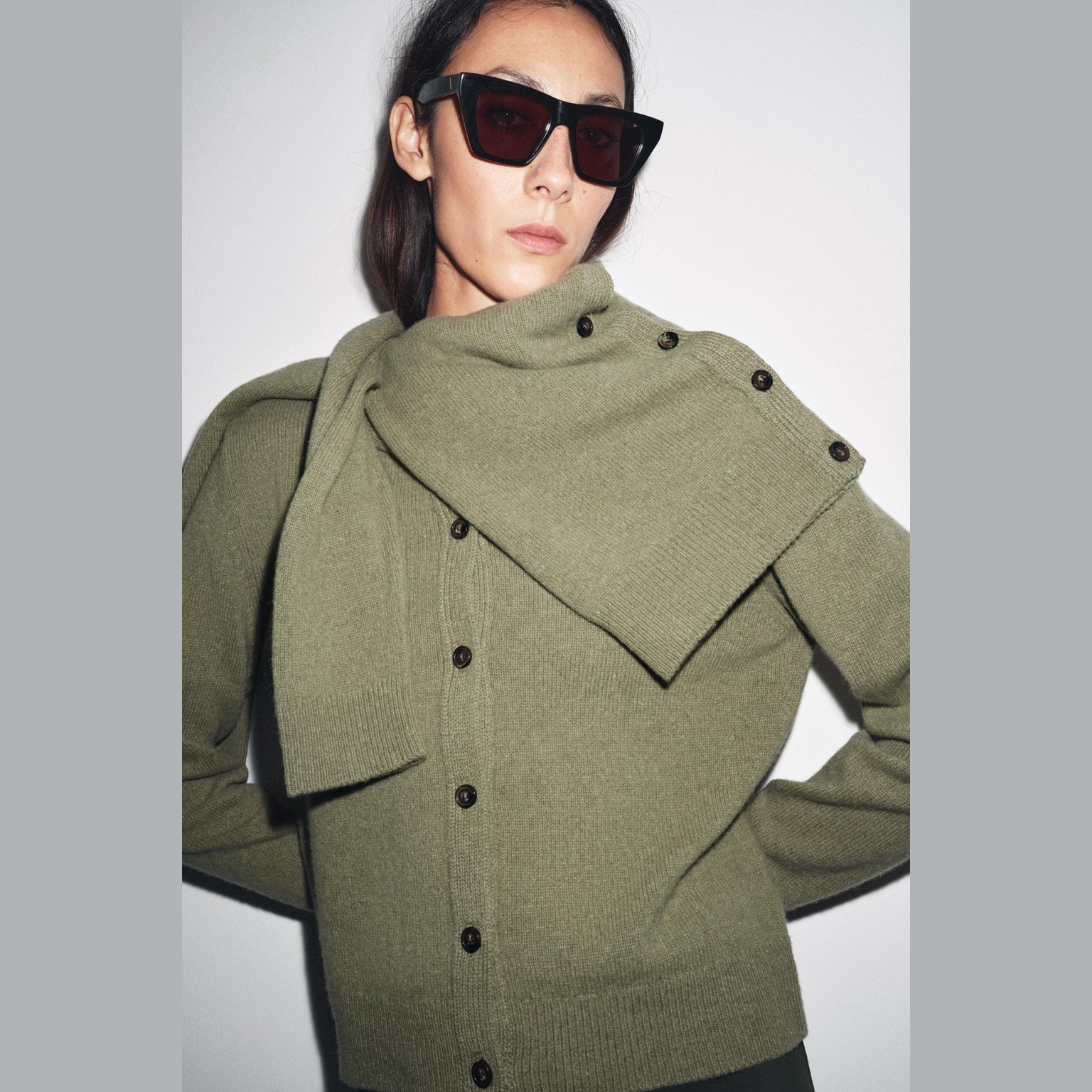 - التصميم: كارديغان محبوك من الكشمير والصوف بأكمام طويلة (Cashmere & Wool Long Sleeve Cardigan)