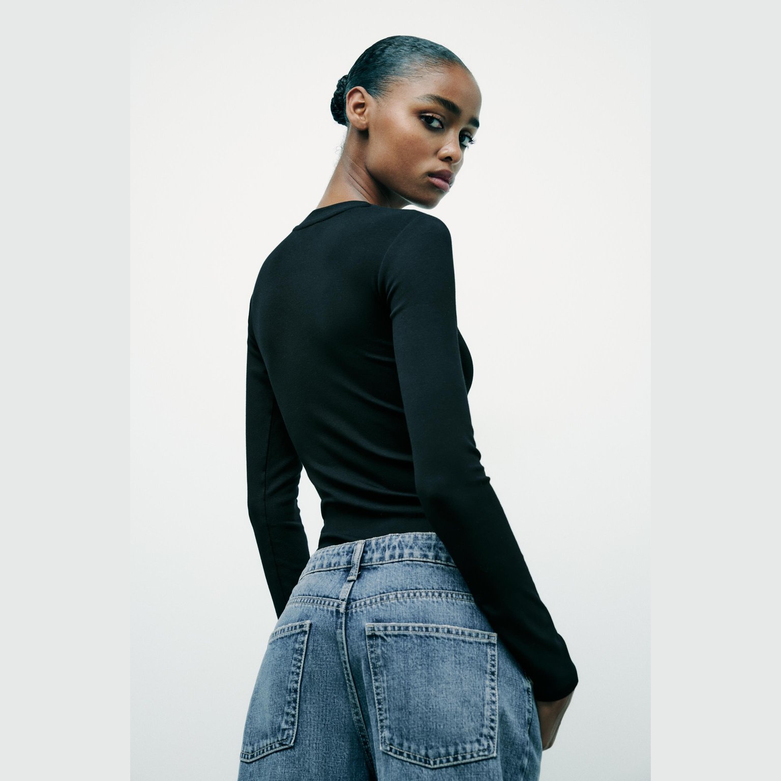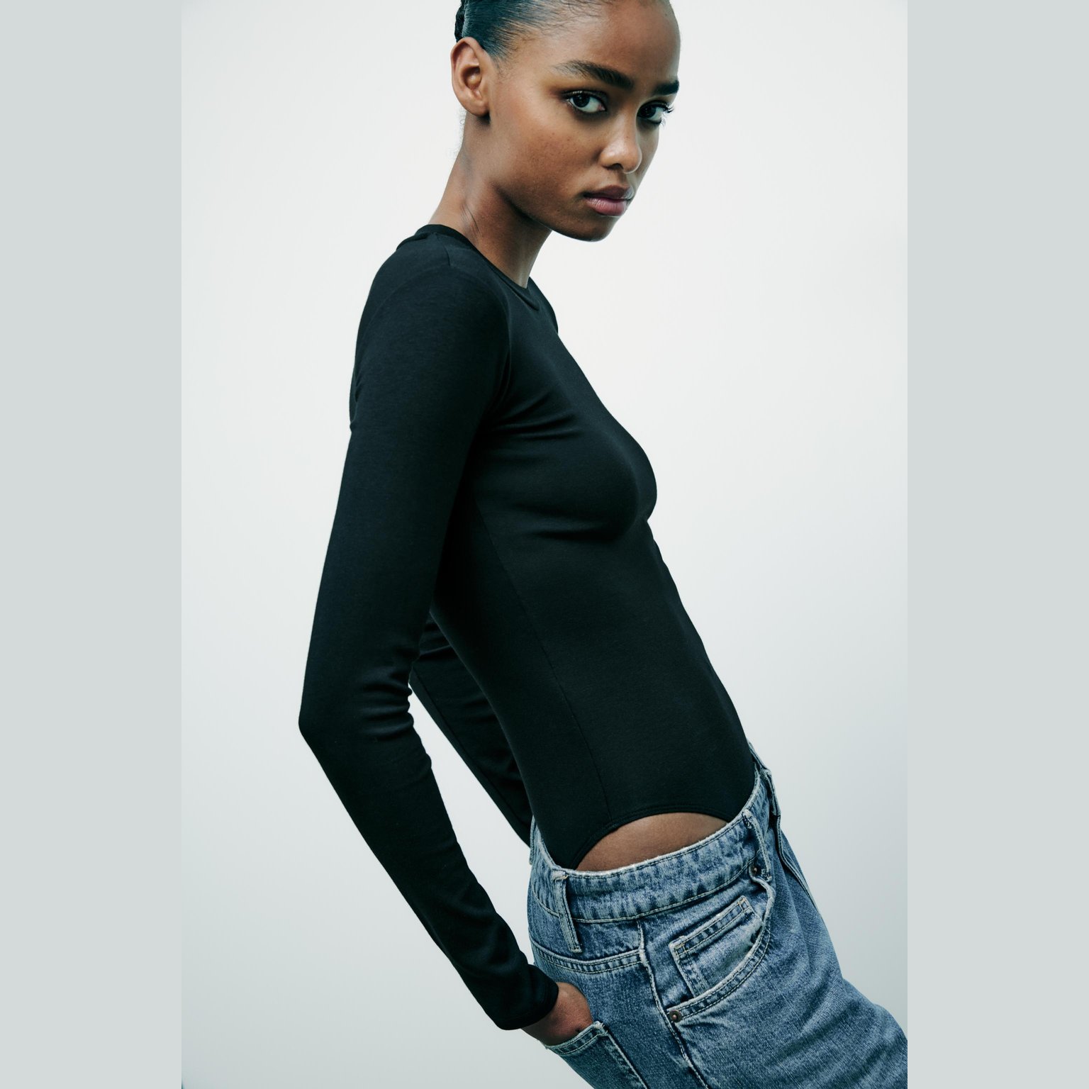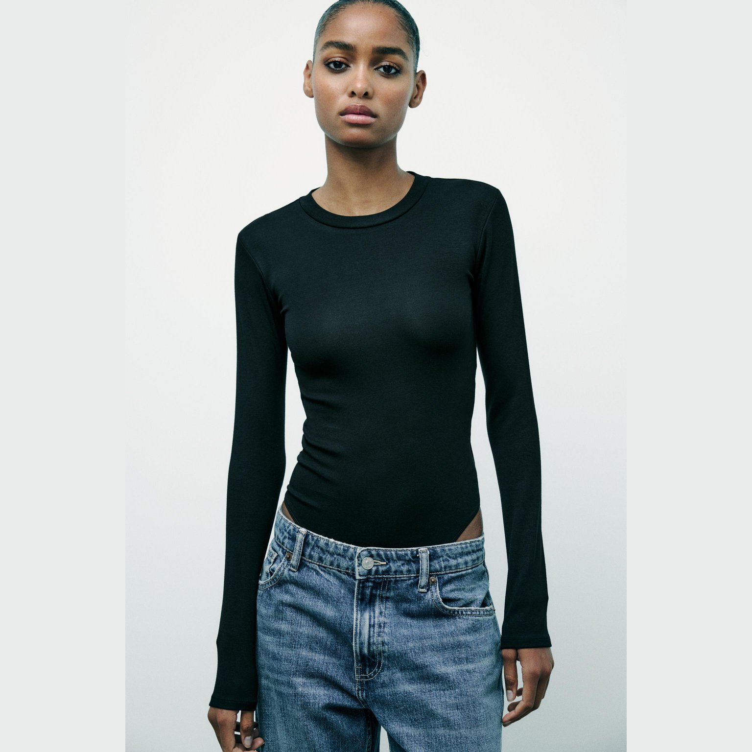 بادي محبوك من القطن والمودال – لون طبيعي (أسود) – Black (Cotton Modal Bodysuit) بادي أنيق بلون أسود طبيعي، مصنوع من خليط القطن والمودال مع نسبة إيلاستان تمنح مرونة وملمسًا ناعمًا، بتصميم مزود بياقة مستديرة وأكمام طويلة. يتميز بإغلاق سفلي بأزرار كبس لراحة عملية في الارتداء. قطعة أساسية مثالية للتنسيقات اليومية الكاجوال الأنيقة أو كطبقة داخلية في المواسم الانتقالية.