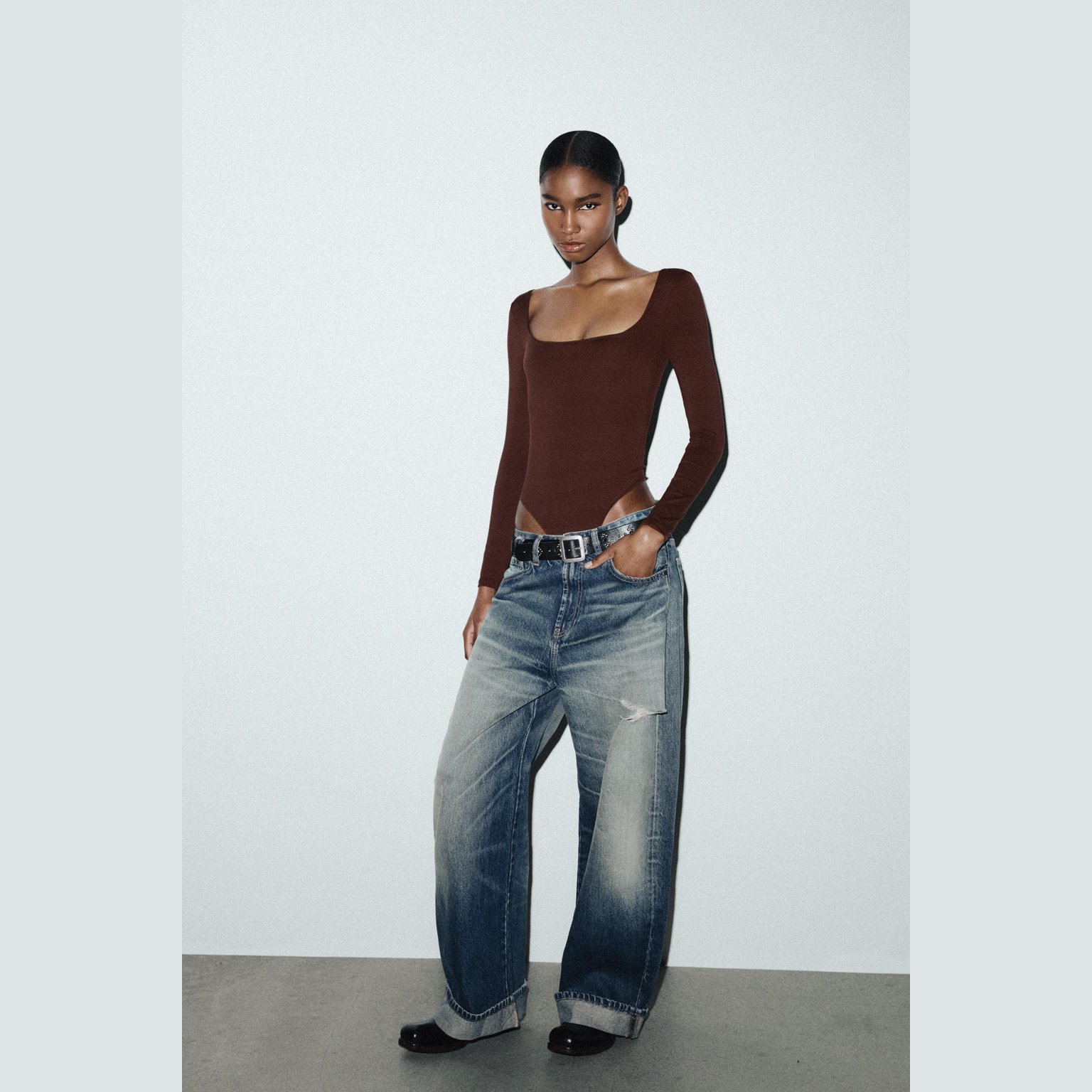 بادي محبوك بياقة مربعة – لون طبيعي (بني شوكولاته) – Chocolate (Square Neck Polyamide Bodysuit) بادي أنيق بلون بني شوكولاته طبيعي، مصنوع من خامة محبوكة بخليط بولي أميد وإيلاستان يمنح مرونة وملمسًا ناعمًا، بتصميم مزود بياقة مربعة وأكمام طويلة. يتميز بقصة ضيقة تمنح إطلالة أنثوية عصرية، مع إغلاق سفلي عملي. قطعة أساسية مثالية للتنسيقات اليومية الكاجوال الأنيقة أو كطبقة داخلية في المواسم الانتقالية.