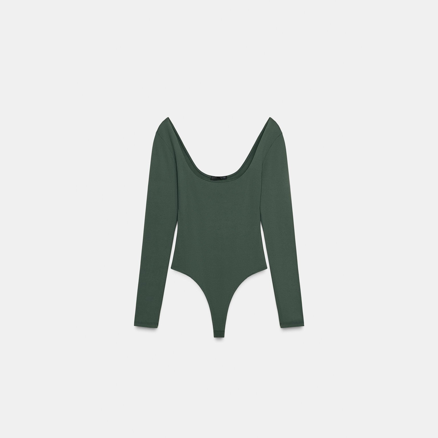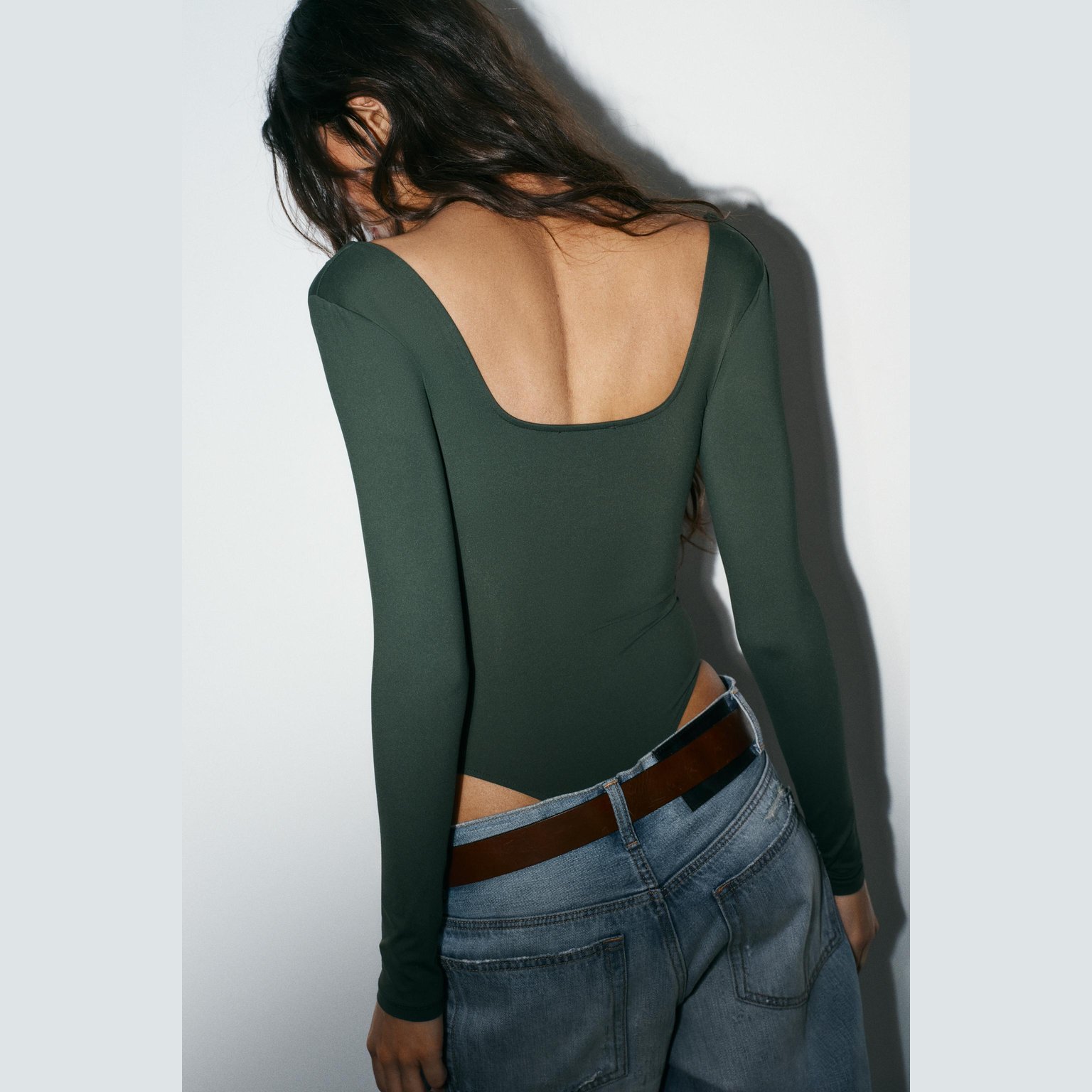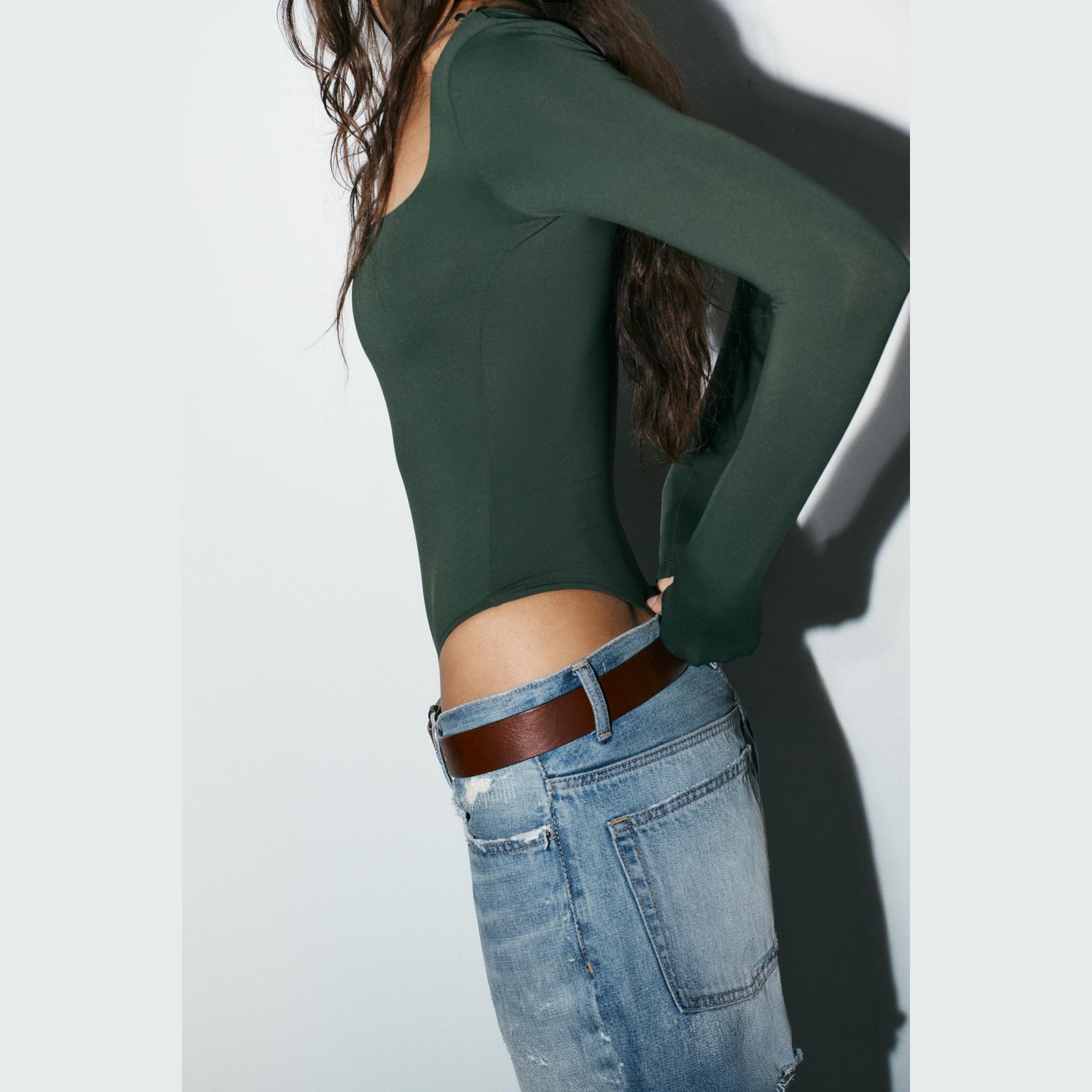 بادي محبوك بياقة مربعة – لون طبيعي (أخضر متوسط) – Mid-Green (Square Neck Polyamide Bodysuit) بادي أنيق بلون أخضر متوسط طبيعي، مصنوع من خامة محبوكة بخليط بولي أميد وإيلاستان يمنح مرونة وملمسًا ناعمًا، بتصميم مزود بياقة مربعة وأكمام طويلة. يتميز بقصة ضيقة تمنح إطلالة أنثوية عصرية، مع إغلاق سفلي عملي. قطعة أساسية مثالية للتنسيقات اليومية الكاجوال الأنيقة أو كطبقة داخلية في المواسم الانتقالية.