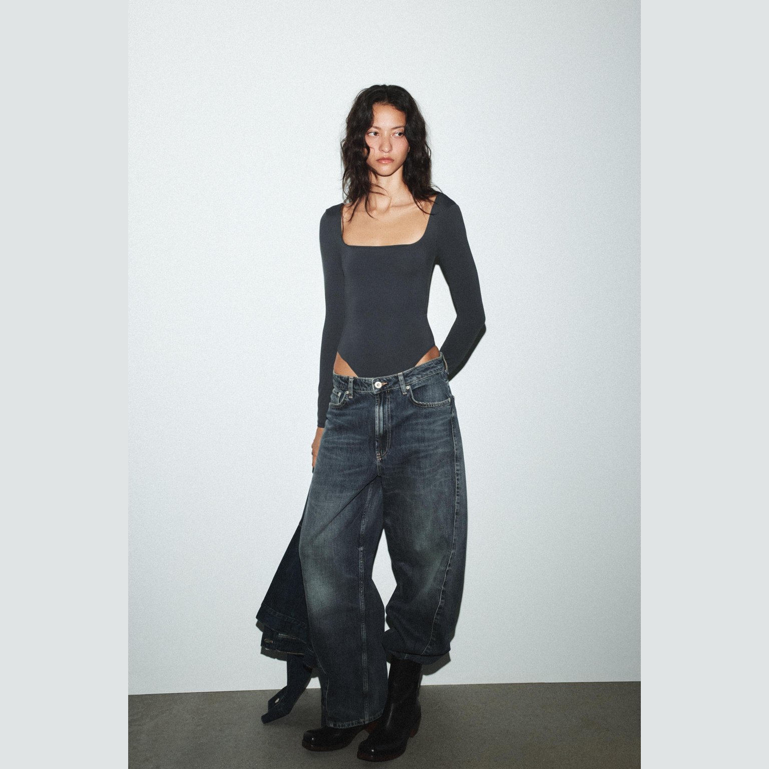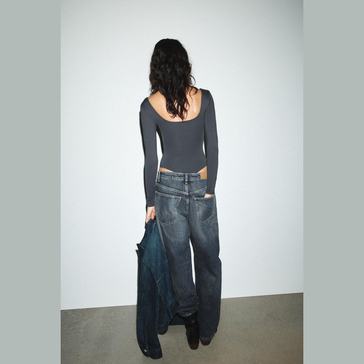 بادي محبوك بياقة مربعة – لون طبيعي (رمادي) – Grey (Square Neck Polyamide Bodysuit) بادي أنيق بلون رمادي طبيعي، مصنوع من خامة محبوكة بخليط بولي أميد وإيلاستان يمنح مرونة وملمسًا ناعمًا، بتصميم مزود بياقة مربعة وأكمام طويلة. يتميز بقصة ضيقة تمنح إطلالة أنثوية عصرية، مع إغلاق سفلي عملي. قطعة أساسية مثالية للتنسيقات اليومية الكاجوال الأنيقة أو كطبقة داخلية في المواسم الانتقالية.