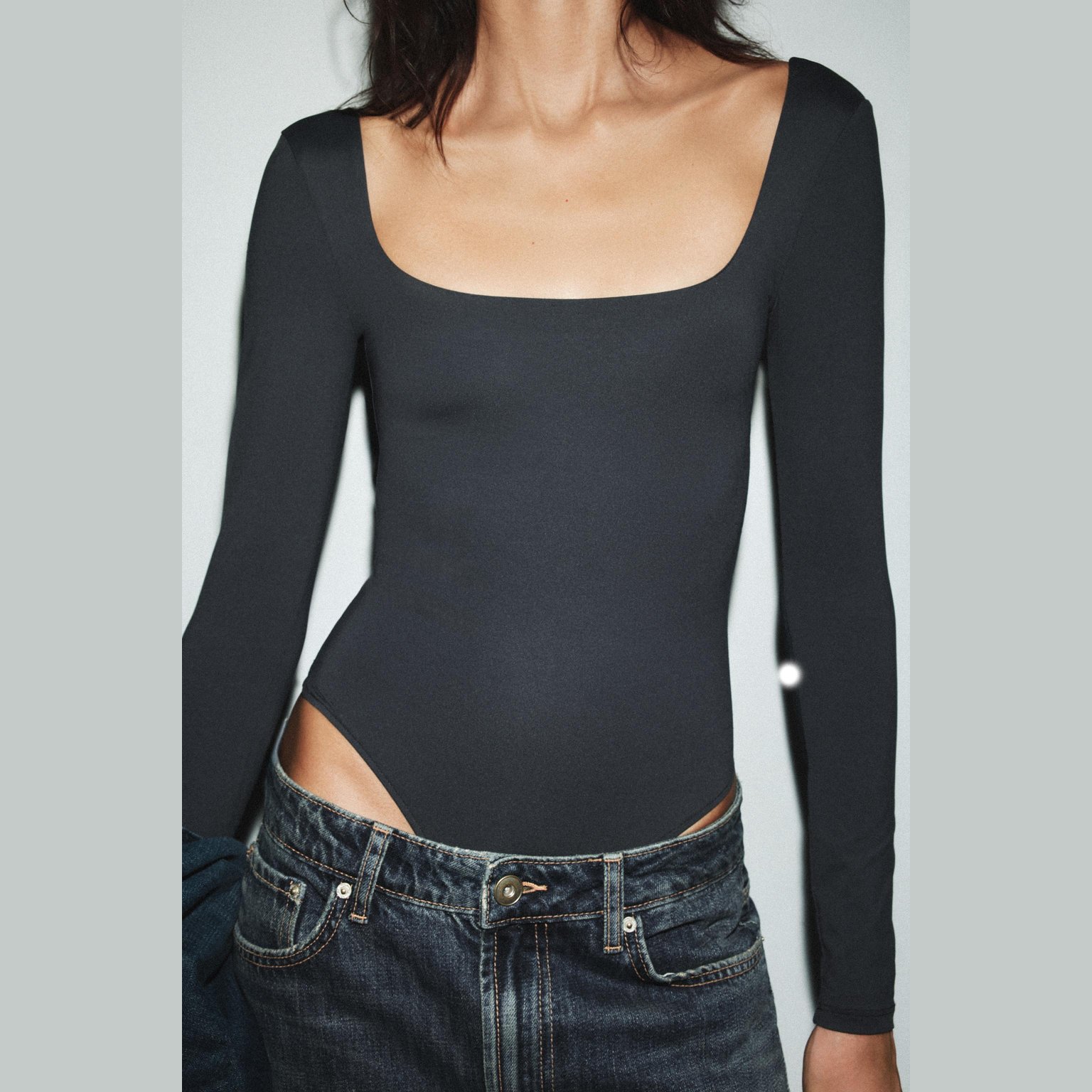 - التصميم: بادي محبوك بياقة مربعة (Square Neck Polyamide Bodysuit)