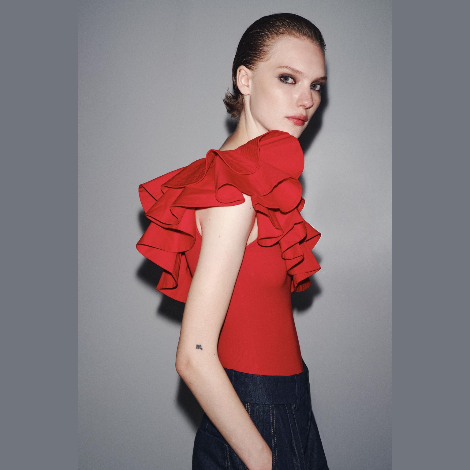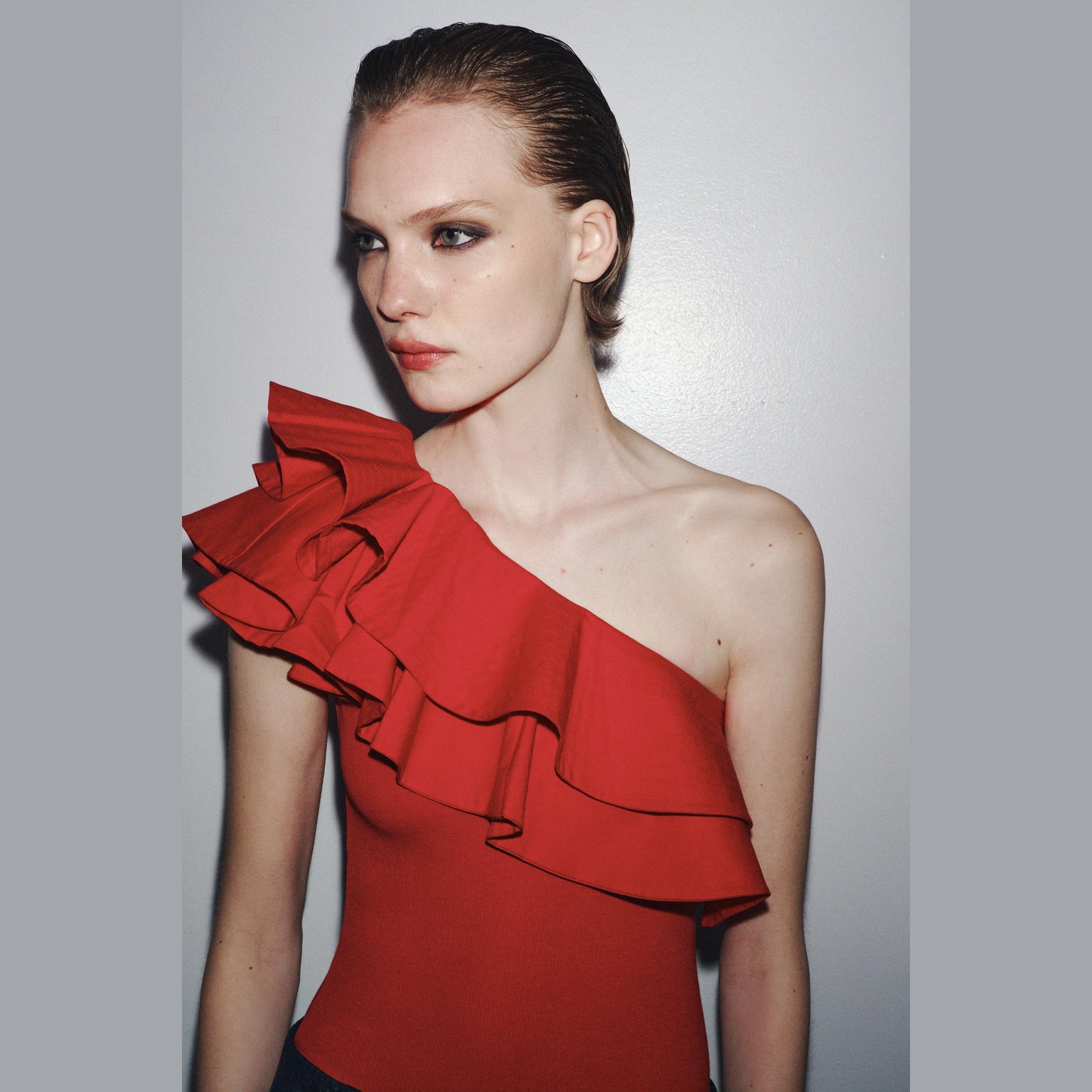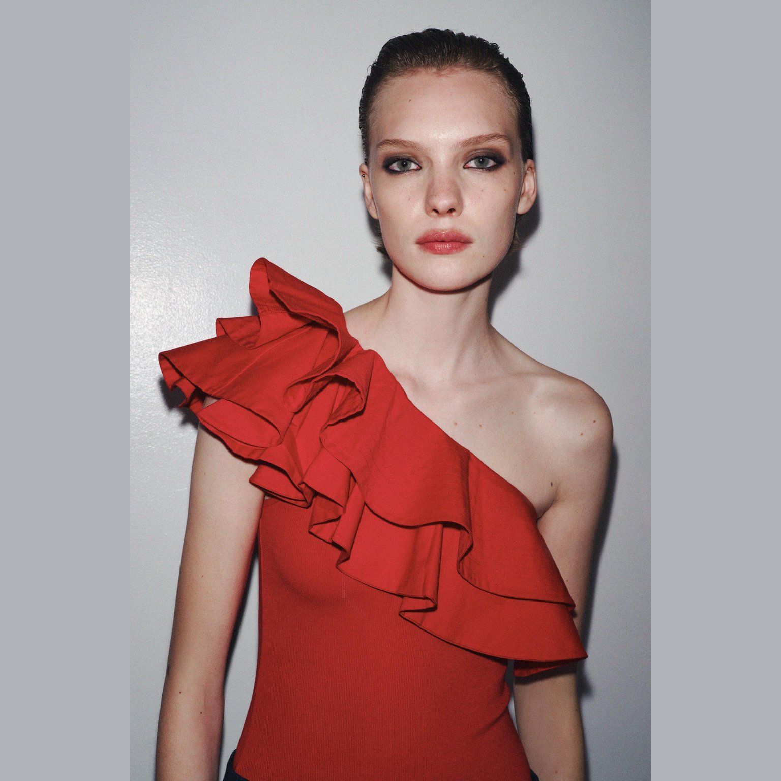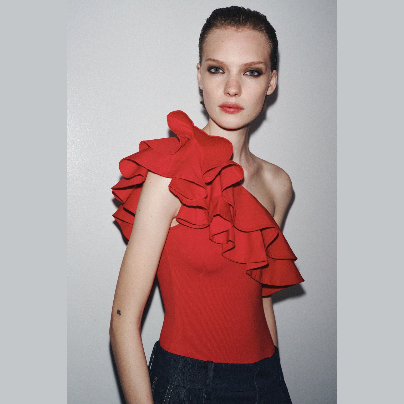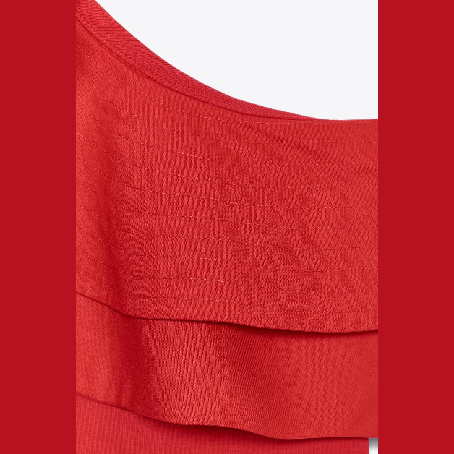 بادي محبوك بياقة غير متناظرة مع كشكش متباين – لون طبيعي (أحمر) – Red (Asymmetric Contrast Ruffle Bodysuit) بادي أنيق بلون أحمر طبيعي، مصنوع من خامة محبوكة عملية بخليط قطن وإيلاستان يمنح راحة ومرونة، بتصميم غير متناظر مع كشكش متباين يمنح لمسة عصرية أنثوية. يتميز بإغلاق سفلي بأزرار كبس لراحة عملية في الارتداء. قطعة مثالية للتنسيقات اليومية الكاجوال الأنيقة أو كطبقة أساسية في المناسبات المسائية.