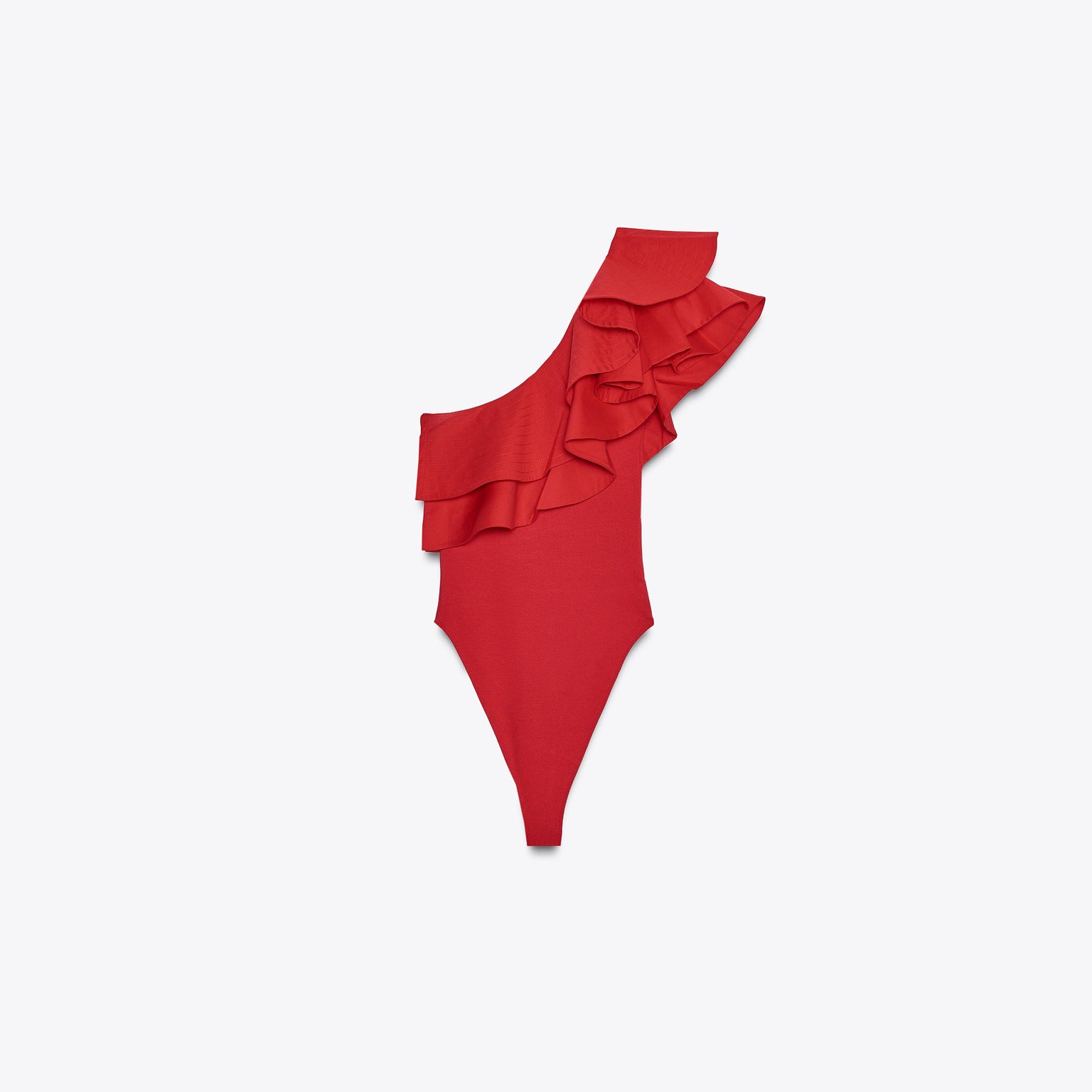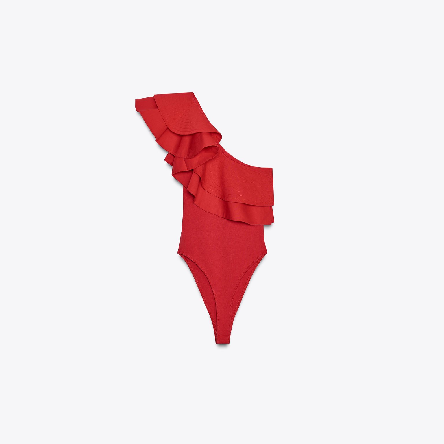 - التصميم: بادي محبوك بياقة غير متناظرة مع كشكش متباين (Asymmetric Contrast Ruffle Bodysuit)