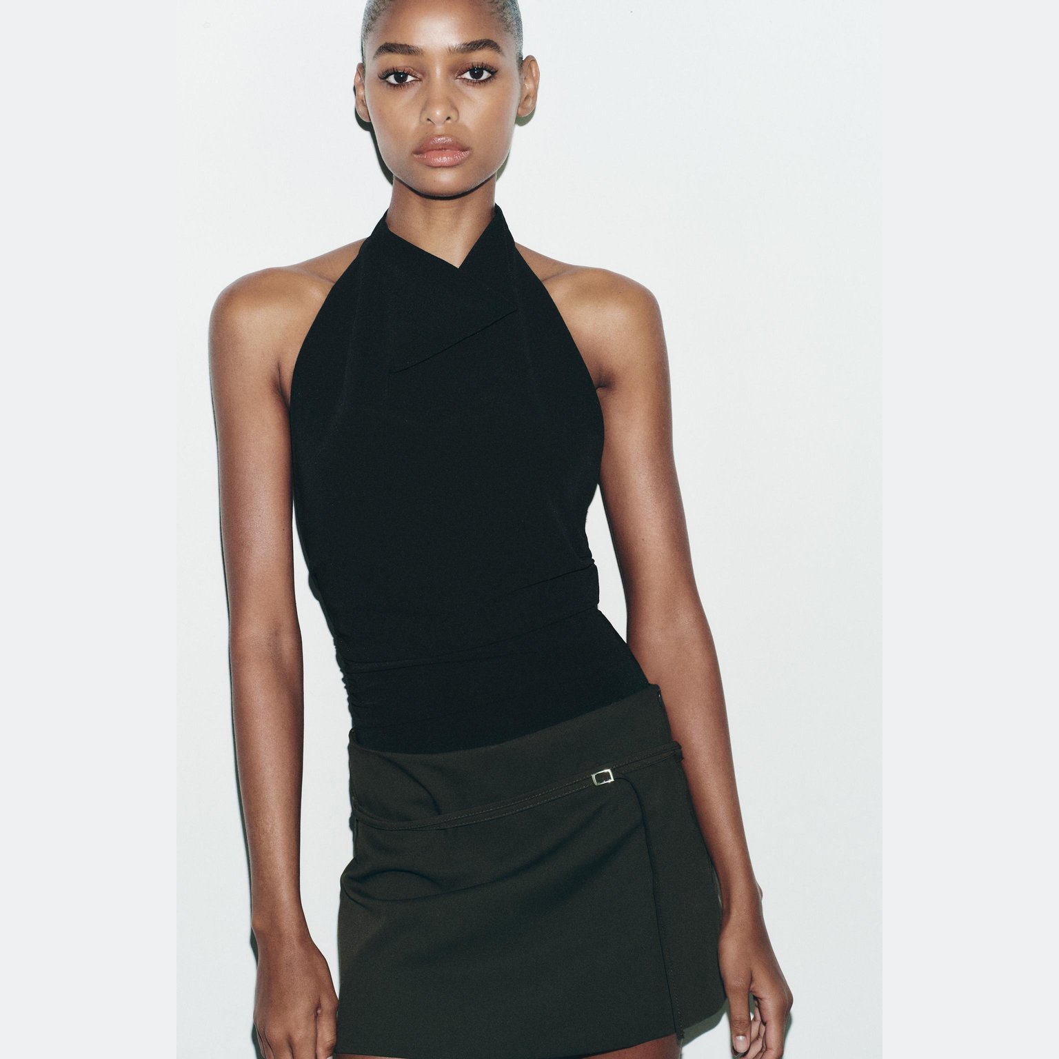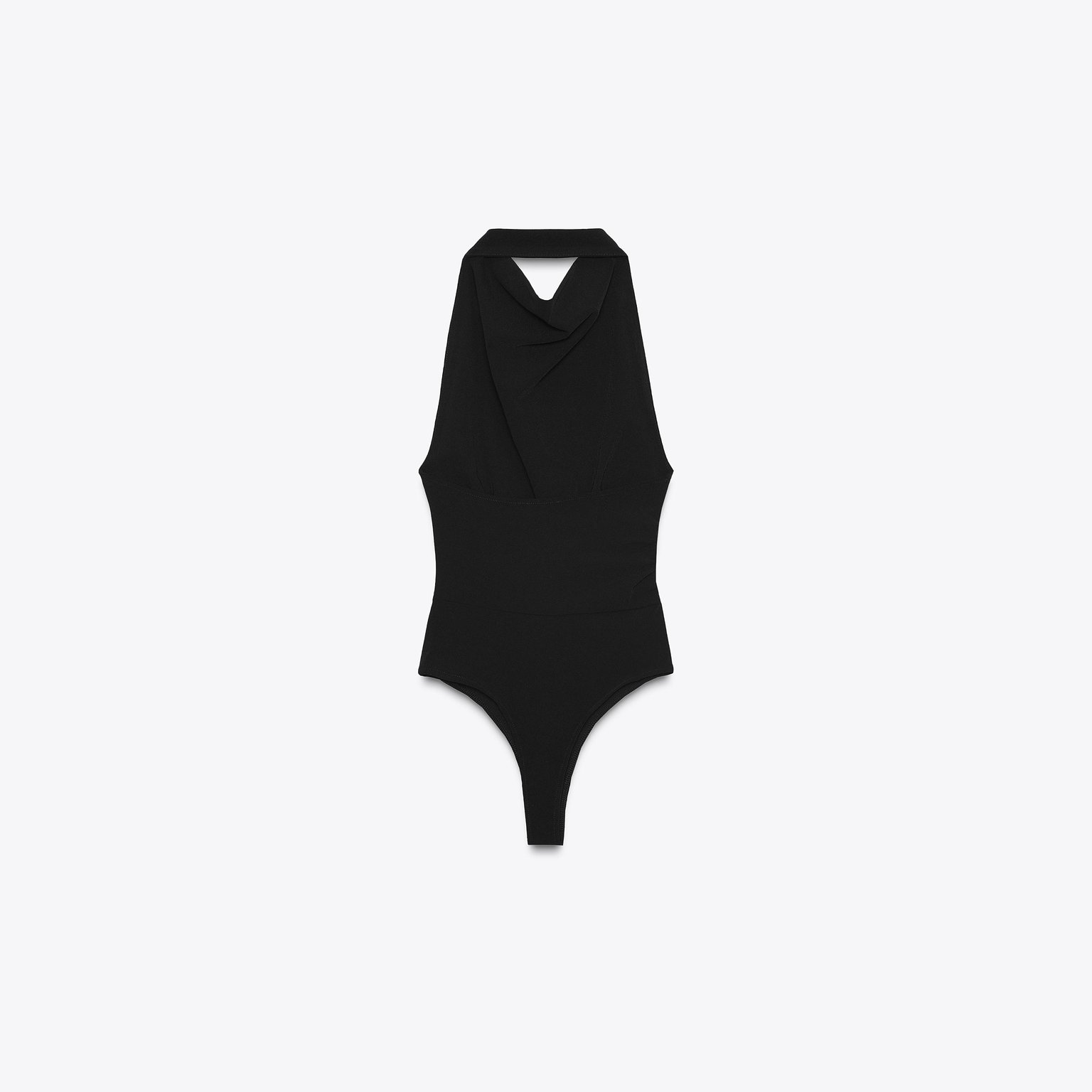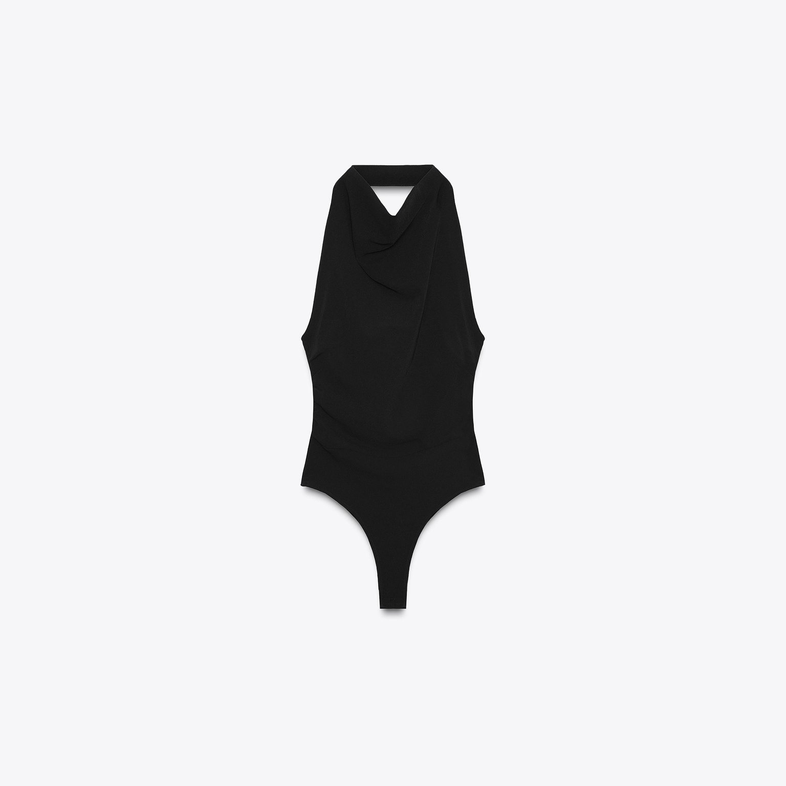 - التصميم: بادي محبوك بياقة هالتر مفتوحة الظهر (Open Back Halter Bodysuit)