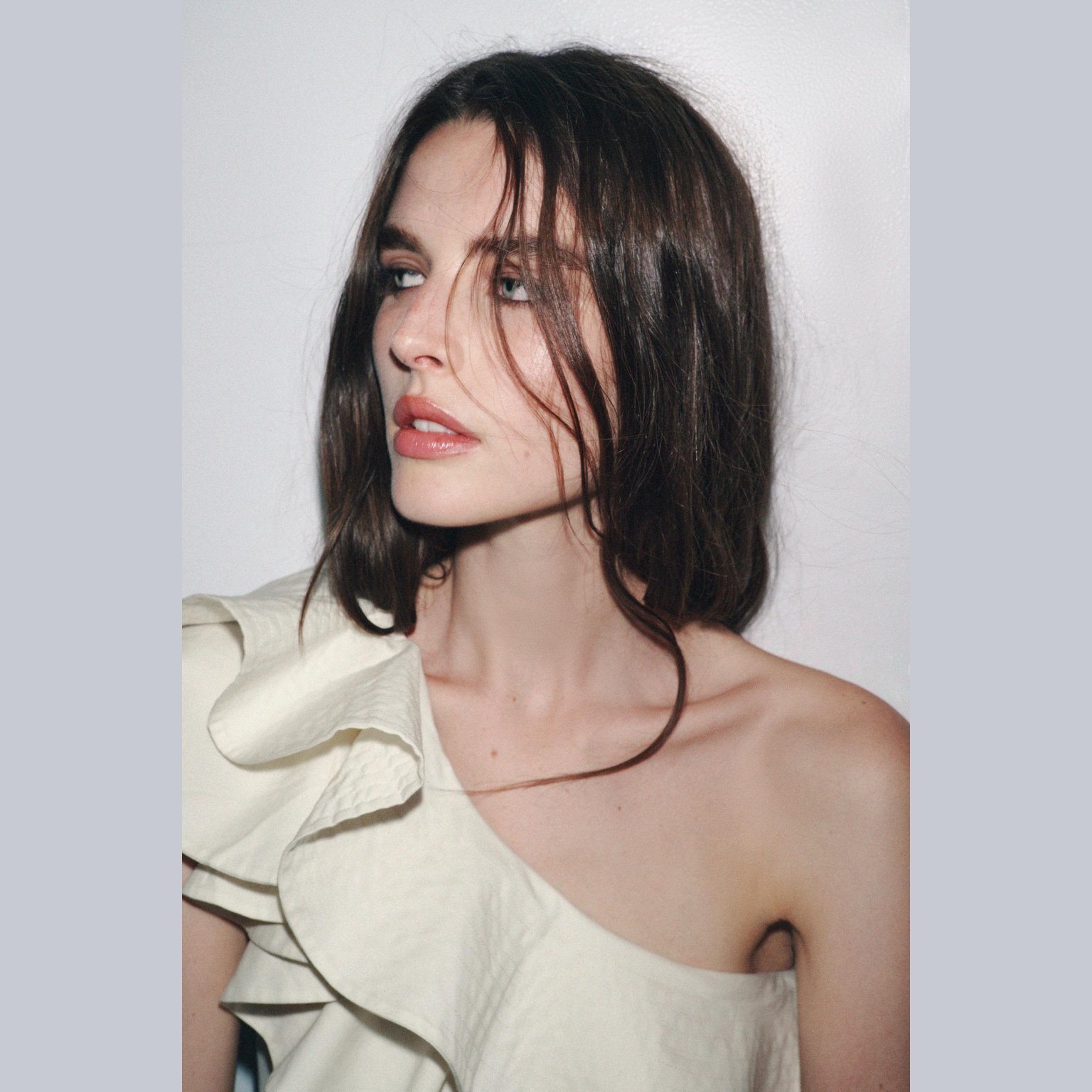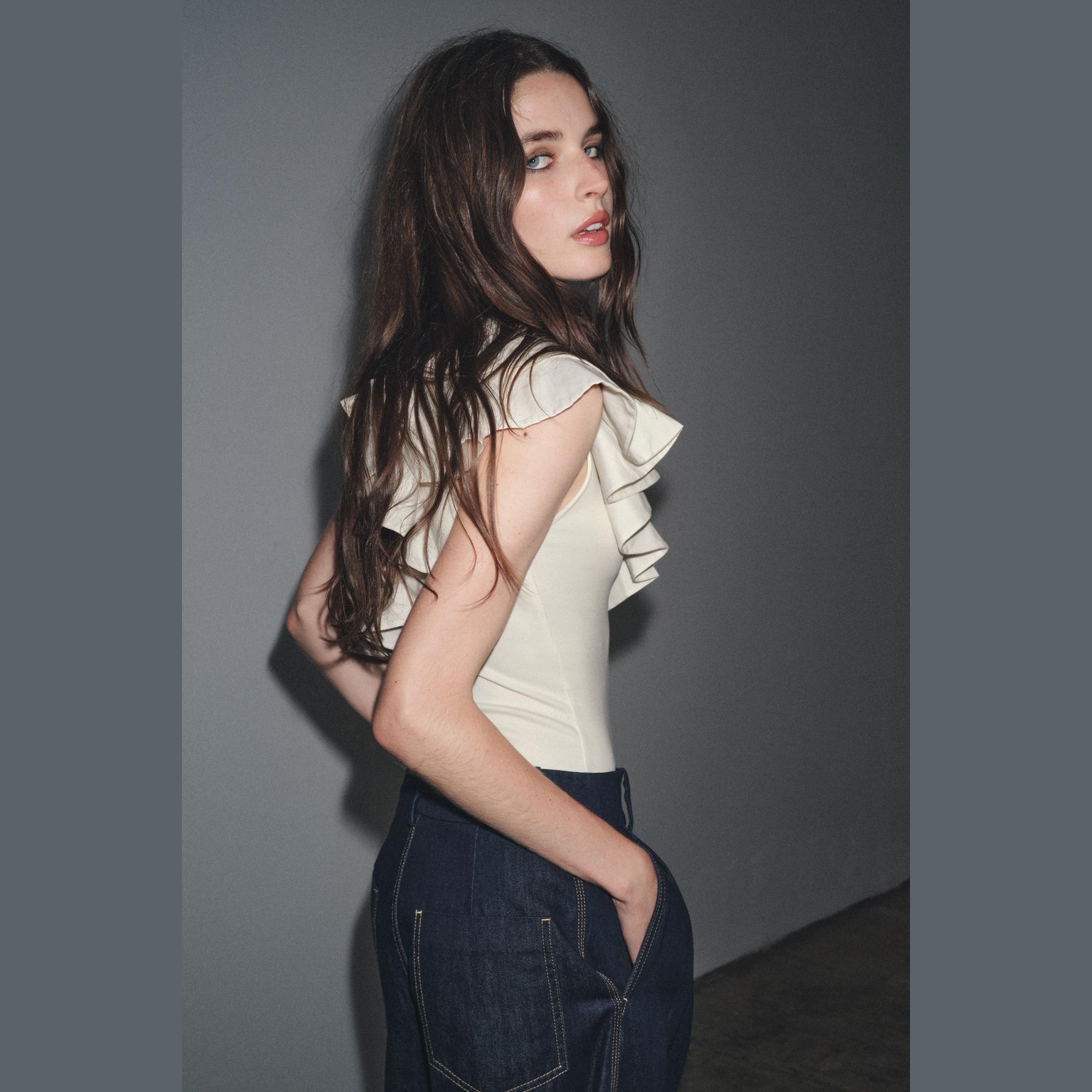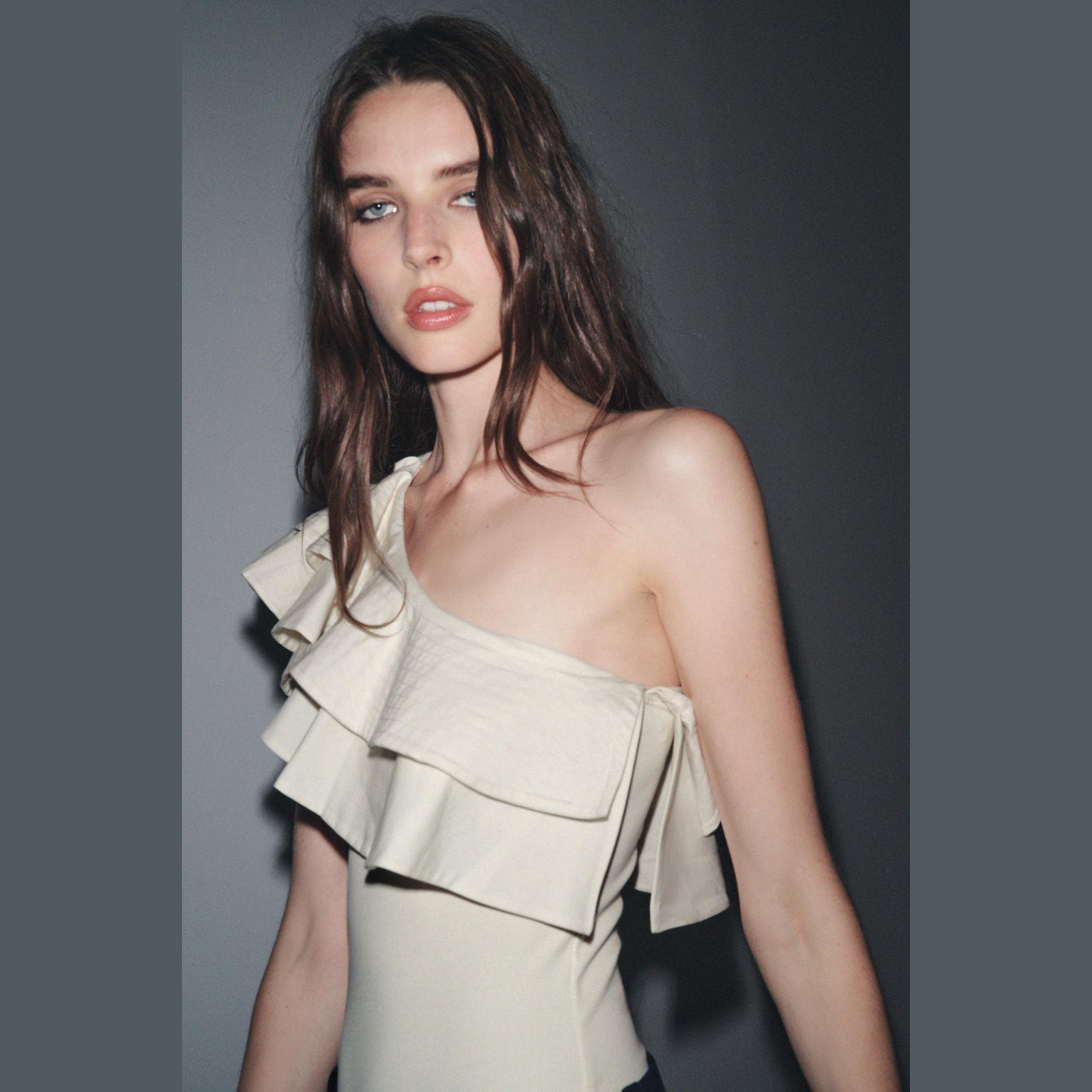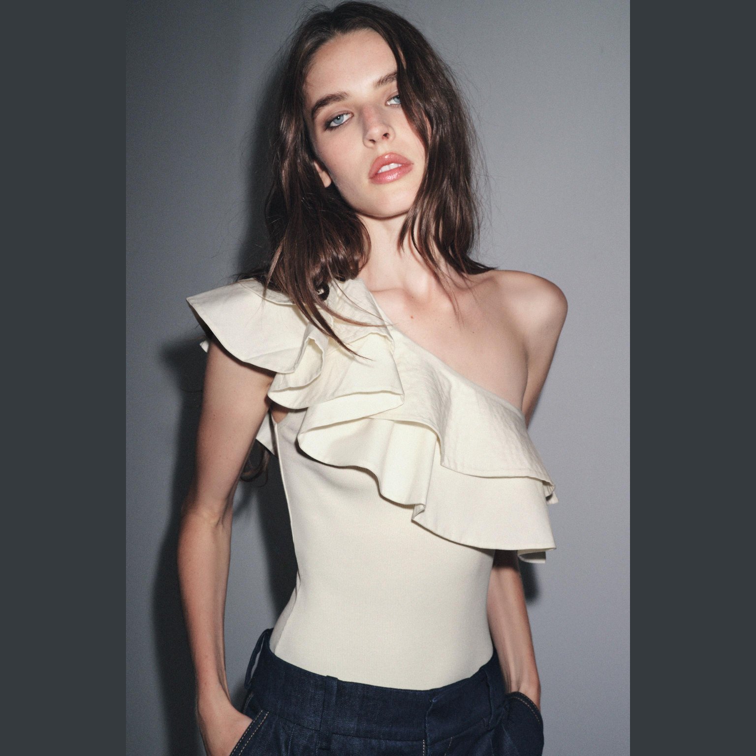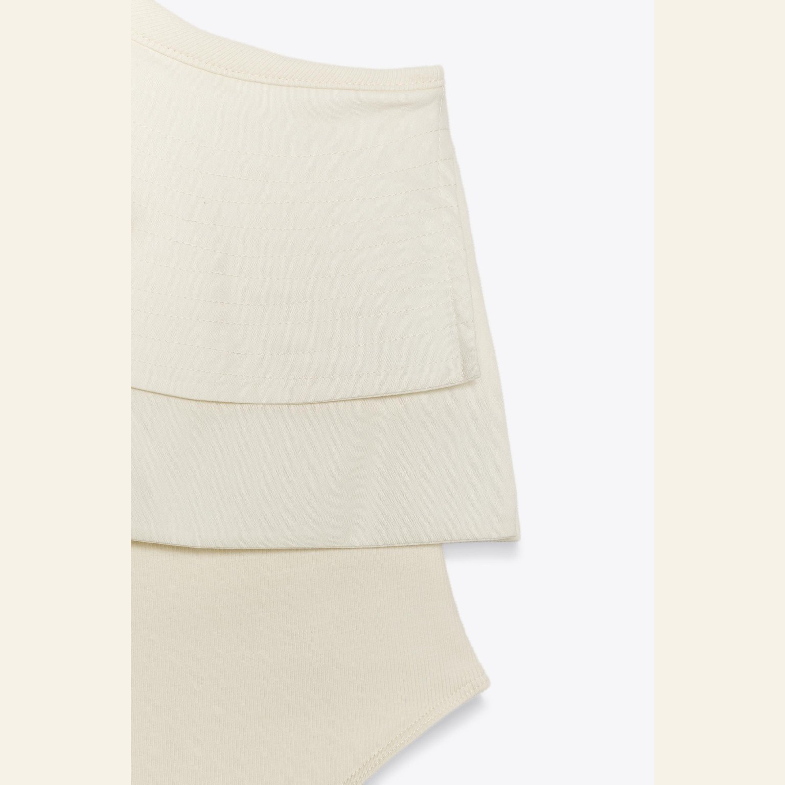 بادي محبوك بياقة غير متناظرة مع كشكش متباين – لون طبيعي (أوف وايت) – Ecru (Asymmetric Contrast Ruffle Bodysuit) بادي أنيق بلون أوف وايت طبيعي، مصنوع من خامة محبوكة عملية بخليط قطن وإيلاستان يمنح راحة ومرونة، بتصميم غير متناظر مع كشكش متباين يمنح لمسة عصرية أنثوية. يتميز بإغلاق سفلي بأزرار كبس لراحة عملية في الارتداء. قطعة مثالية للتنسيقات اليومية الكاجوال الأنيقة أو كطبقة أساسية في المناسبات المسائية.