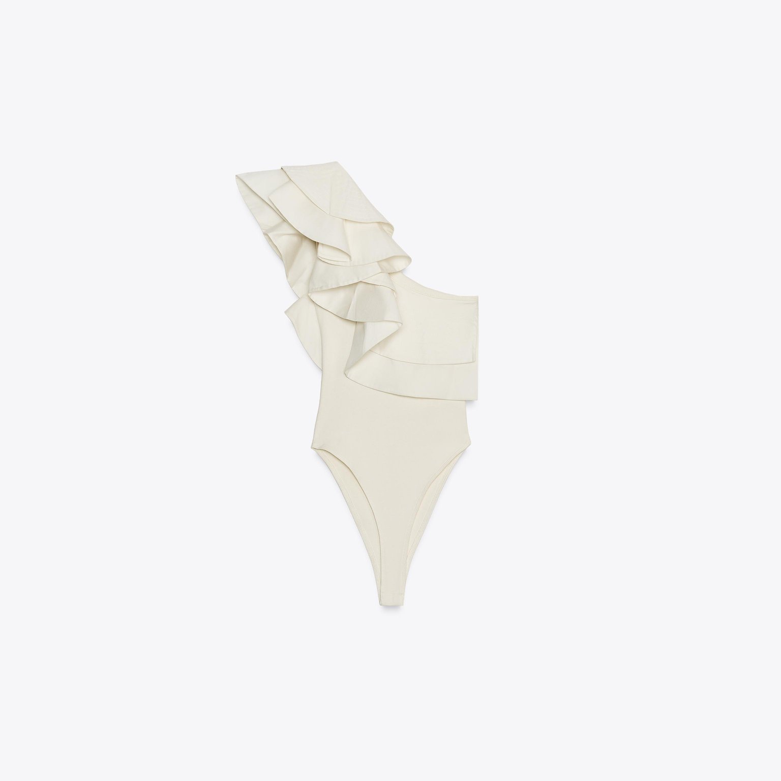 - التصميم: بادي محبوك بياقة غير متناظرة مع كشكش متباين (Asymmetric Contrast Ruffle Bodysuit)