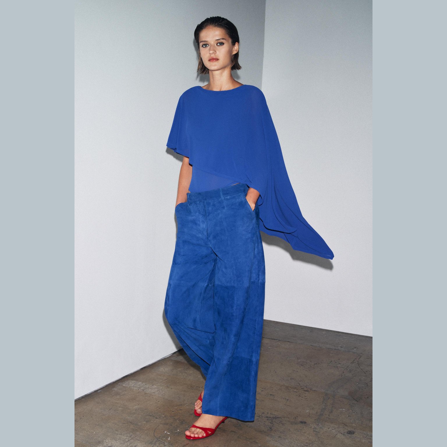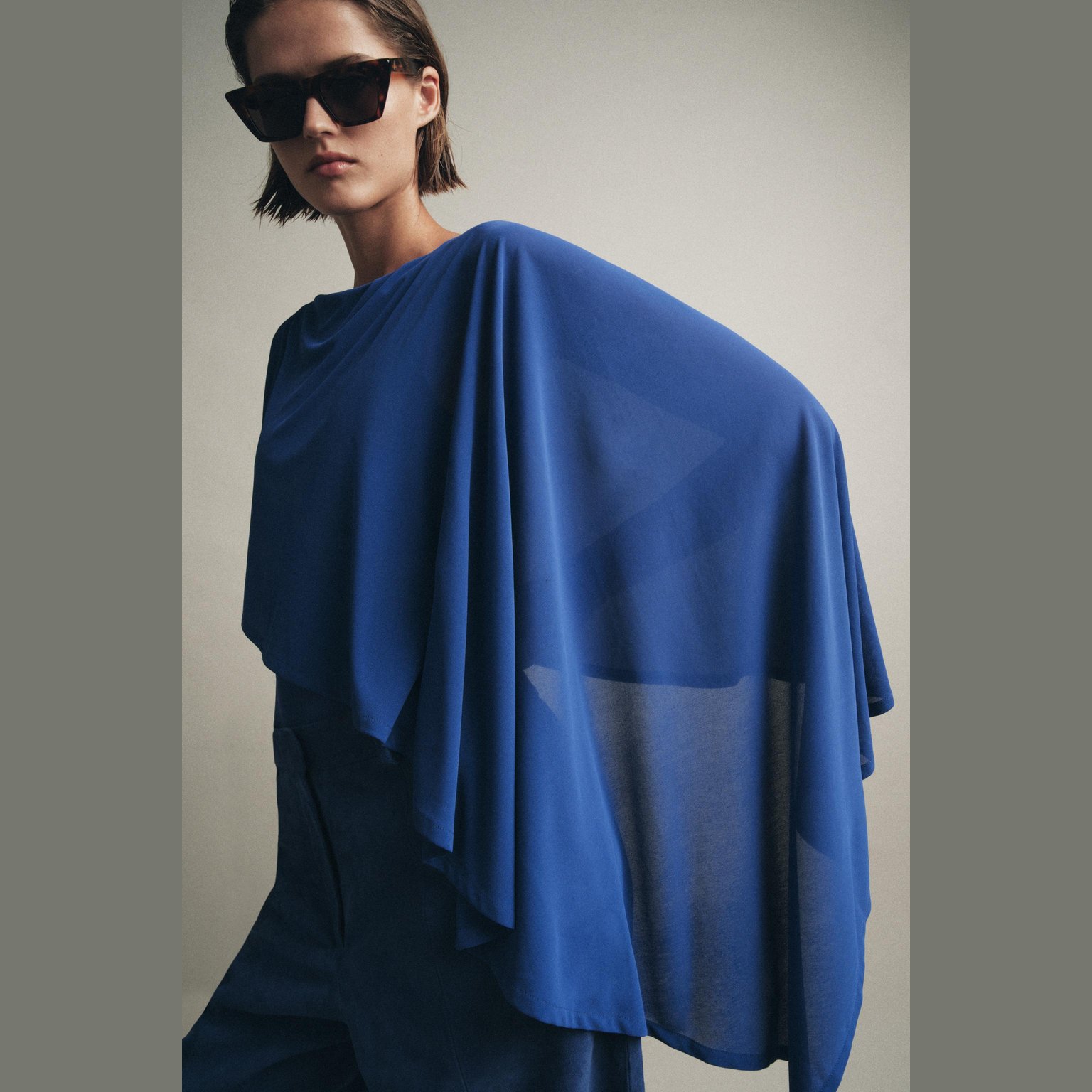 - التفاصيل: كاب غير متناظر بنفس الخامة (Asymmetric Overlay Cape Detail)