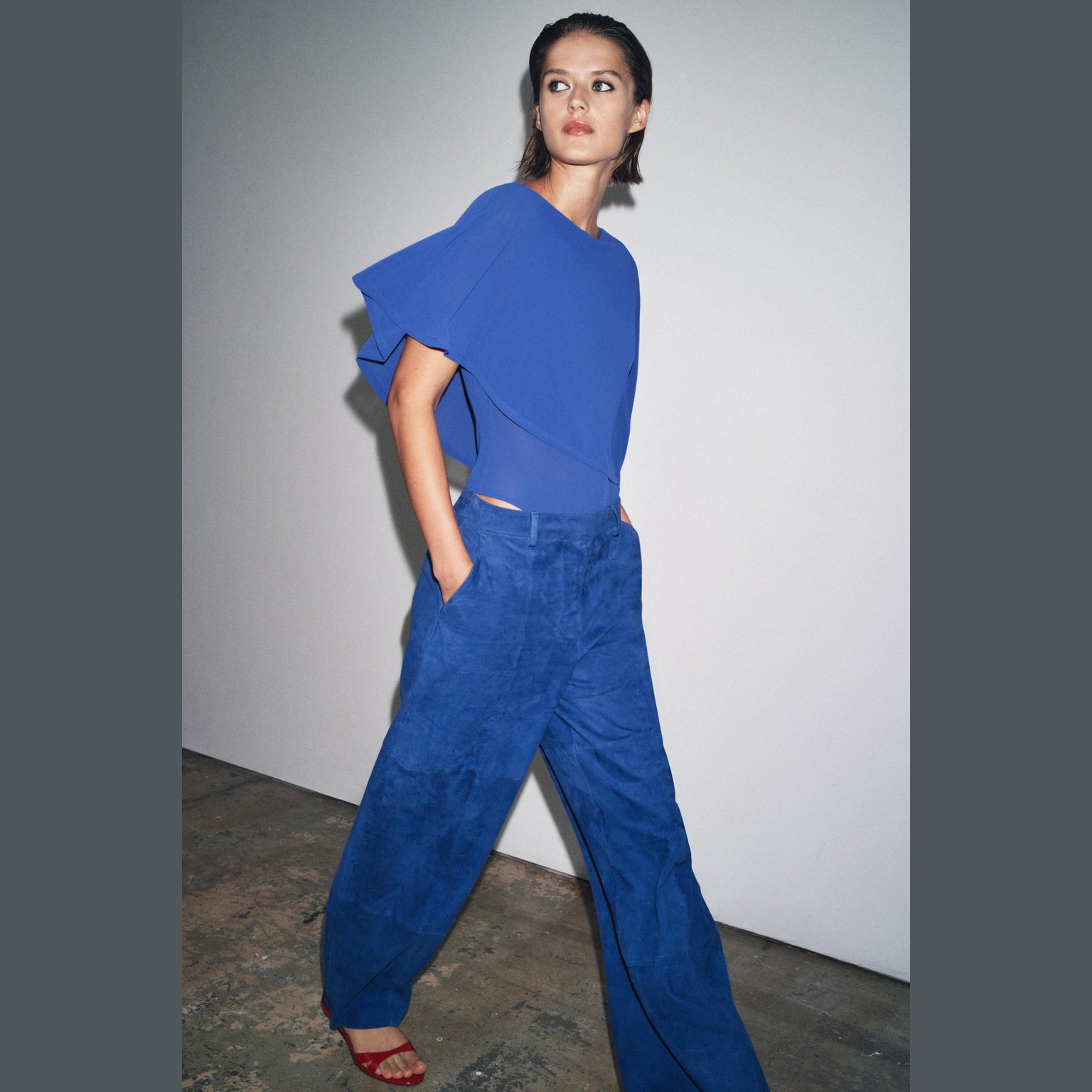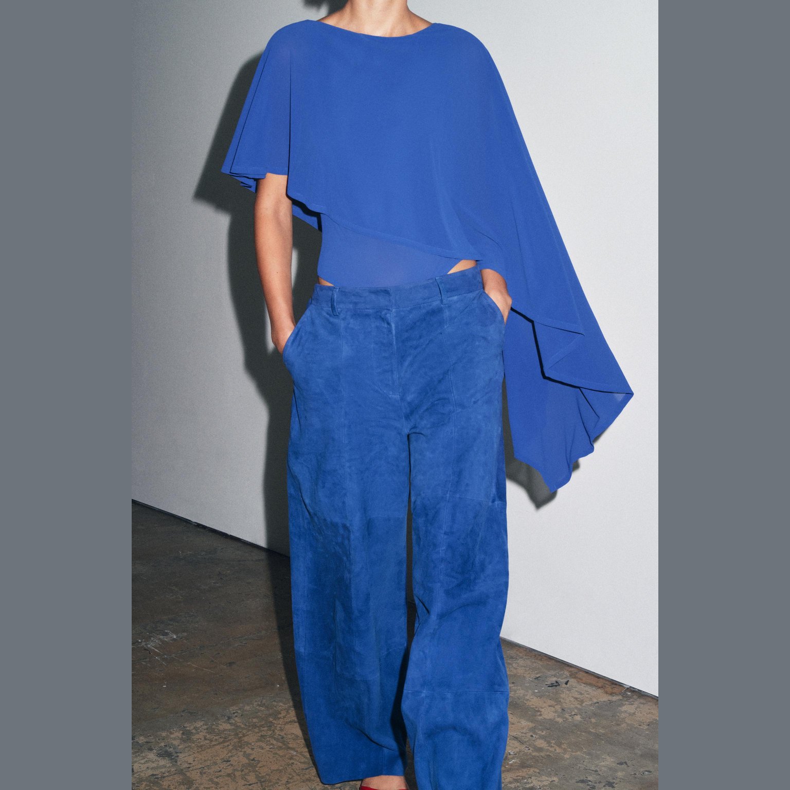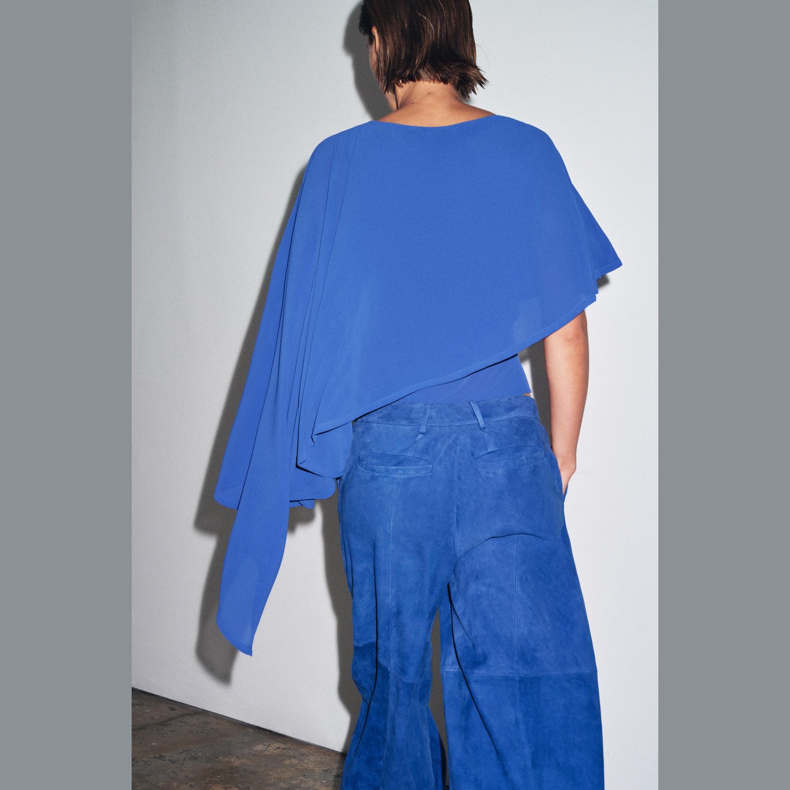 بادي محبوك بكاب غير متناظر – لون طبيعي (أزرق) – Blue (Asymmetric Cape Bodysuit) بادي أنيق بلون أزرق طبيعي، مصنوع من خامة محبوكة عملية ببوليستر يمنح مرونة وملمسًا ناعمًا، بتصميم بكاب غير متناظر يضيف لمسة عصرية أنثوية. يتميز بياقة قارب وأكمام قصيرة مع إغلاق سفلي بأزرار كبس لراحة عملية في الارتداء. قطعة مثالية للتنسيقات اليومية الكاجوال الأنيقة أو كطبقة أساسية في المناسبات المسائية.