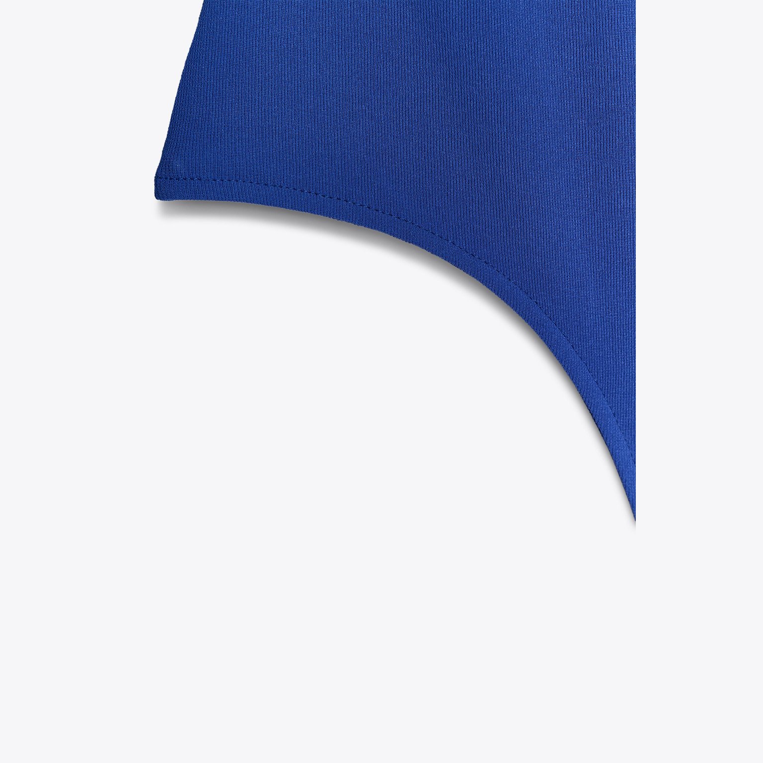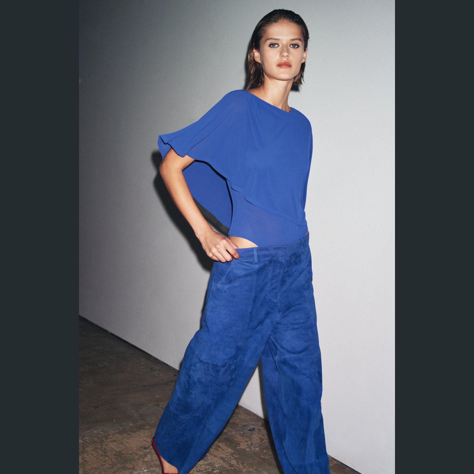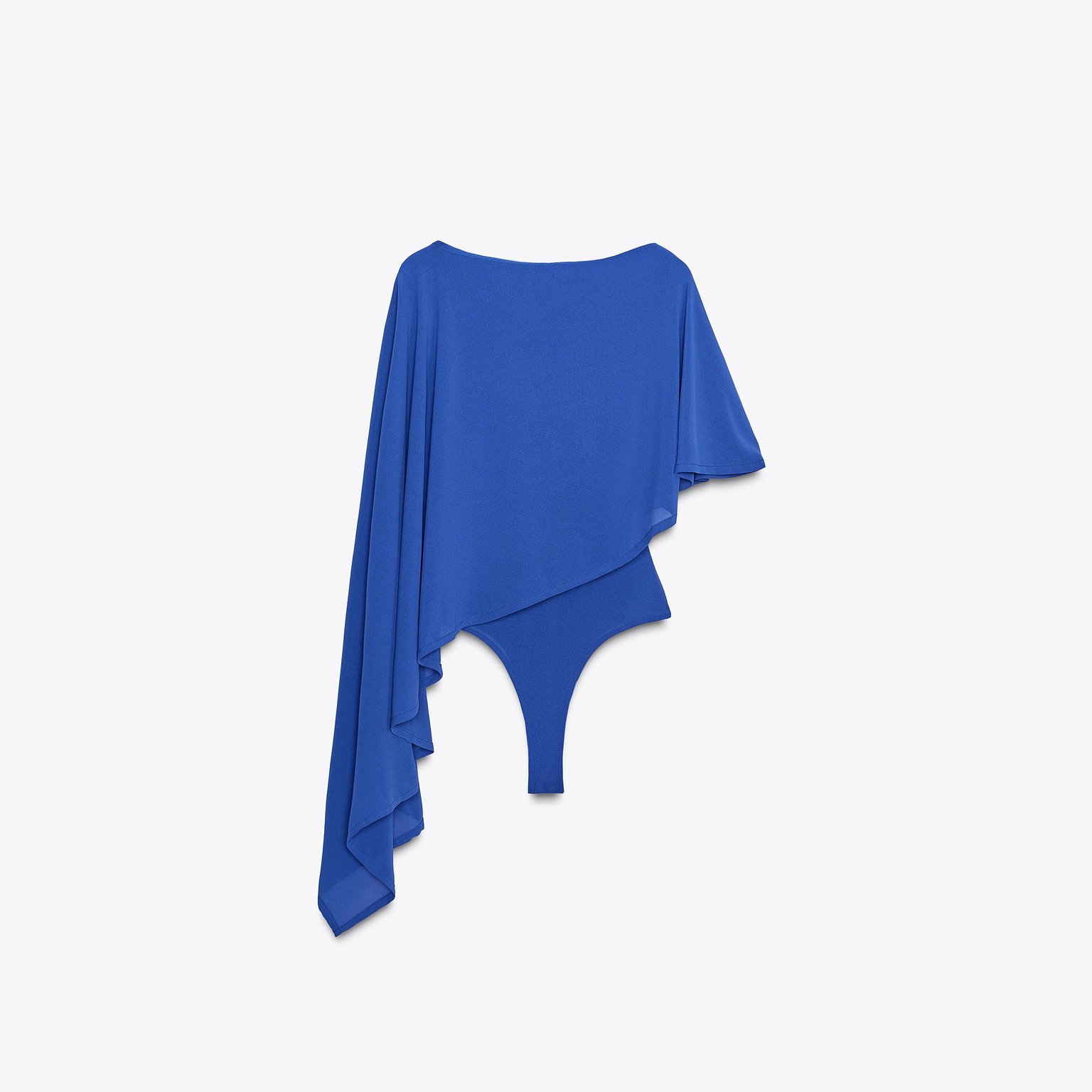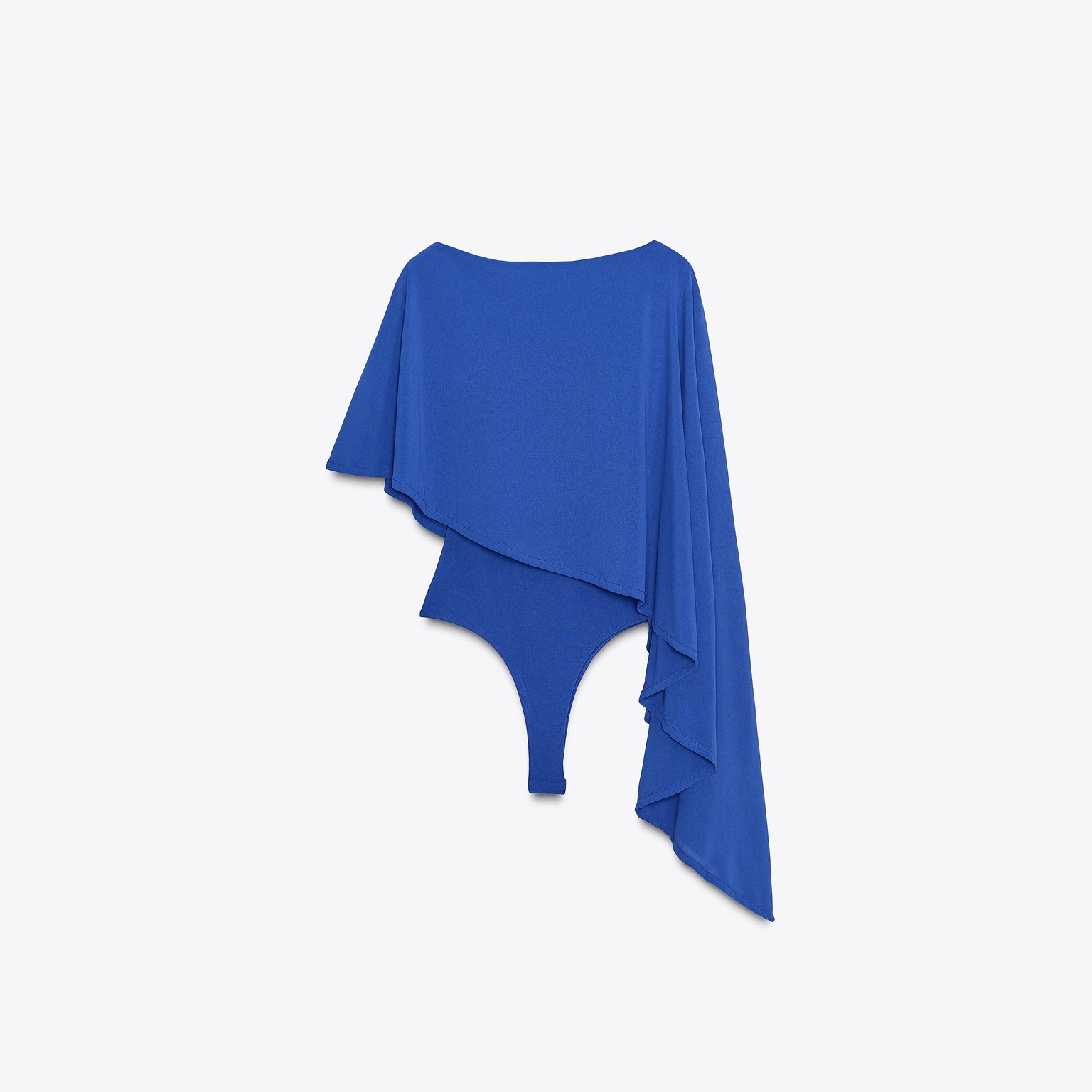- التصميم: بادي محبوك بكاب غير متناظر (Asymmetric Cape Bodysuit)
