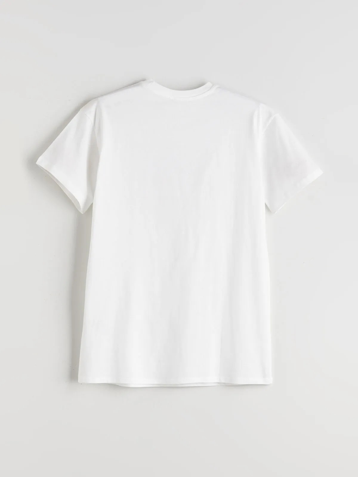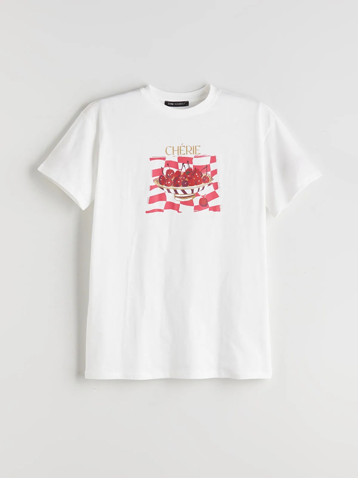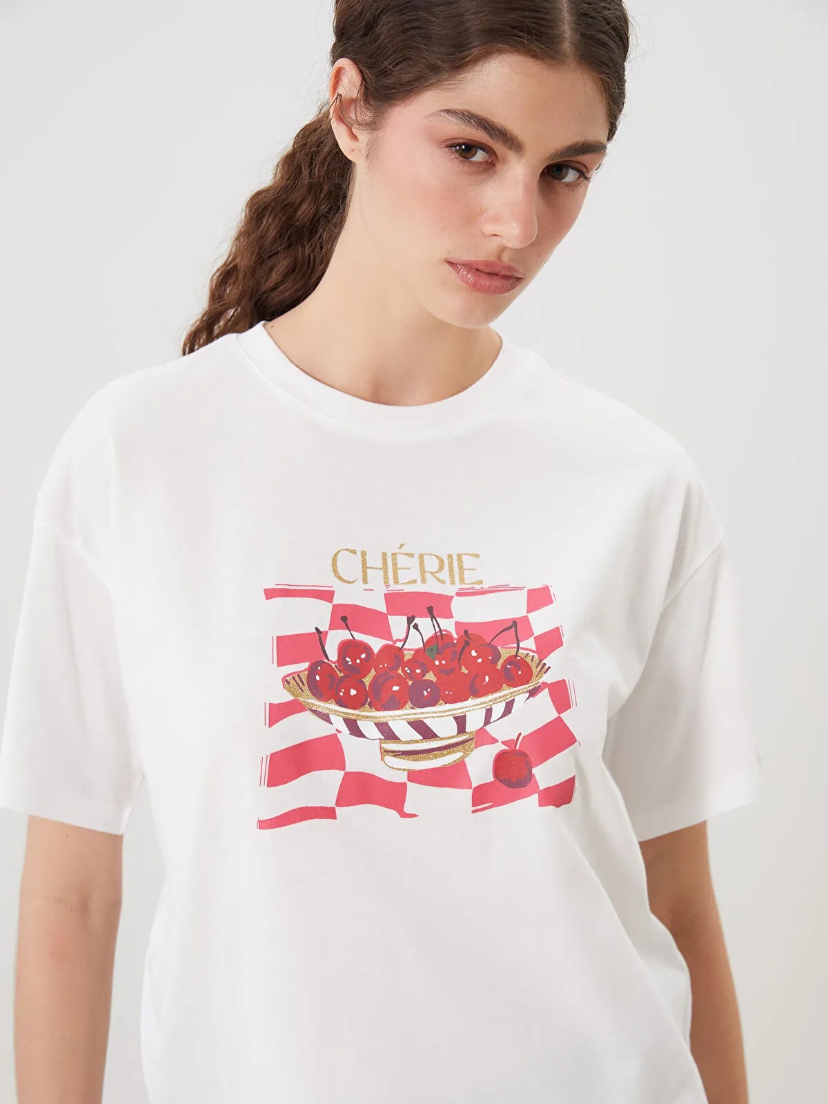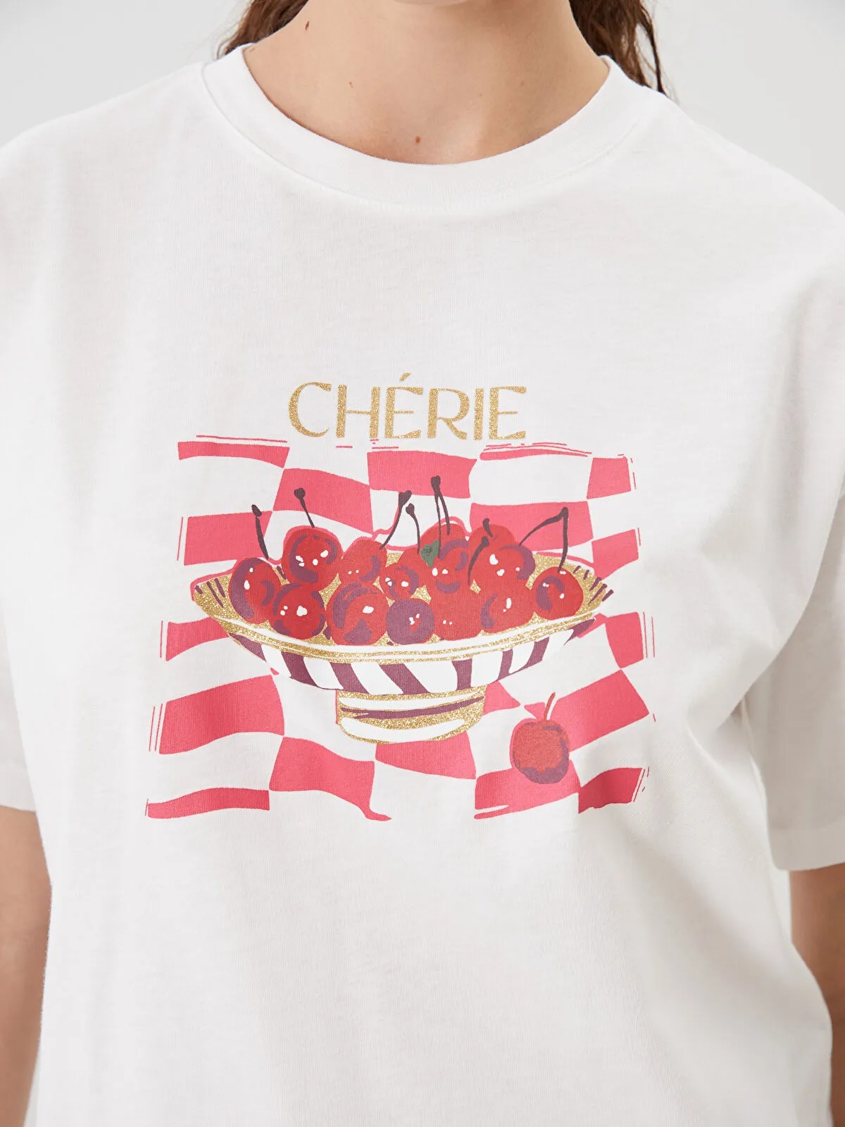 تيشيرت نسائي بلون بيج فاتح ناعم (Ekru)، بياقة دائرية قصيرة وأكمام قصيرة، مزين بطبعة كرز أنثوية أنيقة؛ تصميم Loose & Bol يمنح حرية حركة وراحة طوال اليوم، مناسب للإطلالة الكاجوال بأناقة بسيطة.