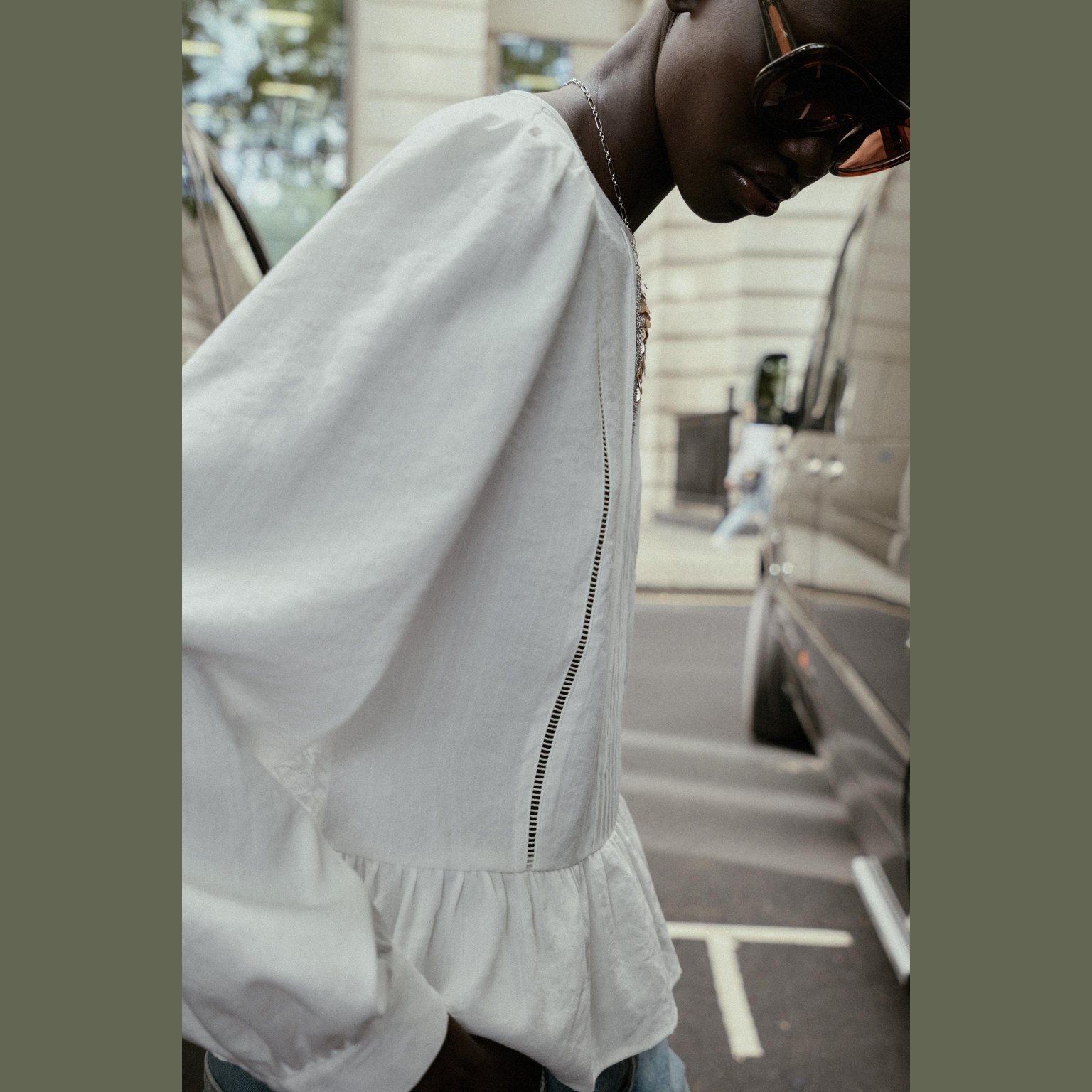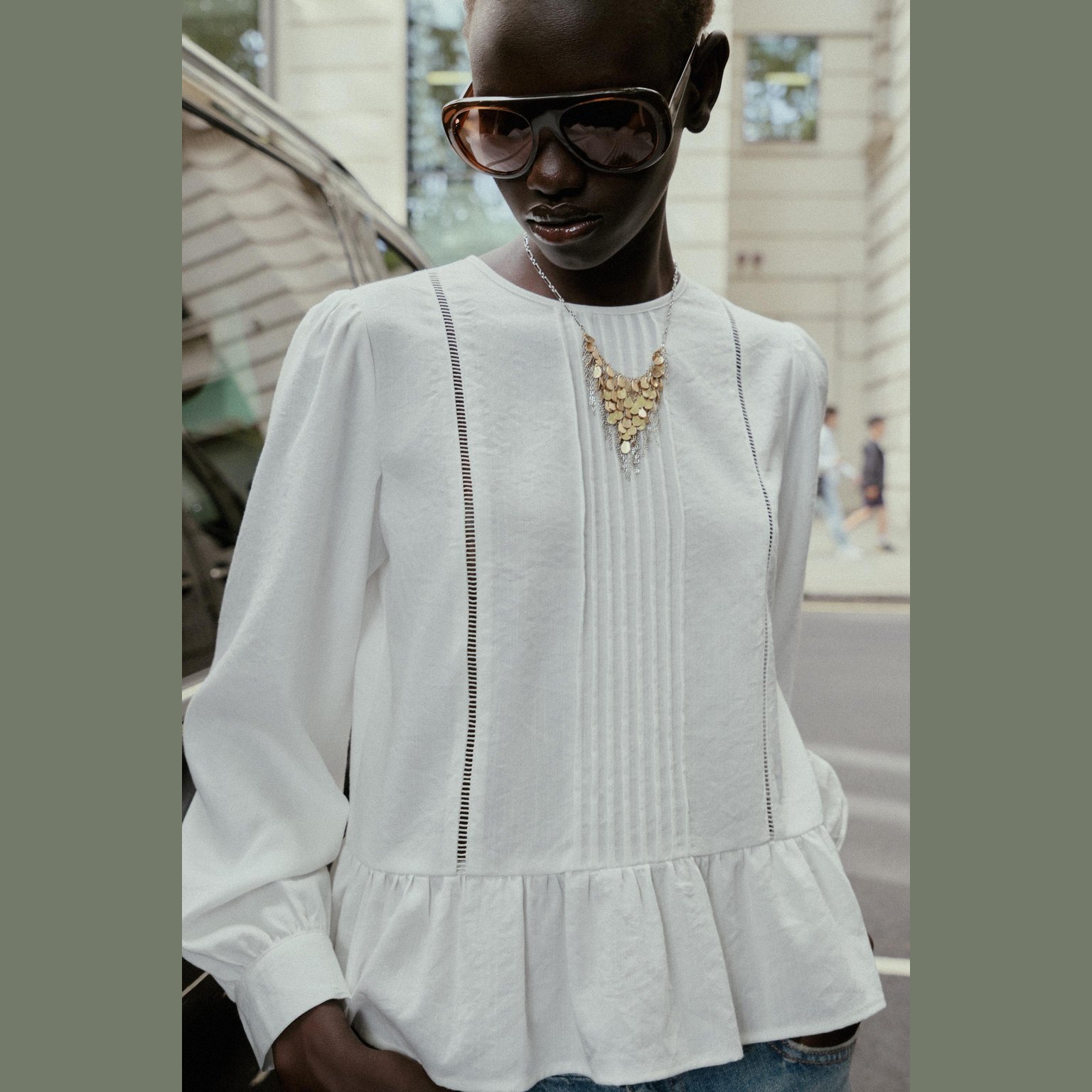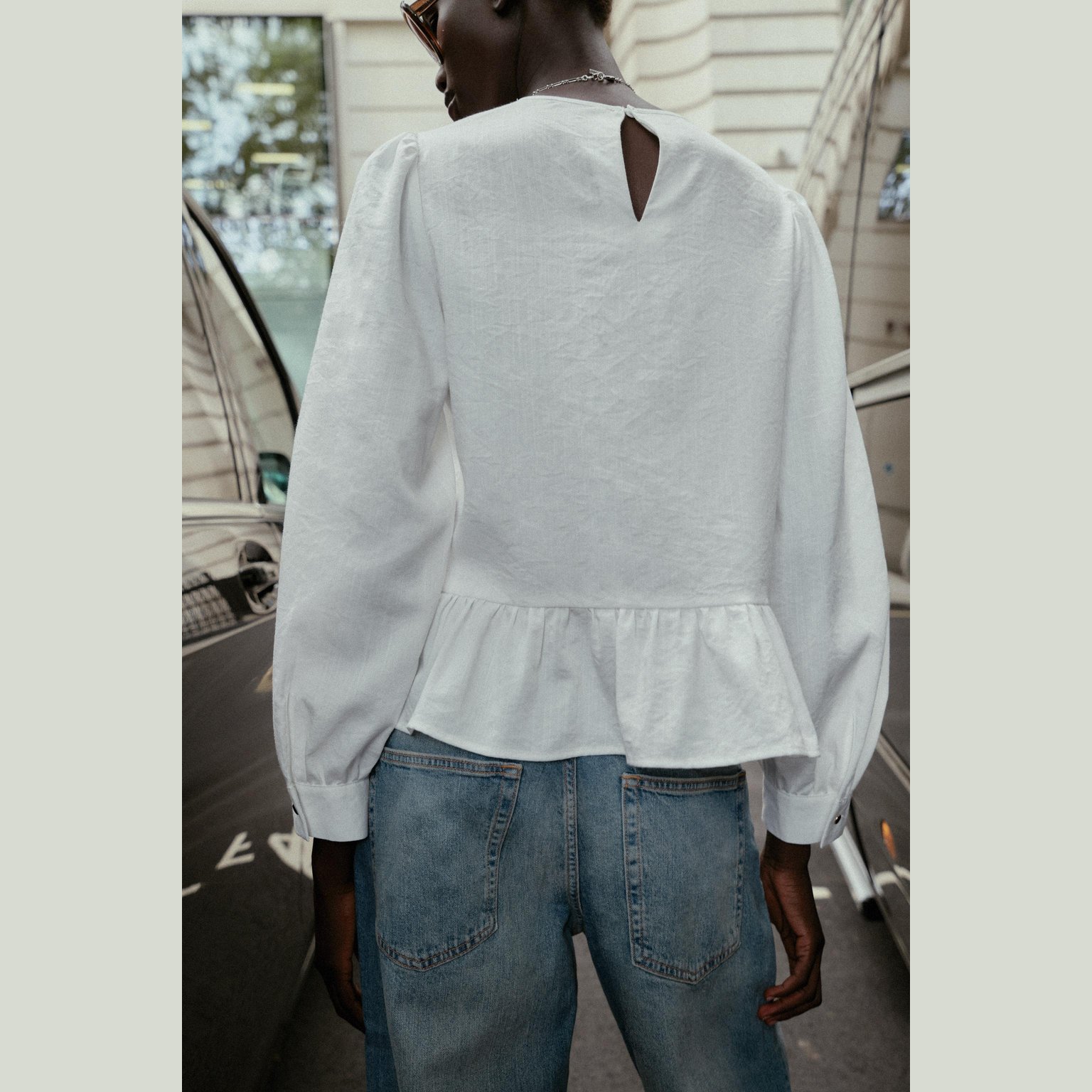 بلوزة بياقة دائرية مع خياطة سلمية وحافة بيبلوم – لون أوستر وايت – Oyster‑white (Ladder Stitch Peplum Blouse) بلوزة أنيقة بتصميم ناعم وأنثوي، تتميز بأكمام منفوشة طويلة مع أساور بأزرار، إضافة إلى خياطة سلمية تمنح لمسة فاخرة. تأتي بحافة بيبلوم تضيف انسيابية وجاذبية، مع فتحة خلفية صغيرة تُغلق بزر لمظهر راقٍ يناسب الإطلالات اليومية والرسمية.