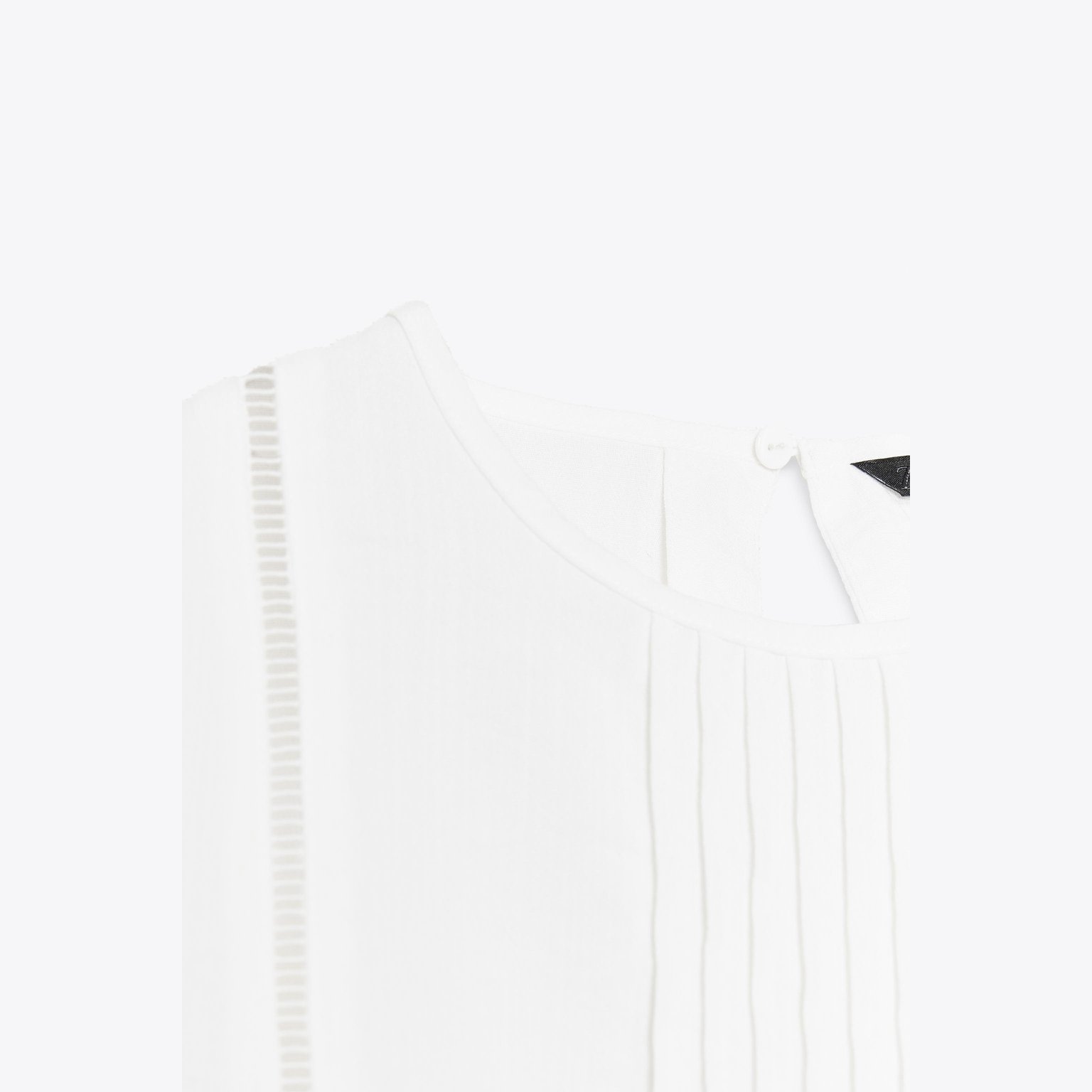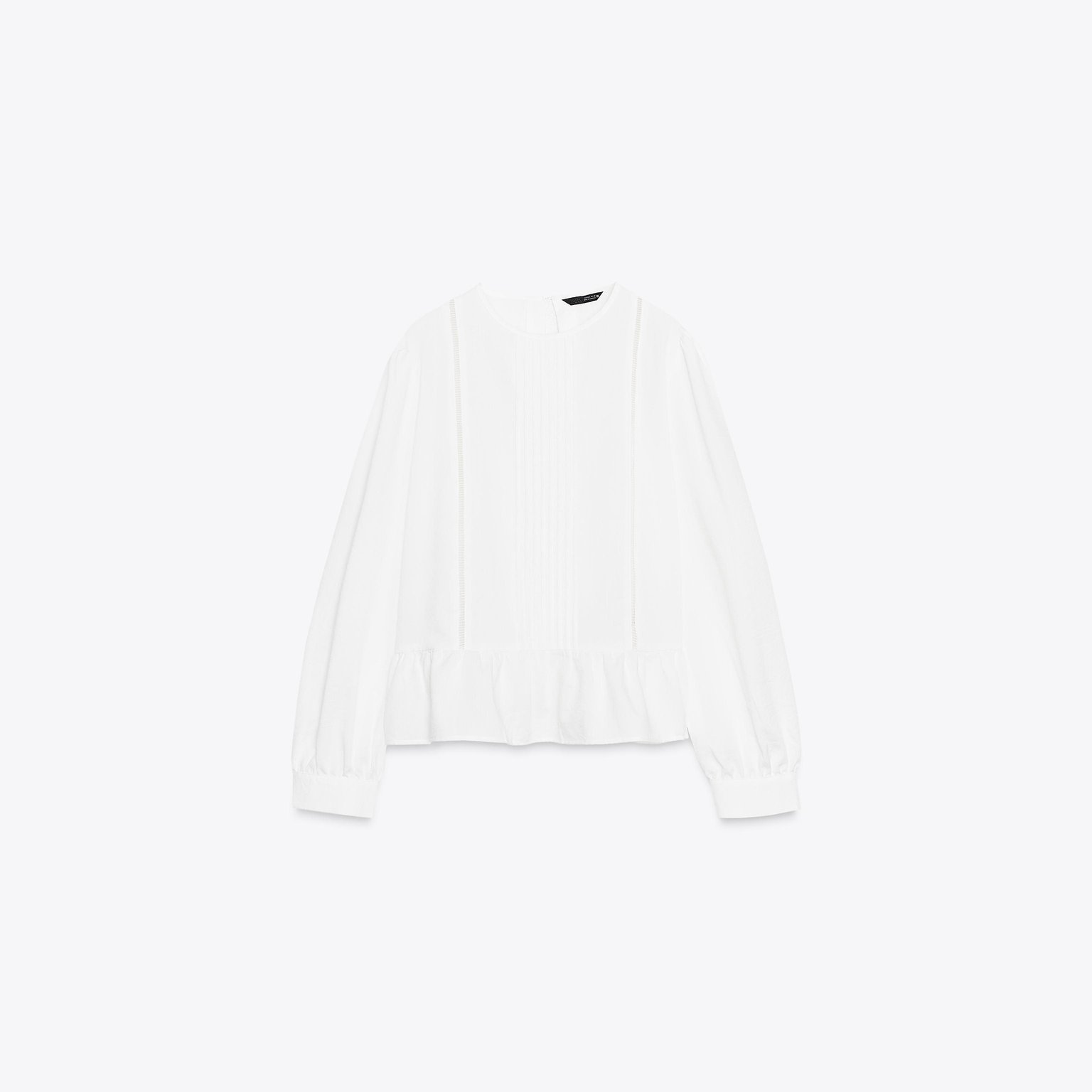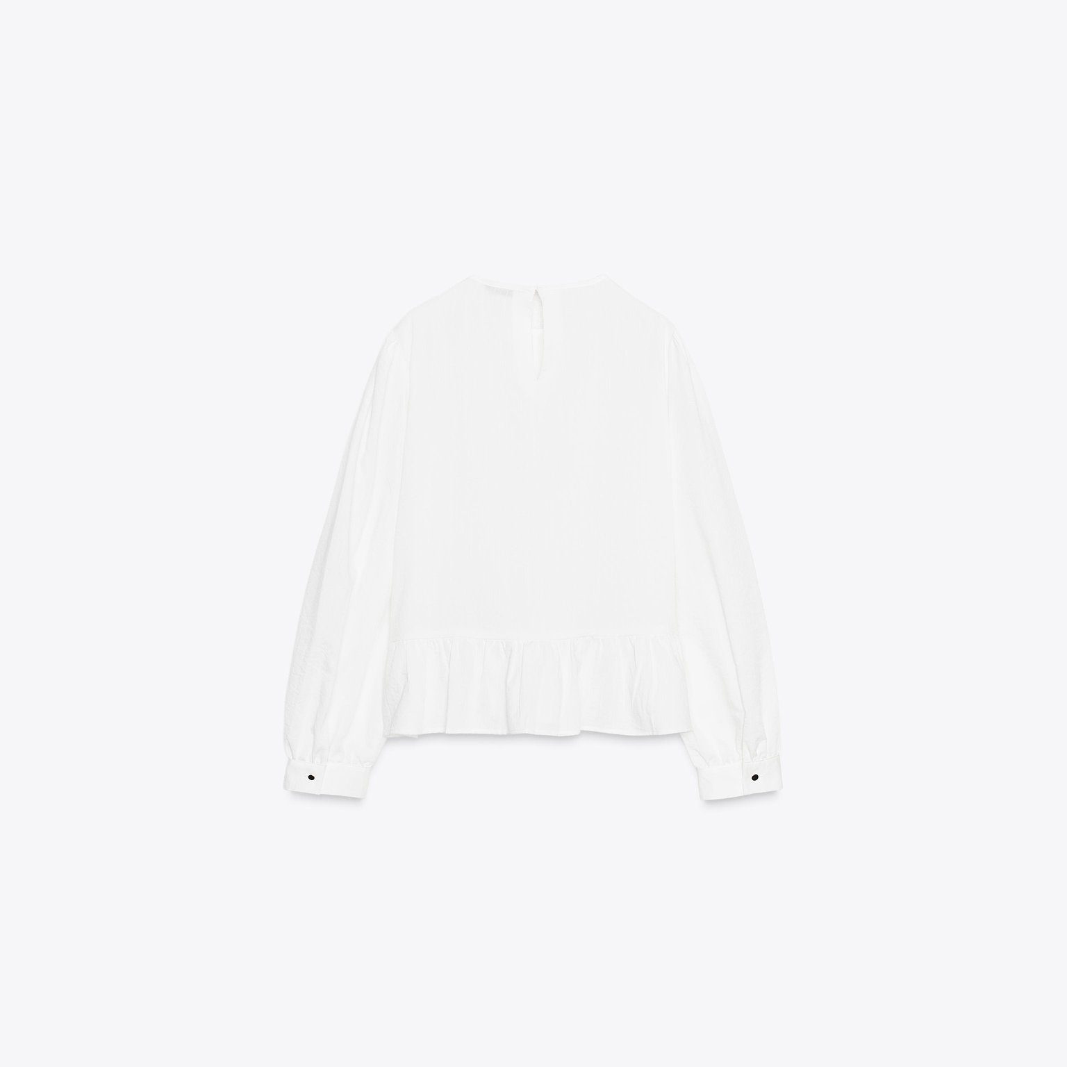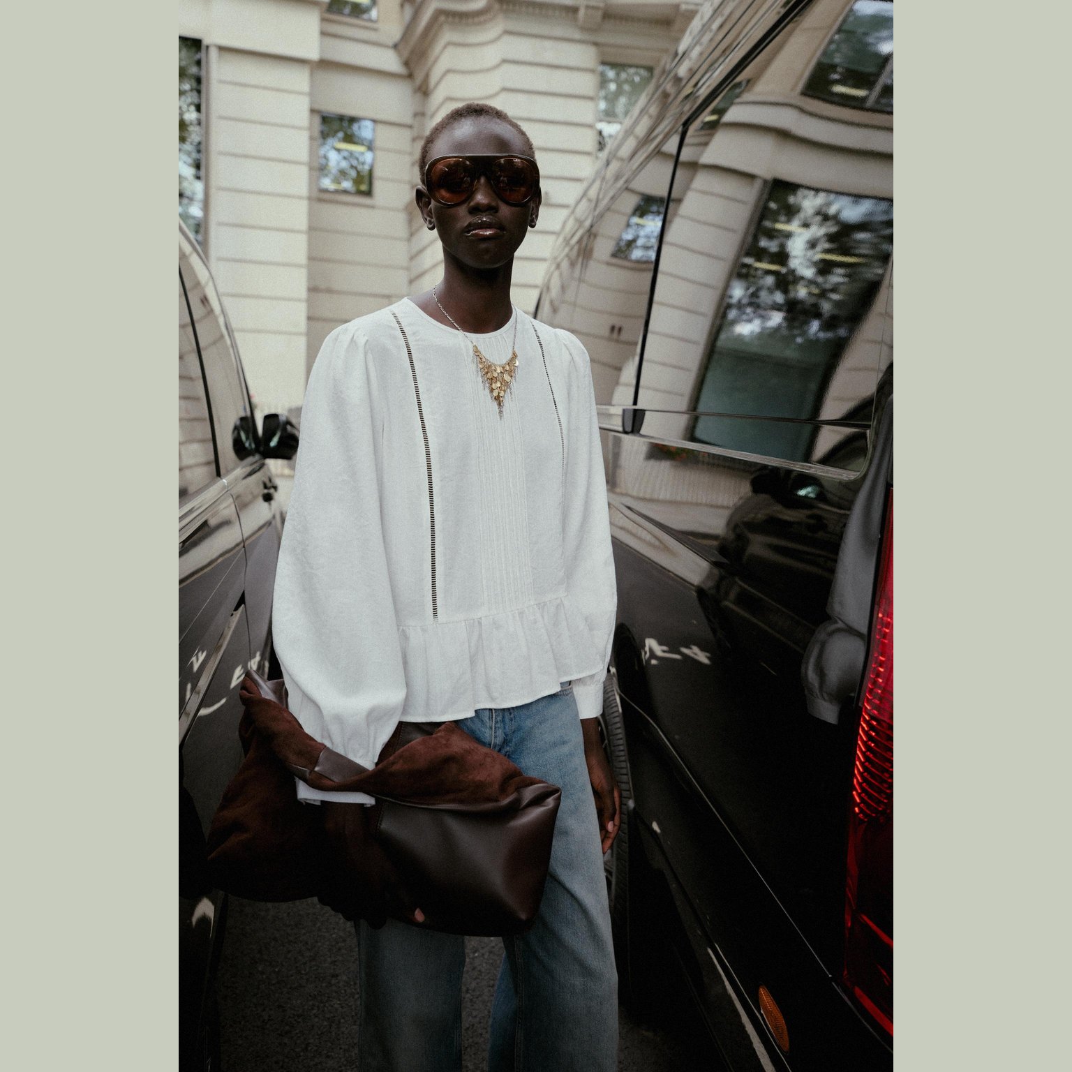 بلوزة بياقة دائرية مع خياطة سلمية وحافة بيبلوم – لون أوستر وايت – Oyster‑white (Ladder Stitch Peplum Blouse) بلوزة أنيقة بتصميم ناعم وأنثوي، تتميز بأكمام منفوشة طويلة مع أساور بأزرار، إضافة إلى خياطة سلمية تمنح لمسة فاخرة. تأتي بحافة بيبلوم تضيف انسيابية وجاذبية، مع فتحة خلفية صغيرة تُغلق بزر لمظهر راقٍ يناسب الإطلالات اليومية والرسمية.