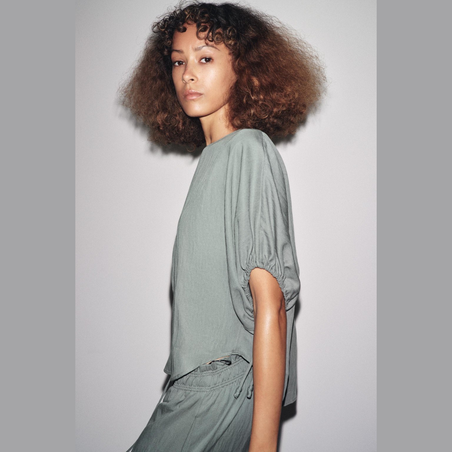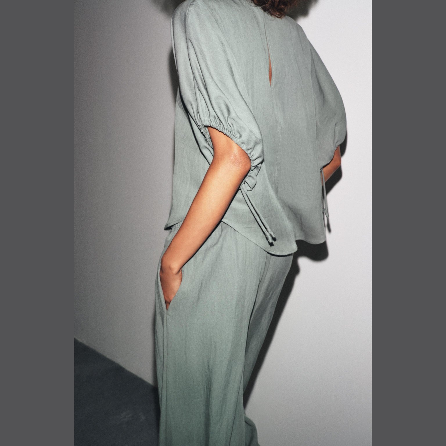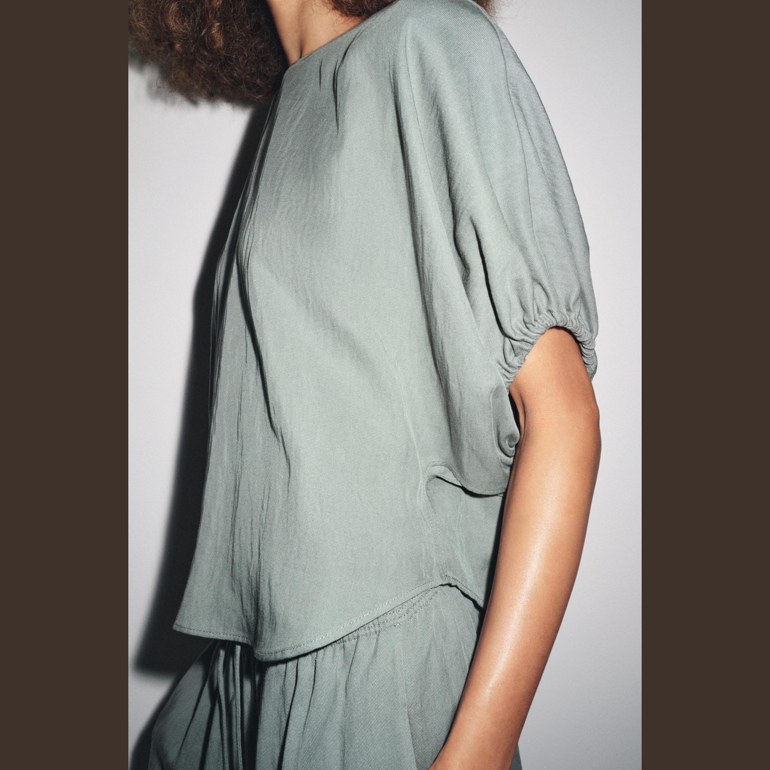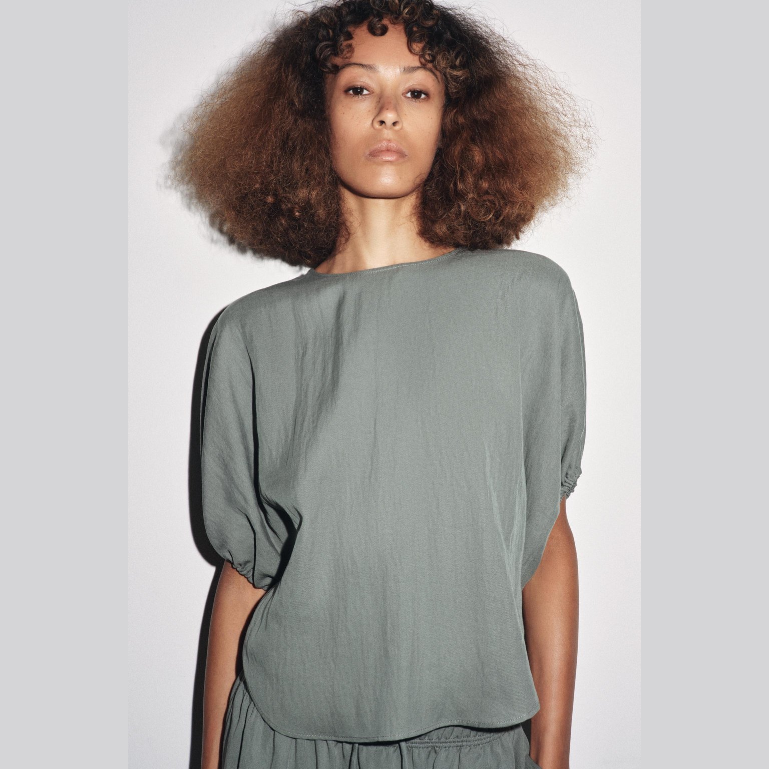 بلوزة بأكمام منفوشة – لون أزرق رمادي – Blue Grey (ZW Collection Puff Sleeve Blouse) بلوزة أنيقة من مجموعة ZW، مصنوعة من خيط ممزوج بالليوسيل يمنح ملمسًا ناعمًا وانسيابيًا. تتميز بأكمام منفوشة قصيرة قابلة للتعديل عبر رباط جانبي، مع ياقة دائرية وحافة مستديرة تضيف لمسة عصرية راقية. تصميمها الأنثوي يجعلها خيارًا مثاليًا للإطلالات اليومية والكاجوال الأنيقة.