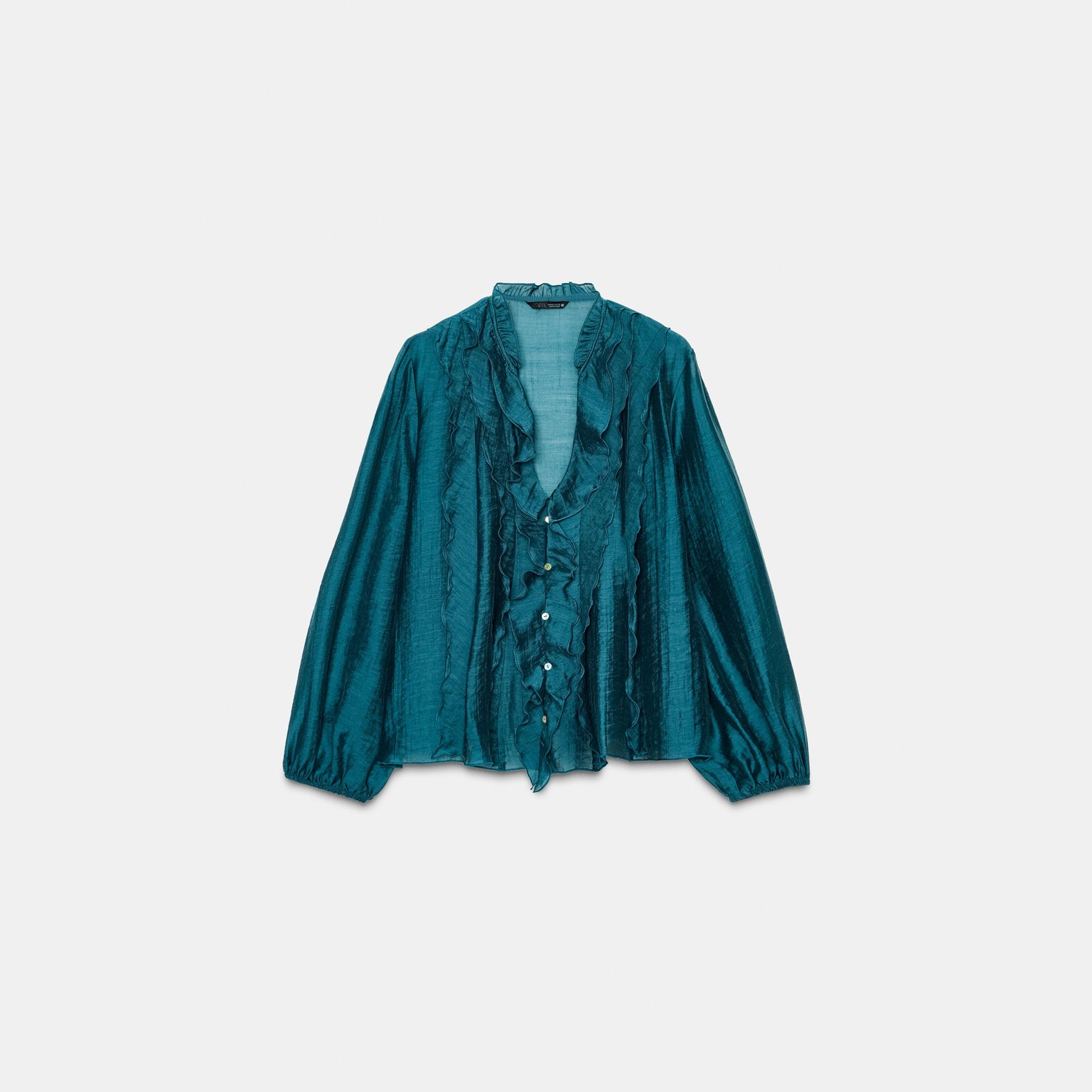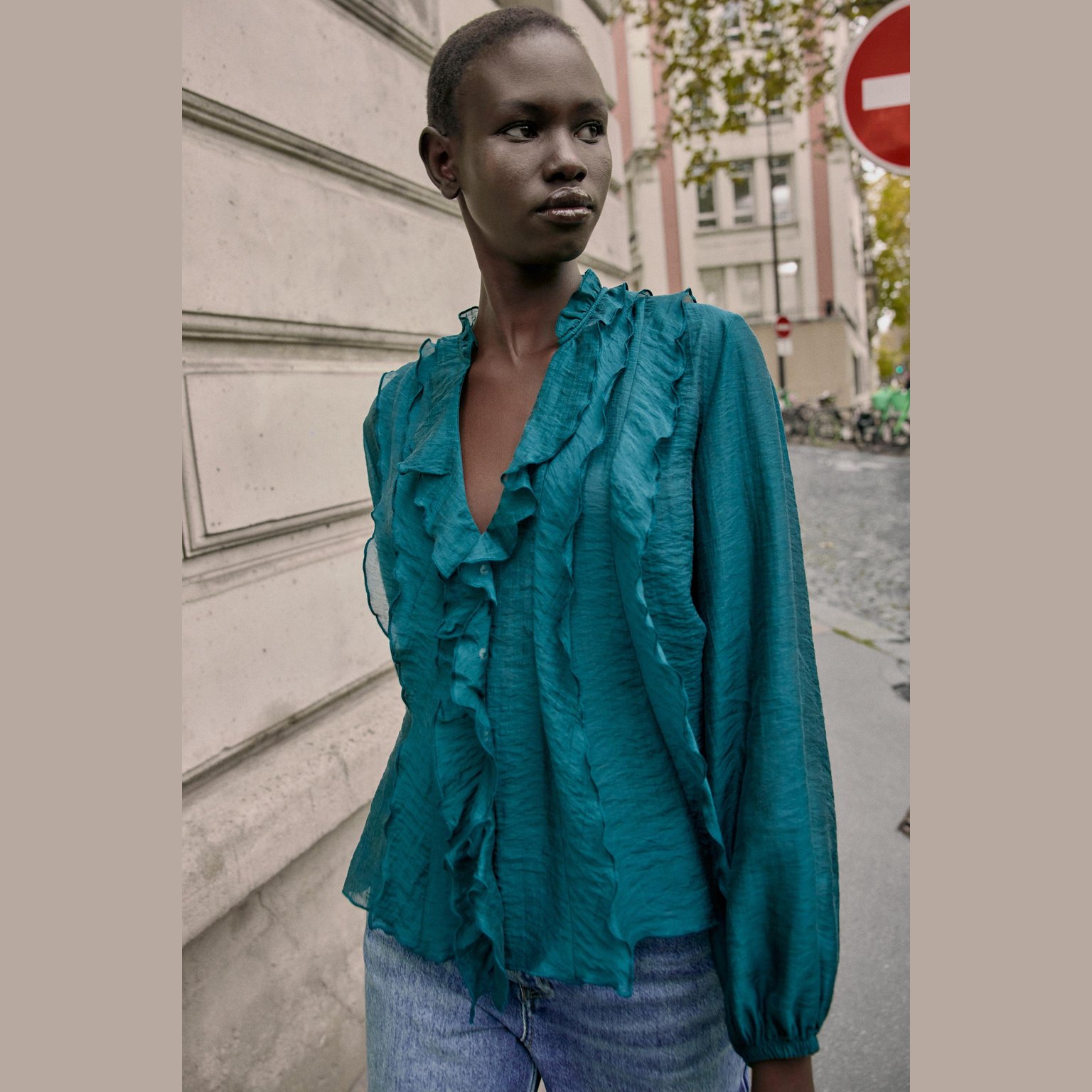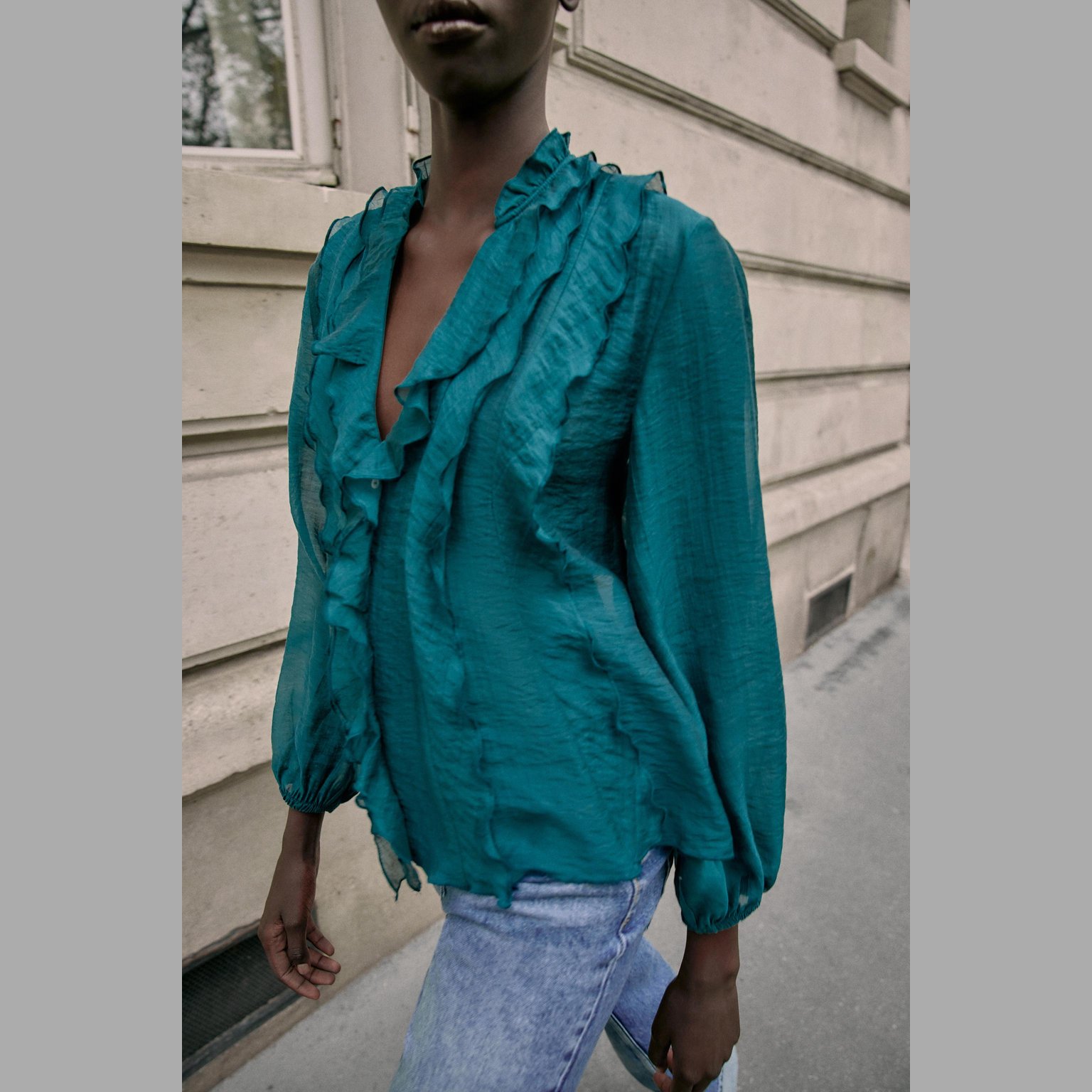 بلوزة بياقة V مع كشكش – لون أخضر زجاجي – Bottle Green (Ruffled Blouse) بلوزة أنيقة بتصميم ناعم وأنثوي، تتميز بياقة V مزينة بكشكش يضيف لمسة راقية، مع أكمام طويلة تنتهي بأساور مطاطية تمنح راحة وسهولة في الحركة. تأتي بتفاصيل أزرار أمامية شكلية لمظهر عصري يناسب الإطلالات اليومية والكاجوال الأنيقة.