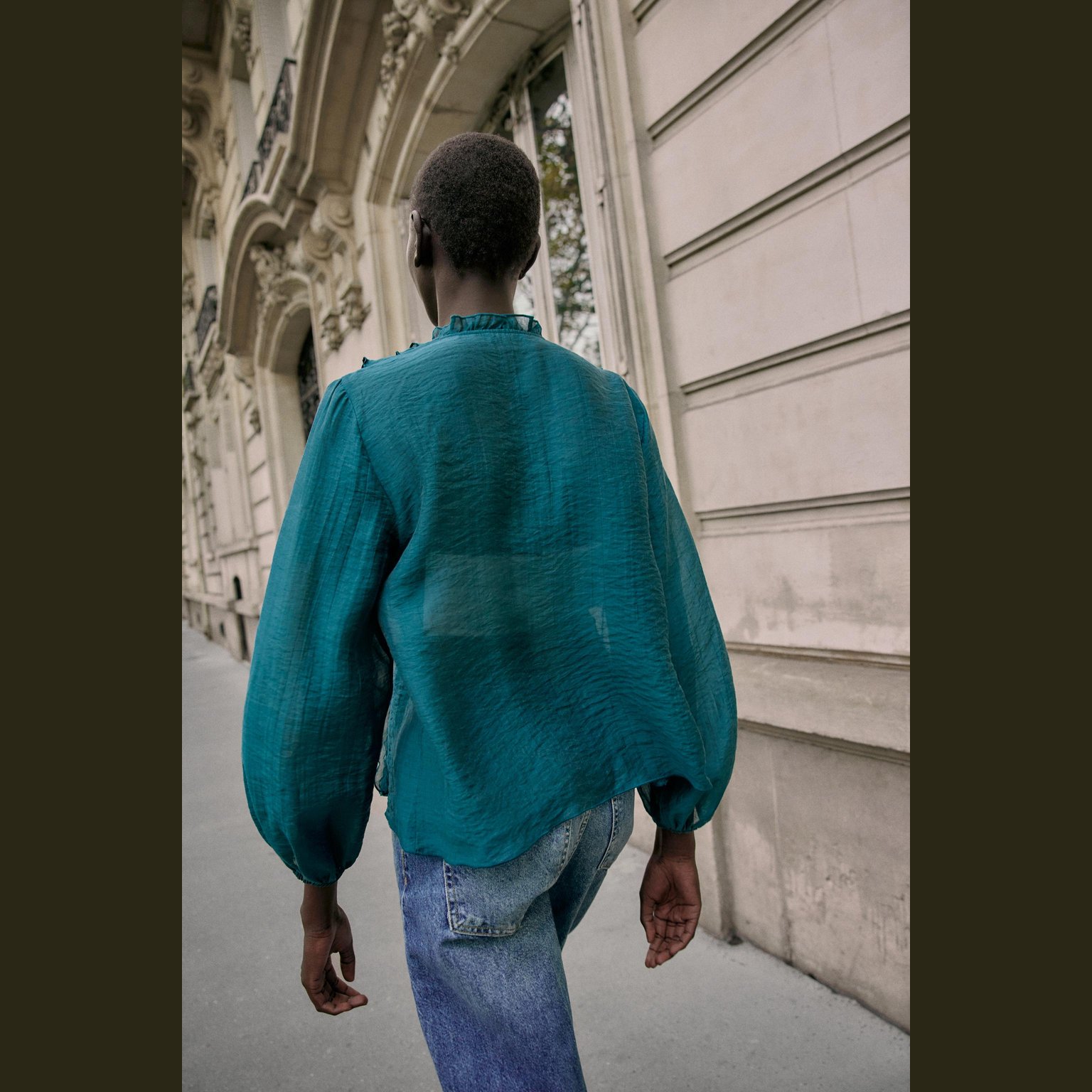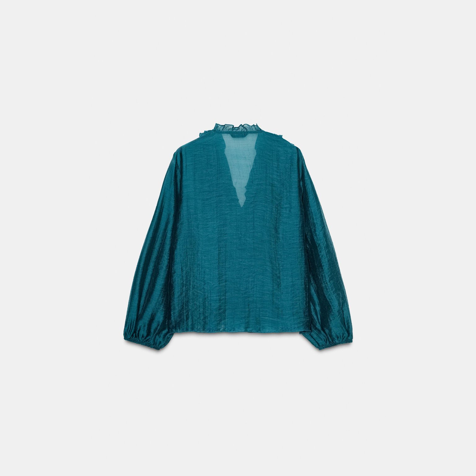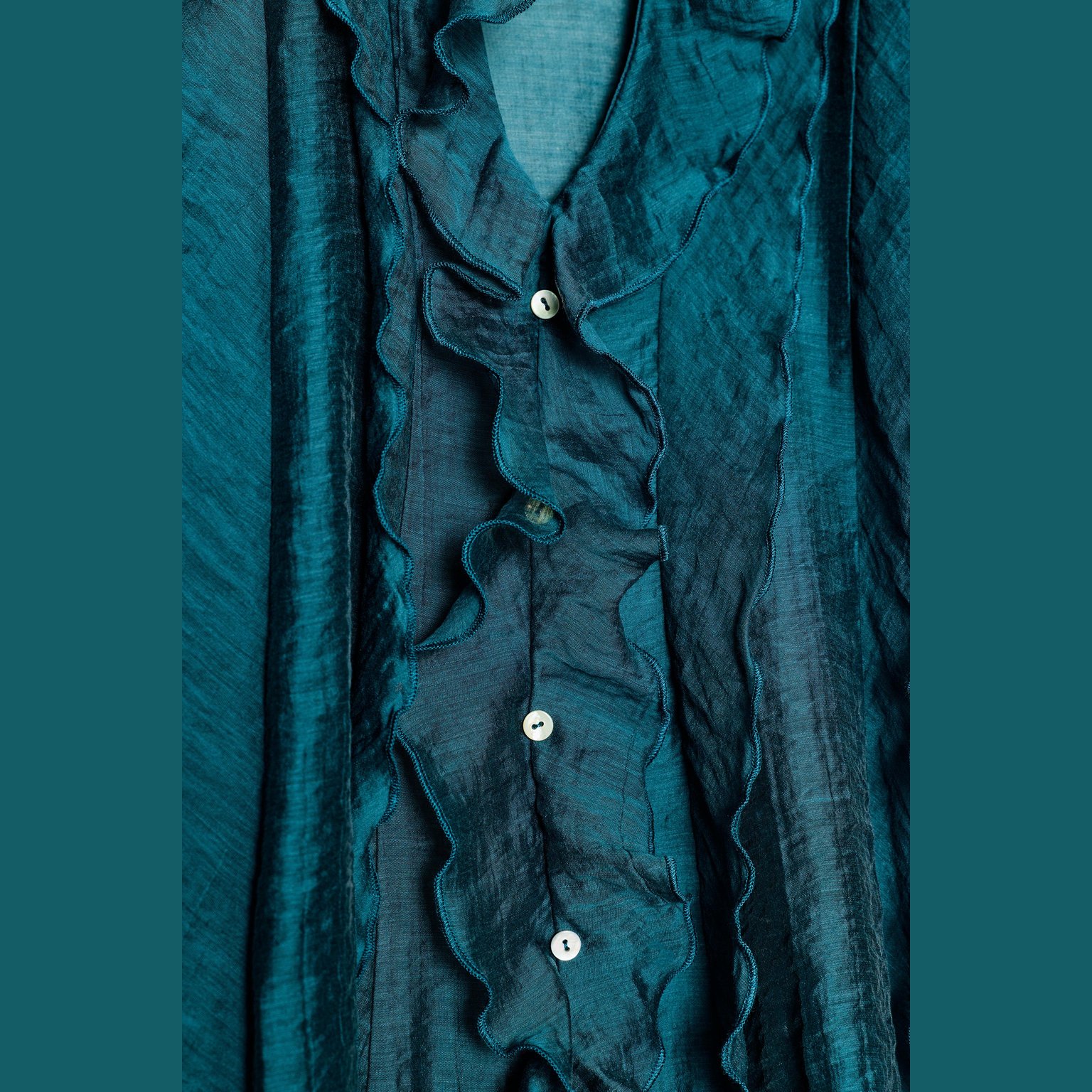بلوزة بياقة V مع كشكش – لون أخضر زجاجي – Bottle Green (Ruffled Blouse) بلوزة أنيقة بتصميم ناعم وأنثوي، تتميز بياقة V مزينة بكشكش يضيف لمسة راقية، مع أكمام طويلة تنتهي بأساور مطاطية تمنح راحة وسهولة في الحركة. تأتي بتفاصيل أزرار أمامية شكلية لمظهر عصري يناسب الإطلالات اليومية والكاجوال الأنيقة.