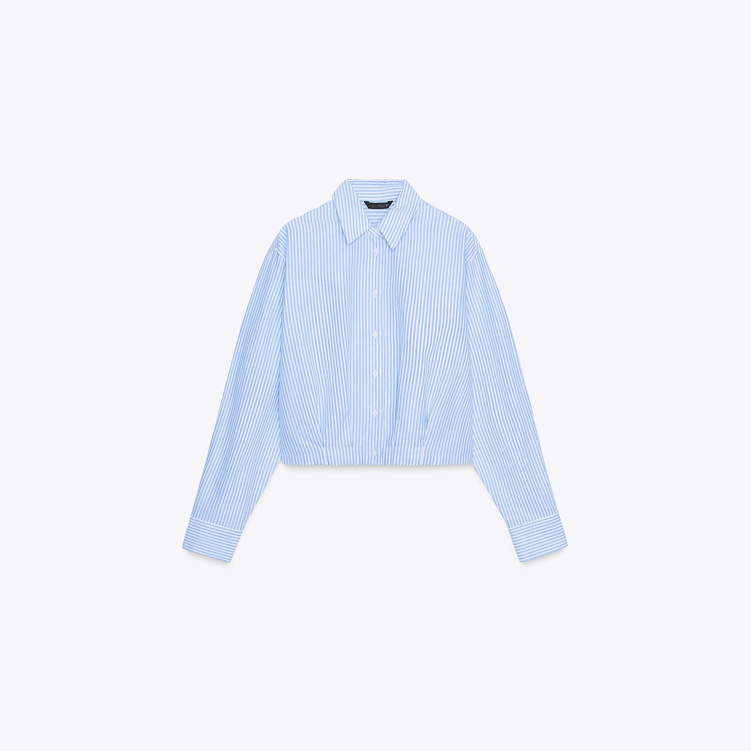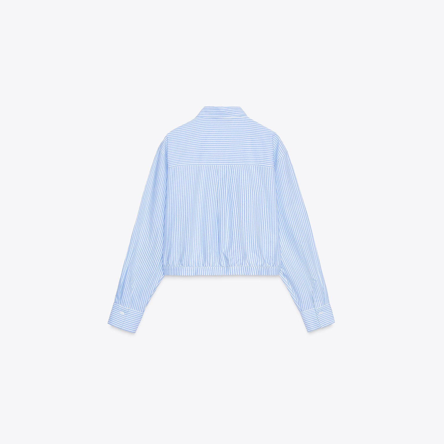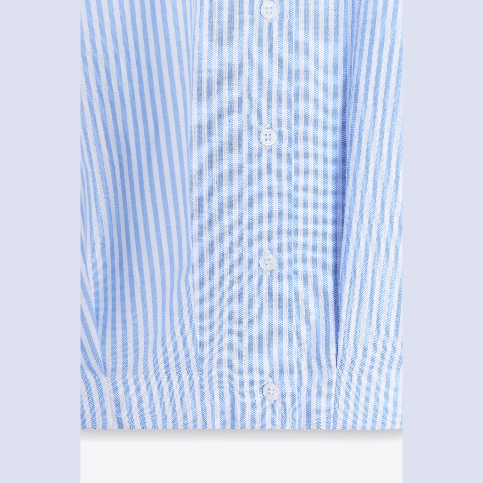 قميص أوكسفورد قصير مخطط مع طيات أمامية – لون إيكروم/أزرق – Ecru/Blue (Pleated Waist Striped Cropped Oxford Shirt) قميص أنيق بتصميم عصري قصير، يتميز بياقة لابيل وأكمام طويلة، مع طيات أمامية عند الحافة تضيف لمسة فاخرة وانسيابية للتصميم. يأتي بإغلاق أمامي بأزرار ويمنح مظهرًا شبابيًا مناسبًا للإطلالات اليومية والكاجوال الأنيقة.