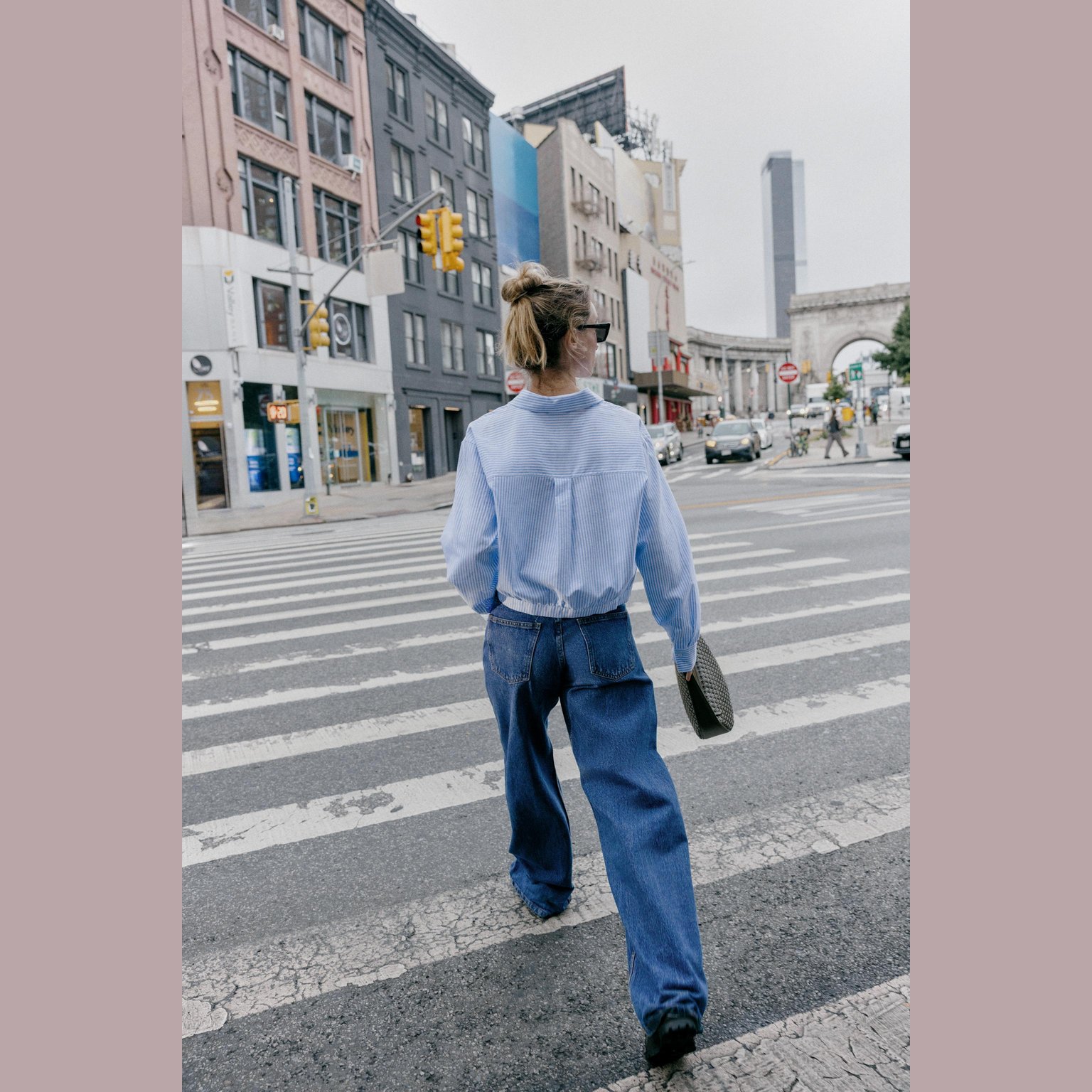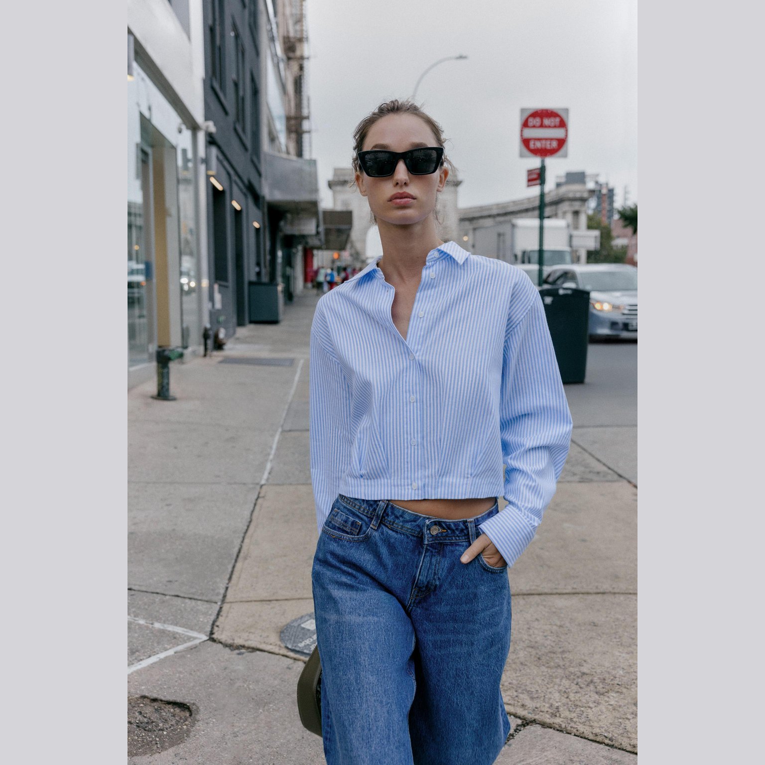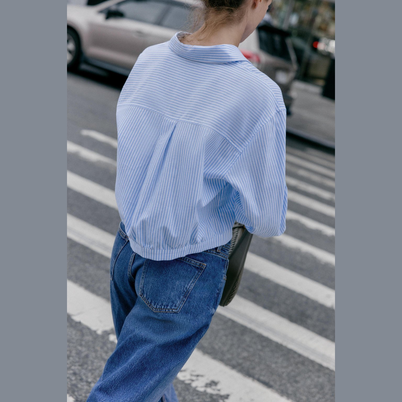قميص أوكسفورد قصير مخطط مع طيات أمامية – لون إيكروم/أزرق – Ecru/Blue (Pleated Waist Striped Cropped Oxford Shirt) قميص أنيق بتصميم عصري قصير، يتميز بياقة لابيل وأكمام طويلة، مع طيات أمامية عند الحافة تضيف لمسة فاخرة وانسيابية للتصميم. يأتي بإغلاق أمامي بأزرار ويمنح مظهرًا شبابيًا مناسبًا للإطلالات اليومية والكاجوال الأنيقة.