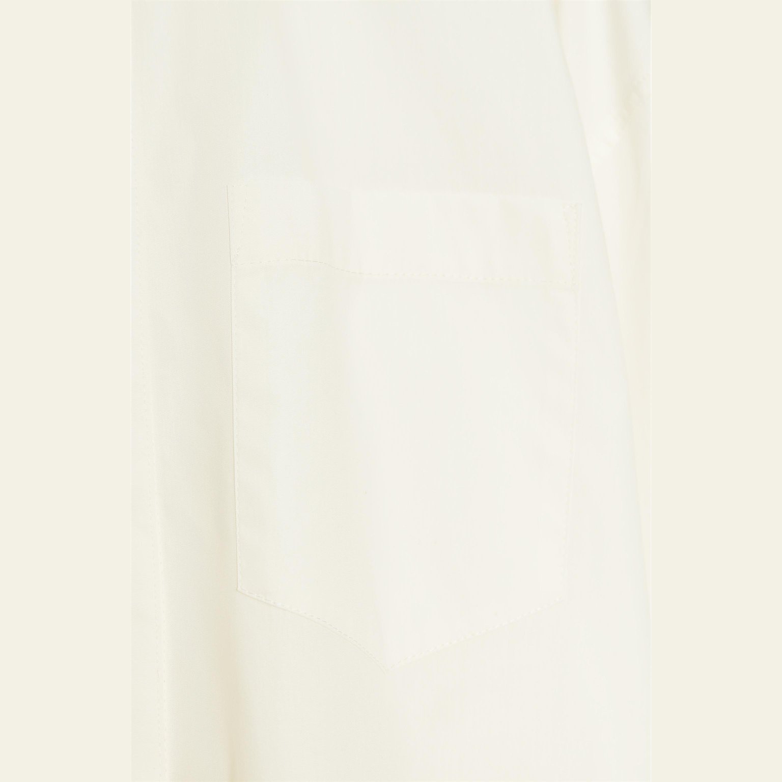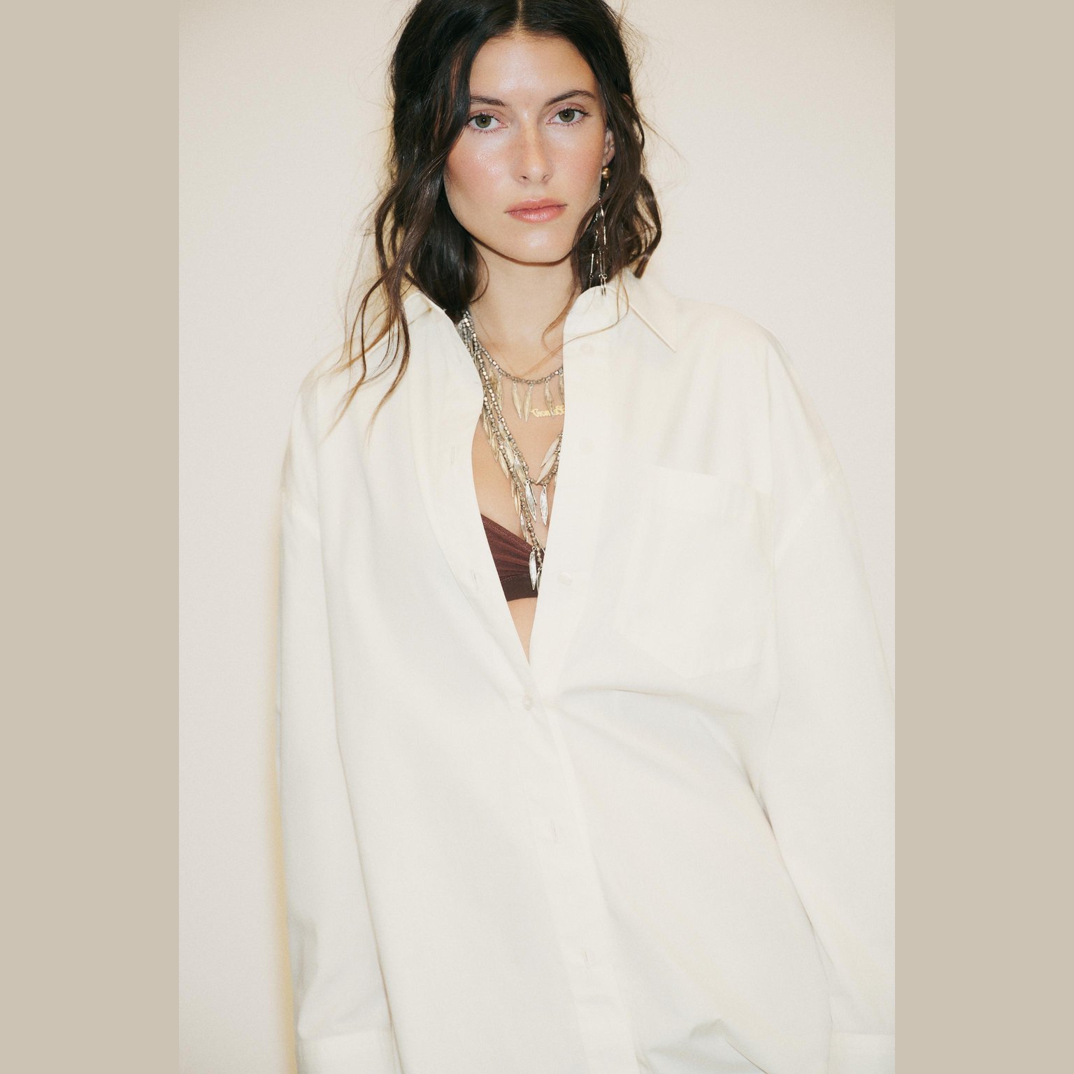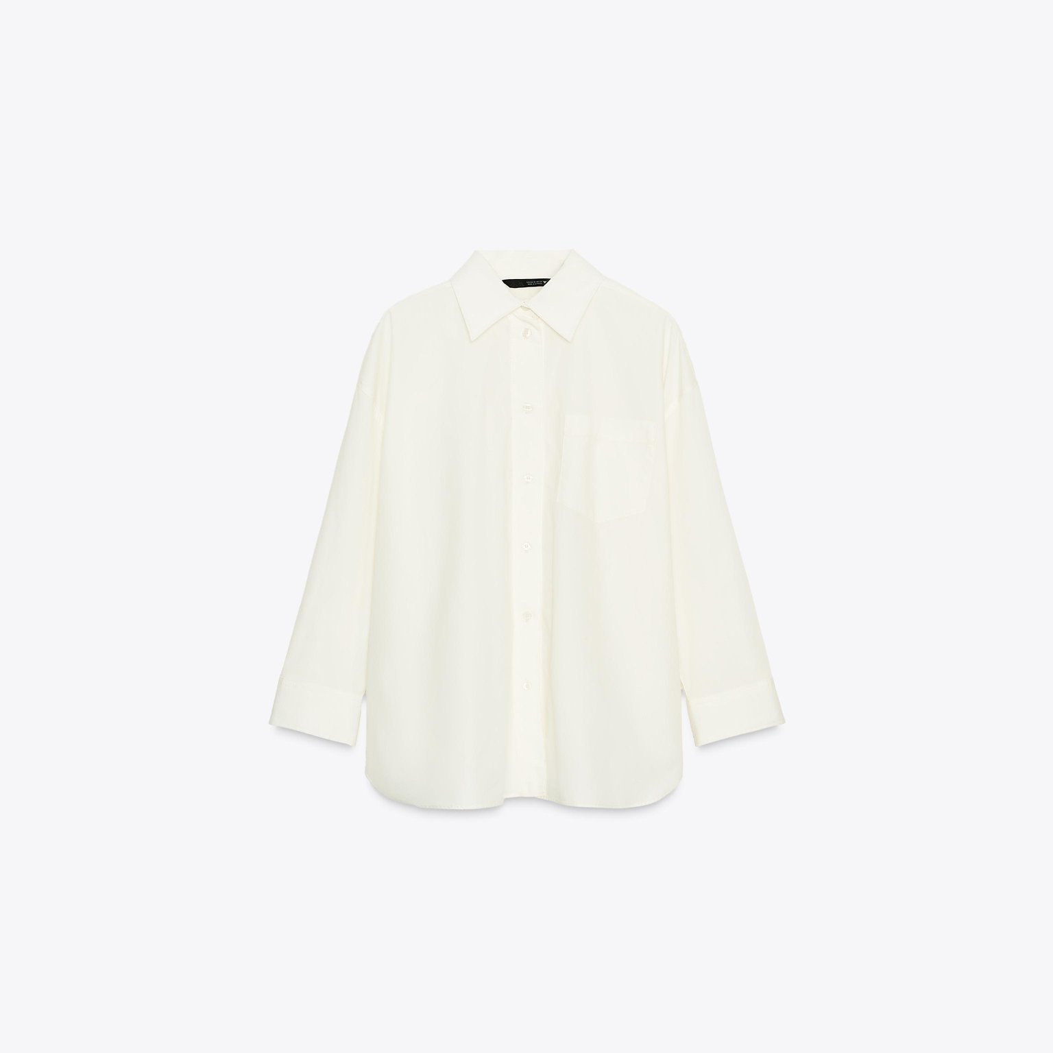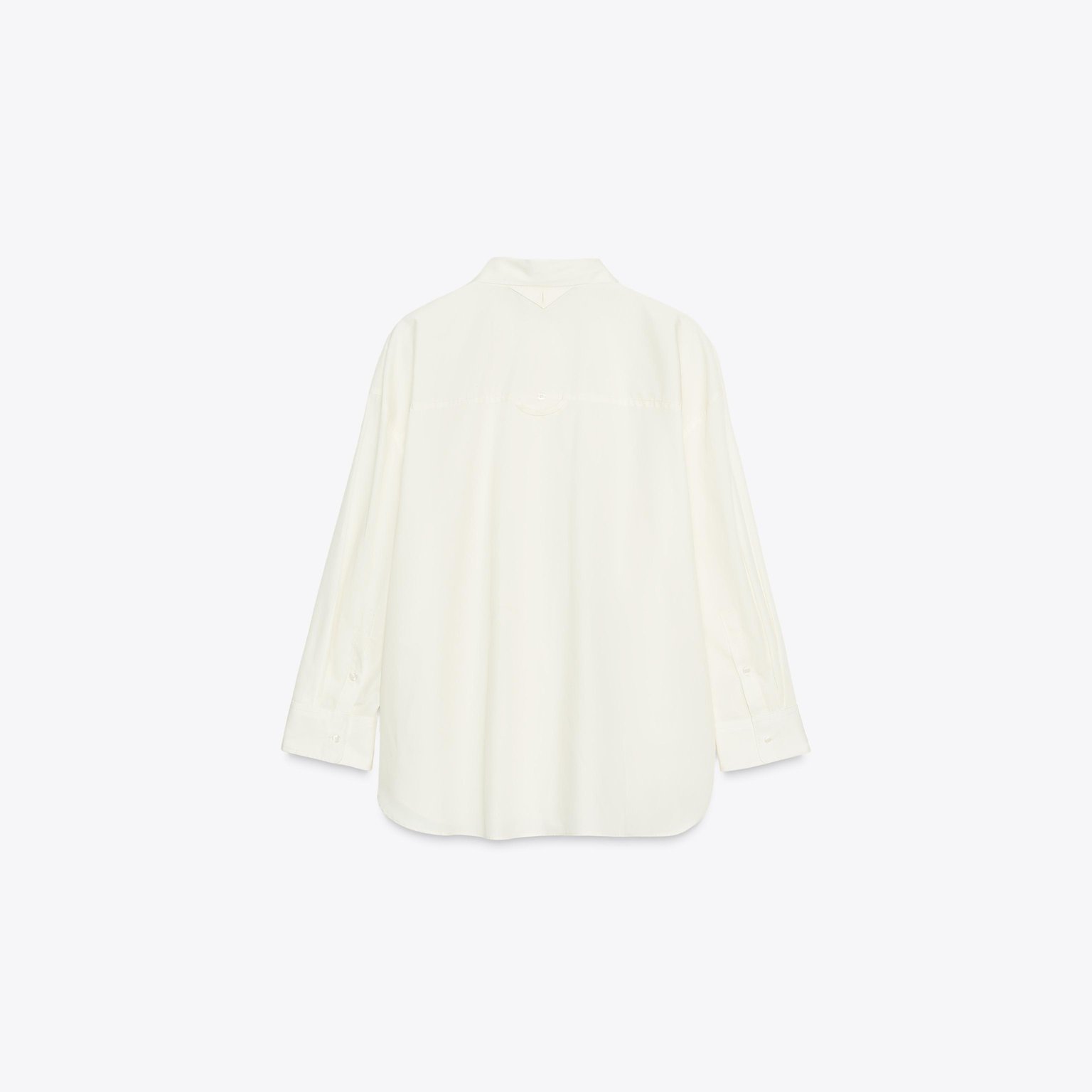 قميص بوبلين واسع بياقة لابيل – لون إيكرُو – Ecru (Poplin Shirt) قميص واسع بتصميم كلاسيكي مريح، يتميز بياقة لابيل وأكمام طويلة تنتهي بكُفّ مطوي يمنح لمسة راقية. يأتي بجيب رقعة على الصدر وتفصيلة حلقة على الظهر تضيف طابعًا عمليًا للتصميم. إغلاق أمامي بأزرار لمظهر نظيف يناسب الإطلالات اليومية والعملية.