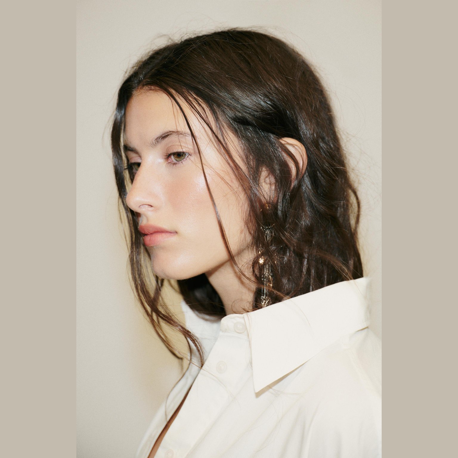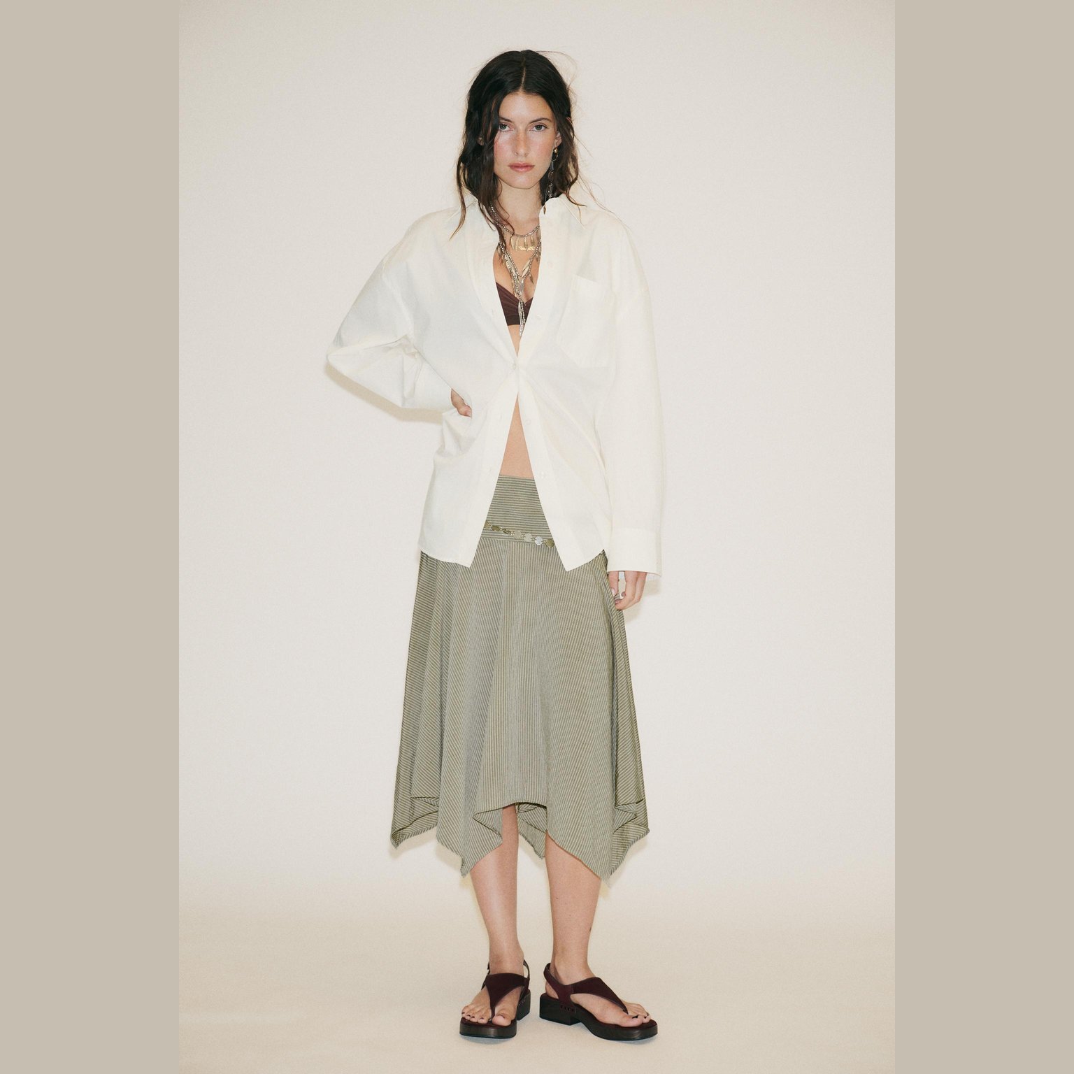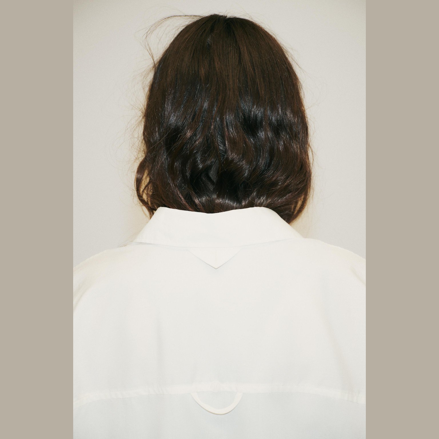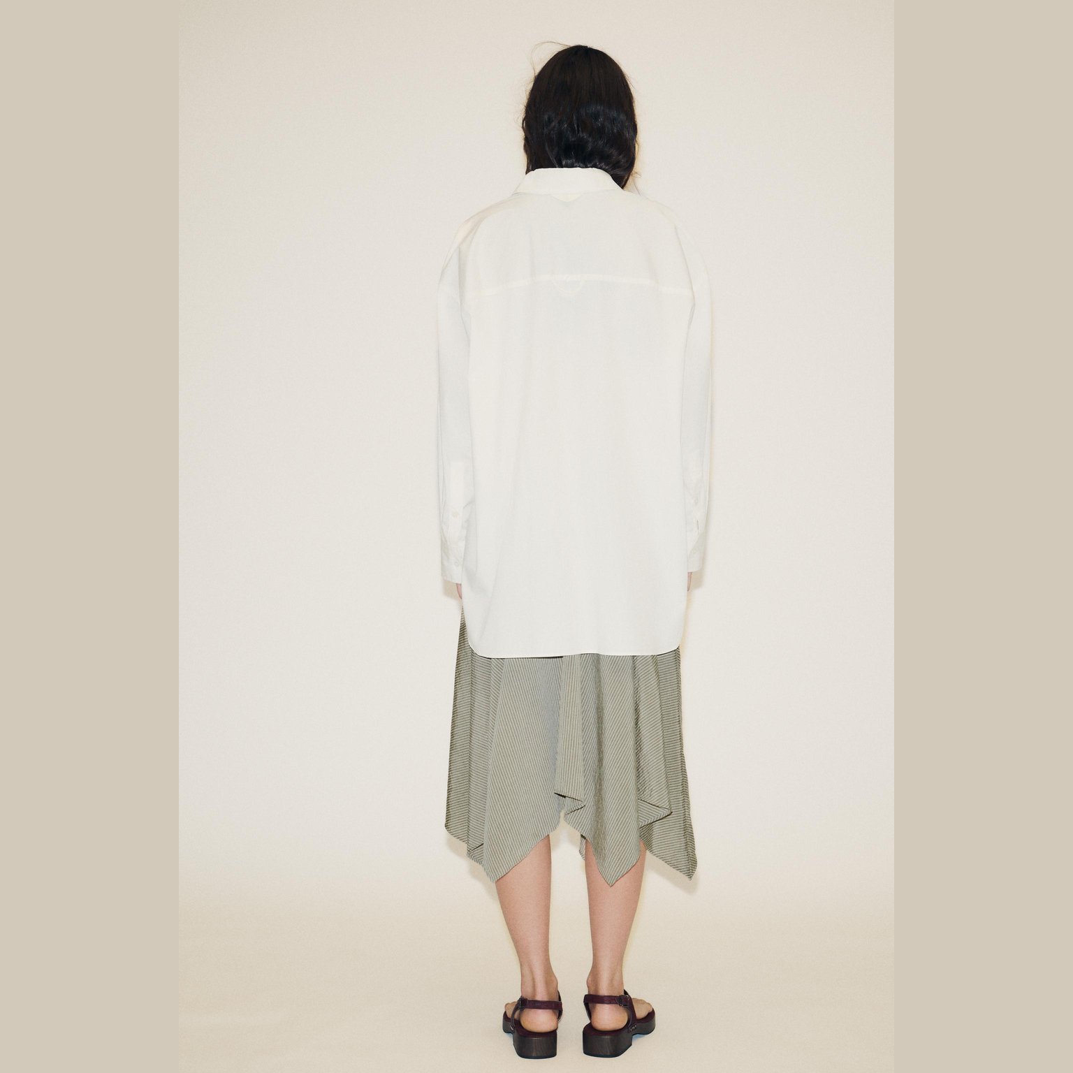 قميص بوبلين واسع بياقة لابيل – لون إيكرُو – Ecru (Poplin Shirt) قميص واسع بتصميم كلاسيكي مريح، يتميز بياقة لابيل وأكمام طويلة تنتهي بكُفّ مطوي يمنح لمسة راقية. يأتي بجيب رقعة على الصدر وتفصيلة حلقة على الظهر تضيف طابعًا عمليًا للتصميم. إغلاق أمامي بأزرار لمظهر نظيف يناسب الإطلالات اليومية والعملية.