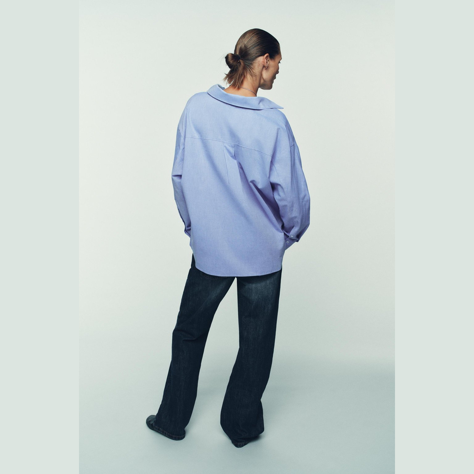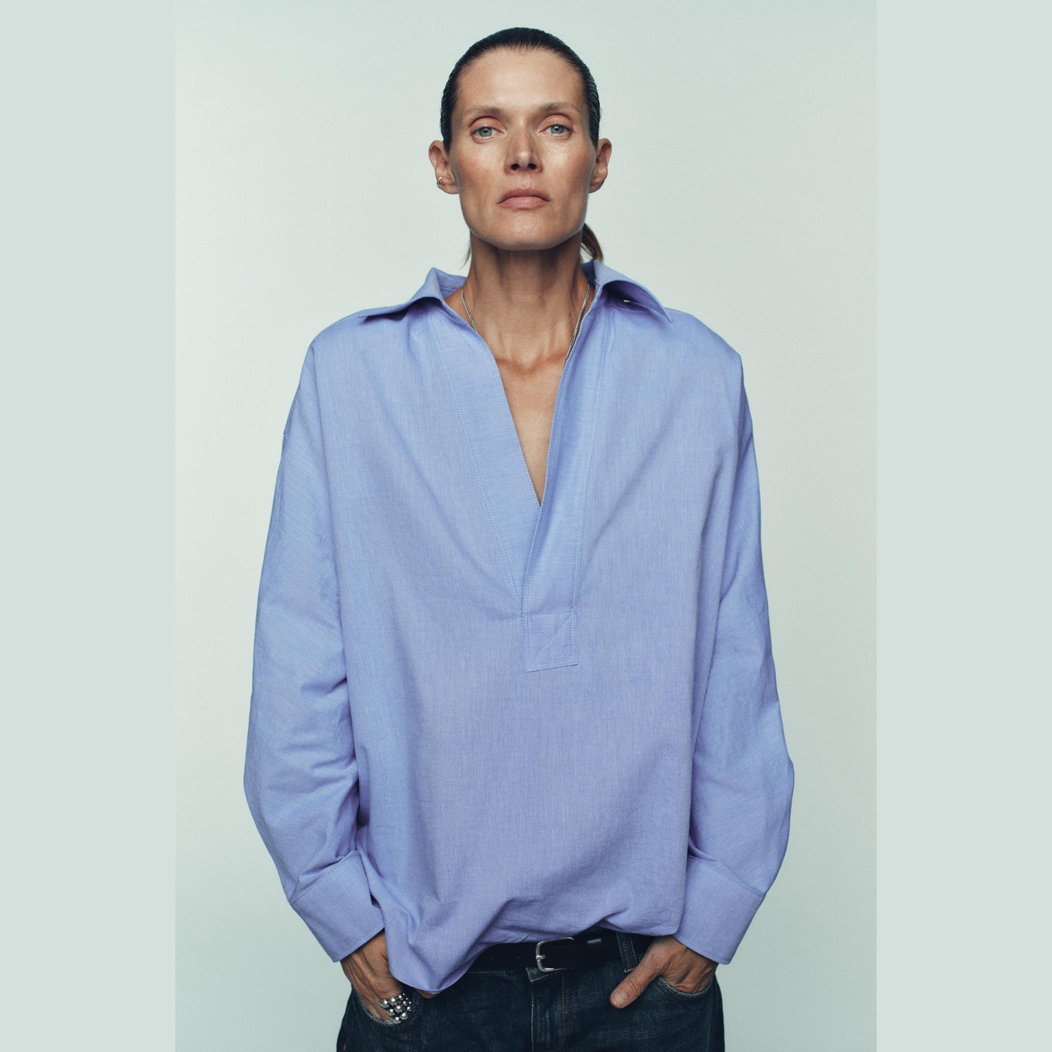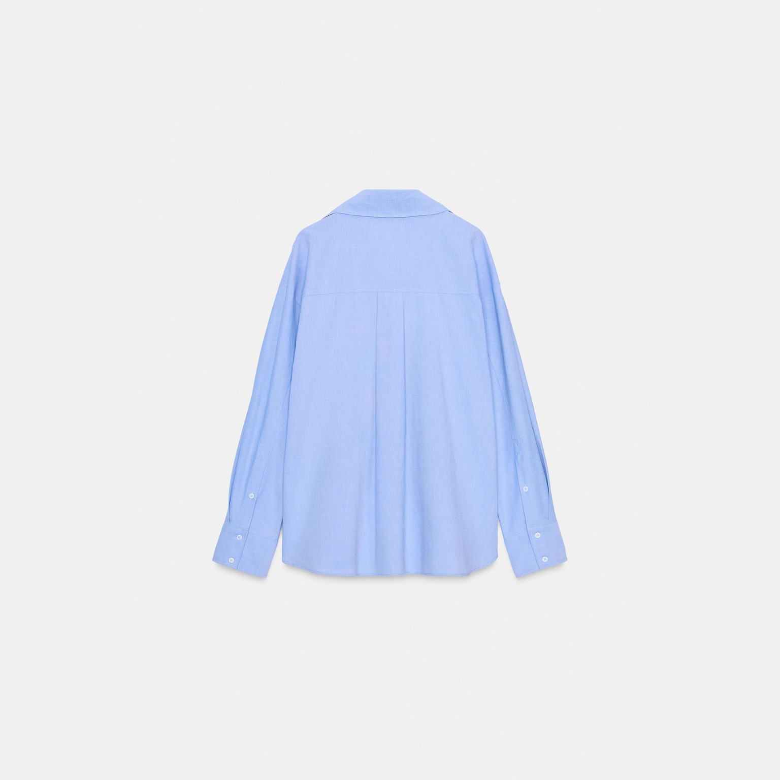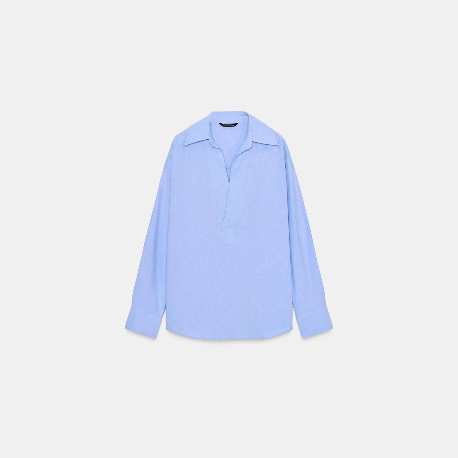 قميص أوكسفورد واسع بياقة V – لون أزرق – Blue (Oversize Oxford Shirt) قميص واسع بتصميم انسيابي مريح، يتميز بياقة V مع ياقة كلاسيكية وأكمام طويلة، إضافة إلى حافة غير متناظرة تمنح حركة جميلة للتصميم. خامته القطنية تمنح راحة طوال اليوم، مما يجعله خيارًا مثاليًا للإطلالات اليومية والكاجوال الأنيقة.