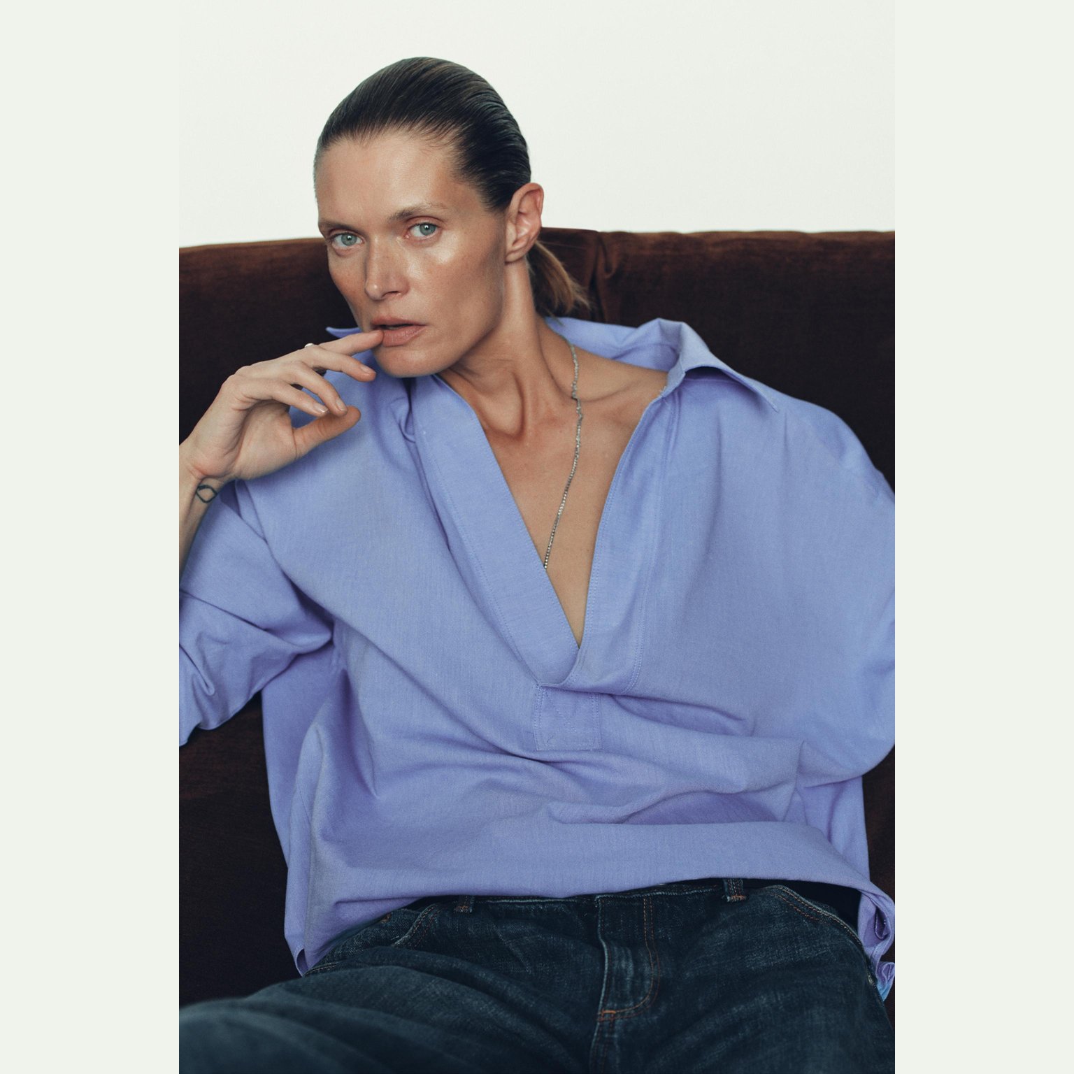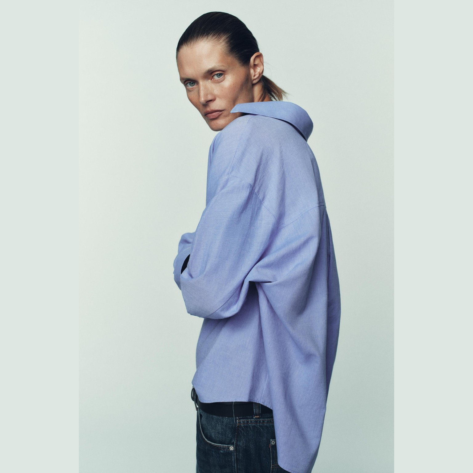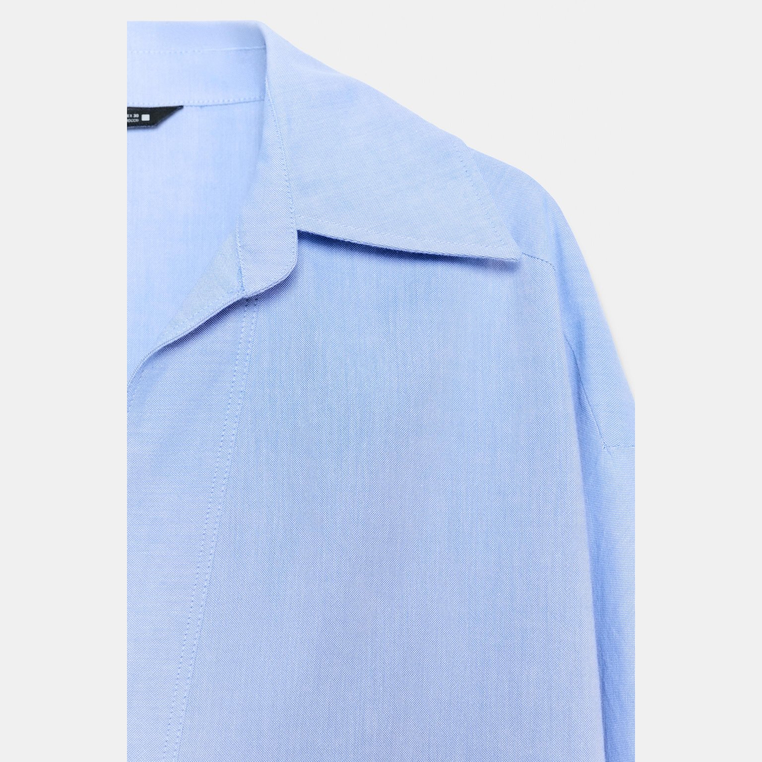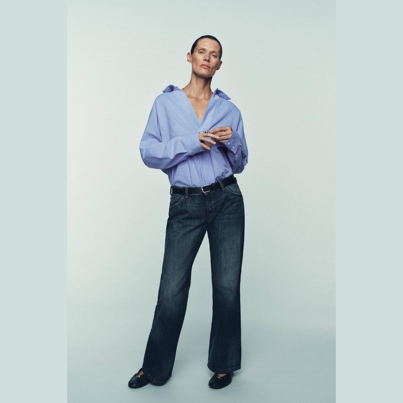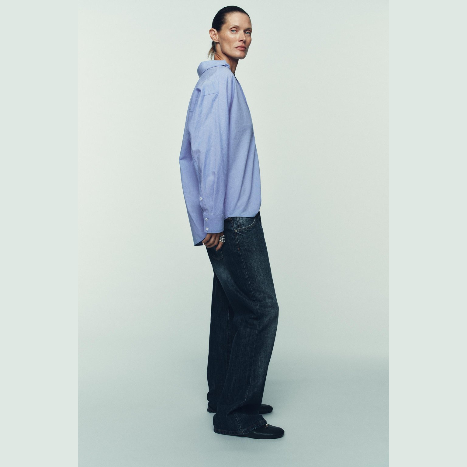 قميص أوكسفورد واسع بياقة V – لون أزرق – Blue (Oversize Oxford Shirt) قميص واسع بتصميم انسيابي مريح، يتميز بياقة V مع ياقة كلاسيكية وأكمام طويلة، إضافة إلى حافة غير متناظرة تمنح حركة جميلة للتصميم. خامته القطنية تمنح راحة طوال اليوم، مما يجعله خيارًا مثاليًا للإطلالات اليومية والكاجوال الأنيقة.