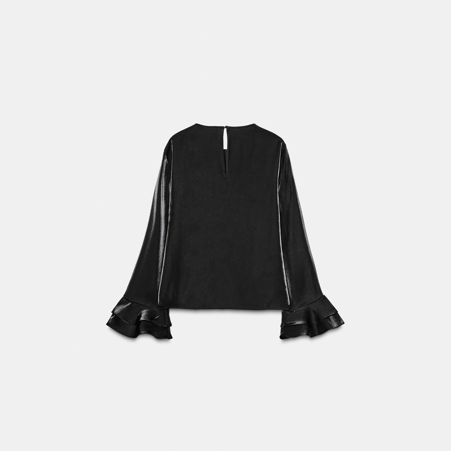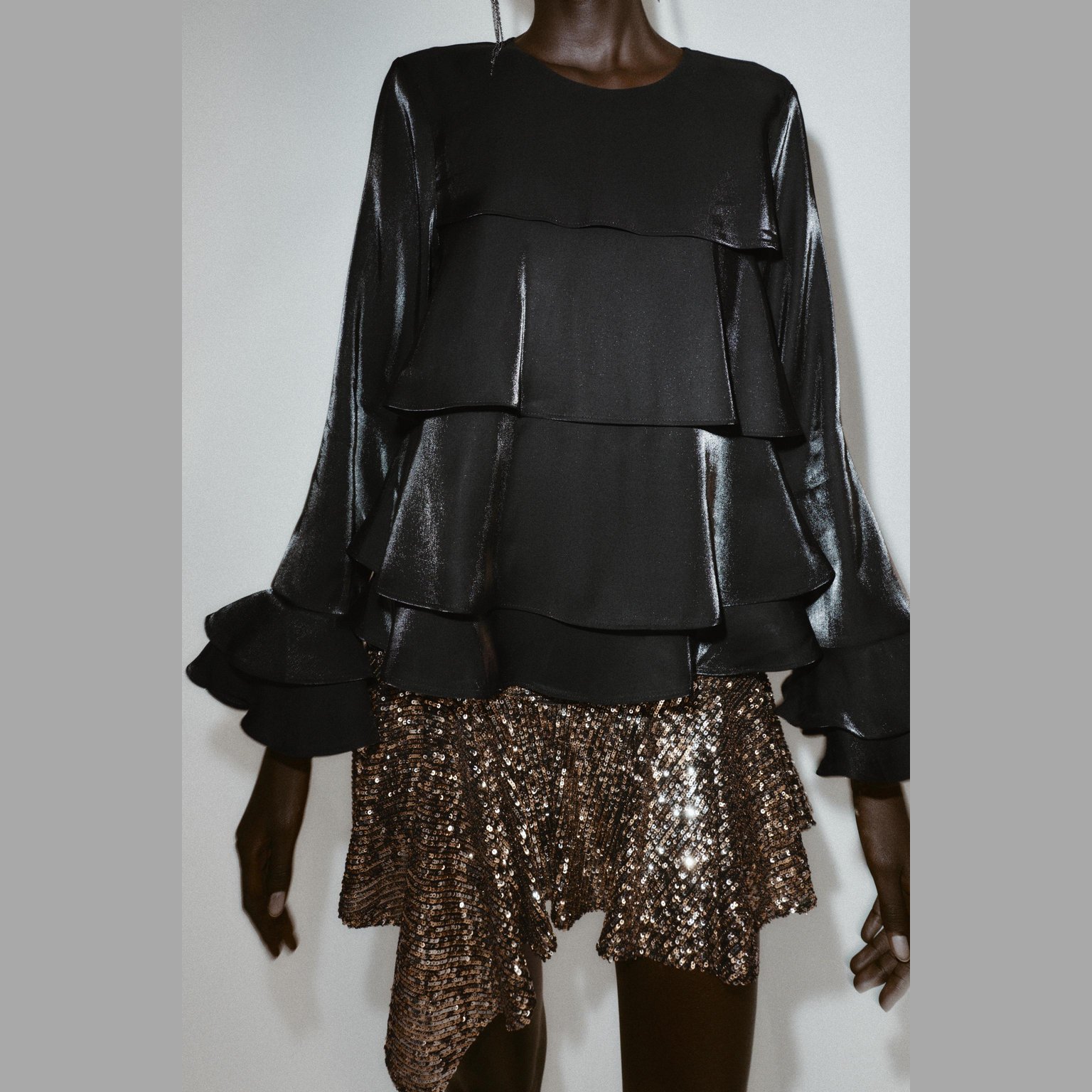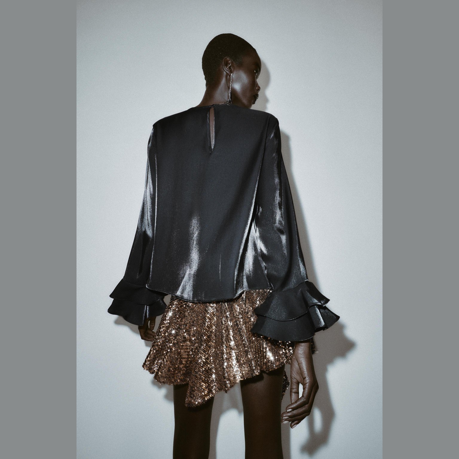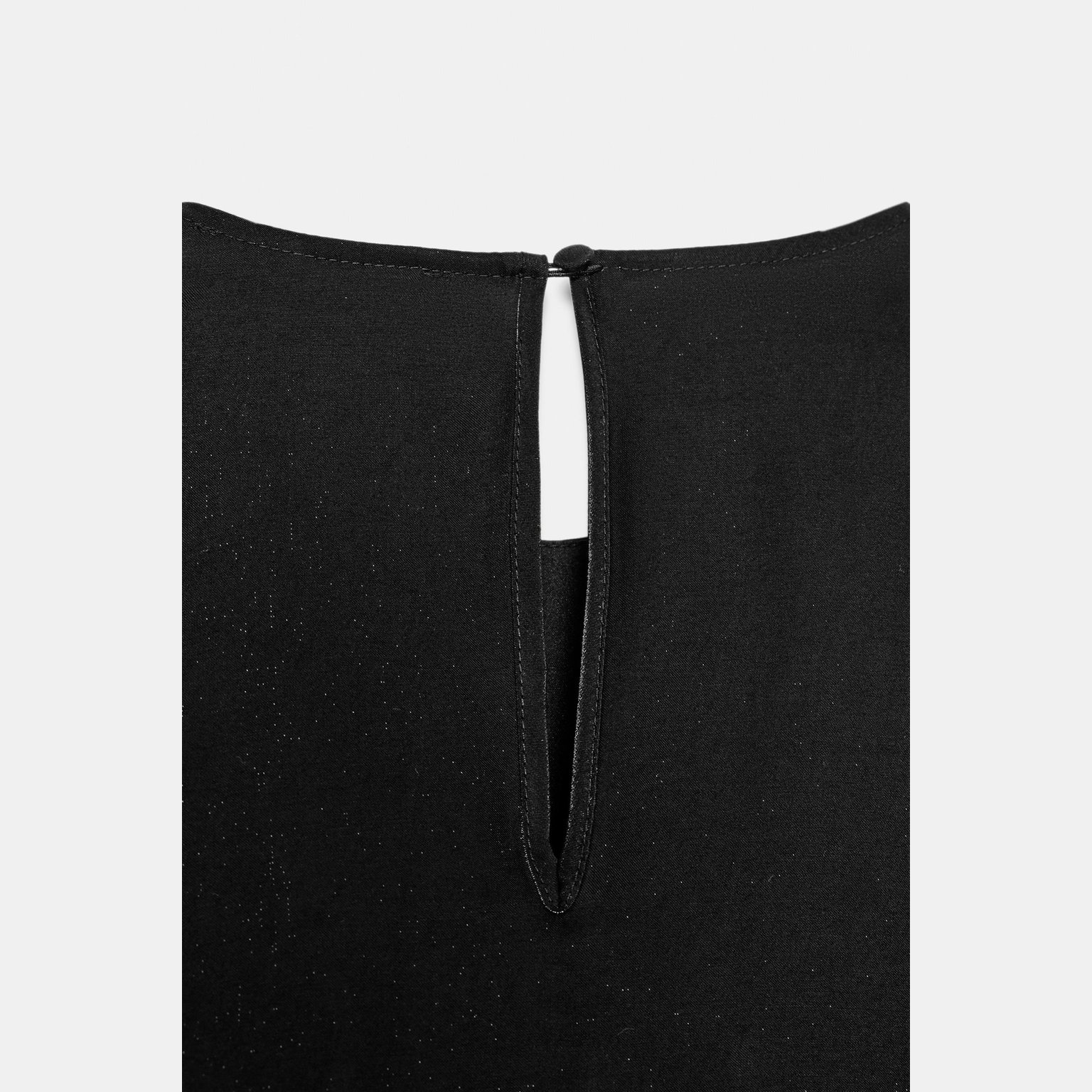 بلوزة قماش لامع مع كشكش – لون أسود – Black (Shimmer Fabric Ruffled Blouse) بلوزة أنيقة بتصميم عصري، تتميز بياقة دائرية وأكمام طويلة، مصنوعة من قماش لامع يمنح لمسة فاخرة. مزودة بكشكش يضيف حركة وانسيابية للتصميم، مع إغلاق خلفي بزر لمظهر نظيف وراقي يناسب الإطلالات اليومية والأنيقة.