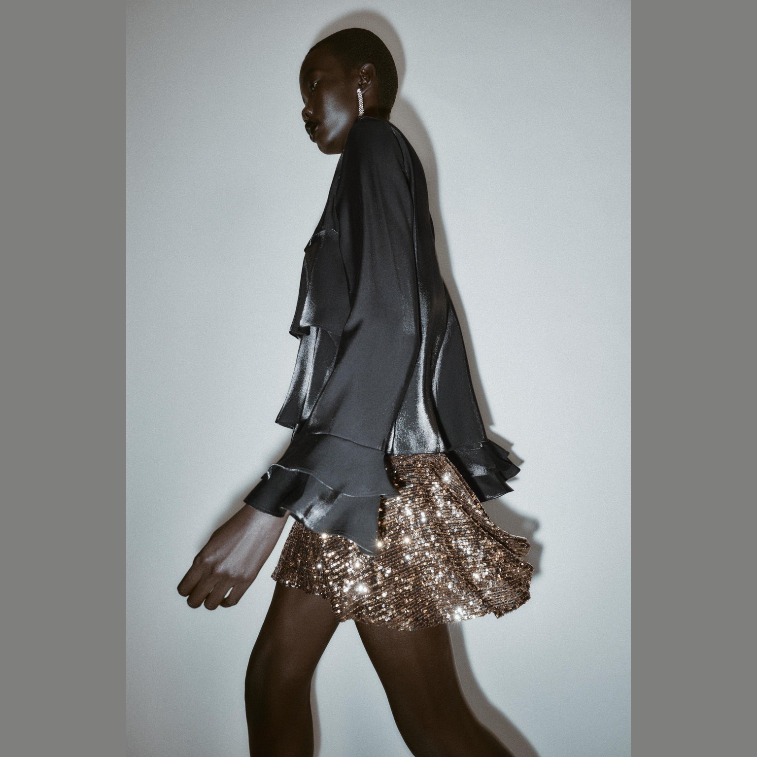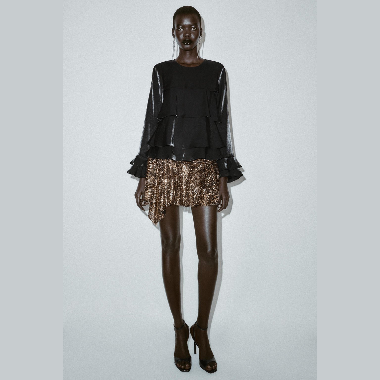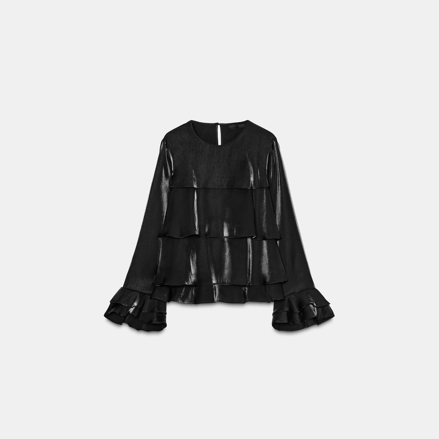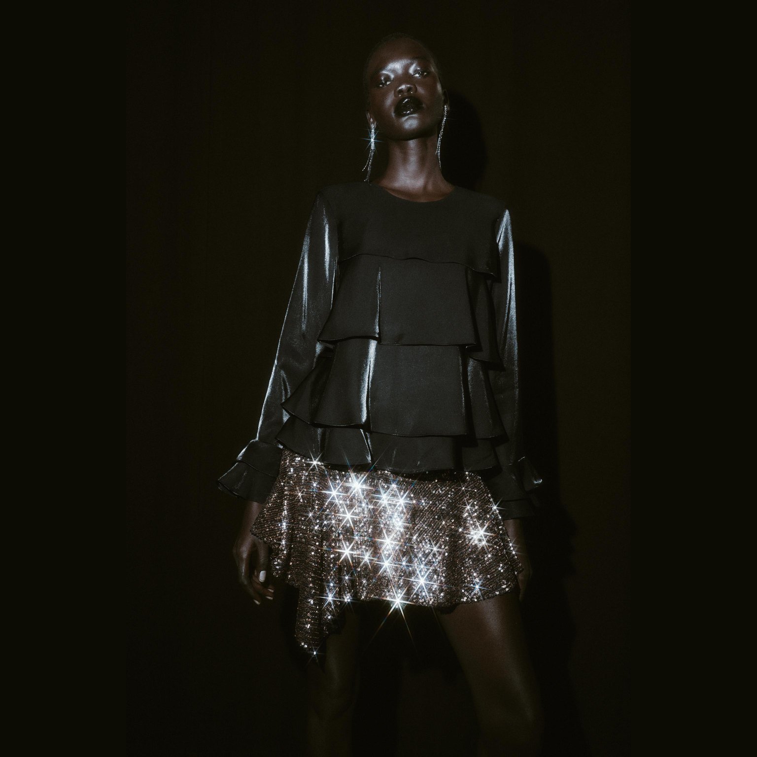 بلوزة قماش لامع مع كشكش – لون أسود – Black (Shimmer Fabric Ruffled Blouse) بلوزة أنيقة بتصميم عصري، تتميز بياقة دائرية وأكمام طويلة، مصنوعة من قماش لامع يمنح لمسة فاخرة. مزودة بكشكش يضيف حركة وانسيابية للتصميم، مع إغلاق خلفي بزر لمظهر نظيف وراقي يناسب الإطلالات اليومية والأنيقة.