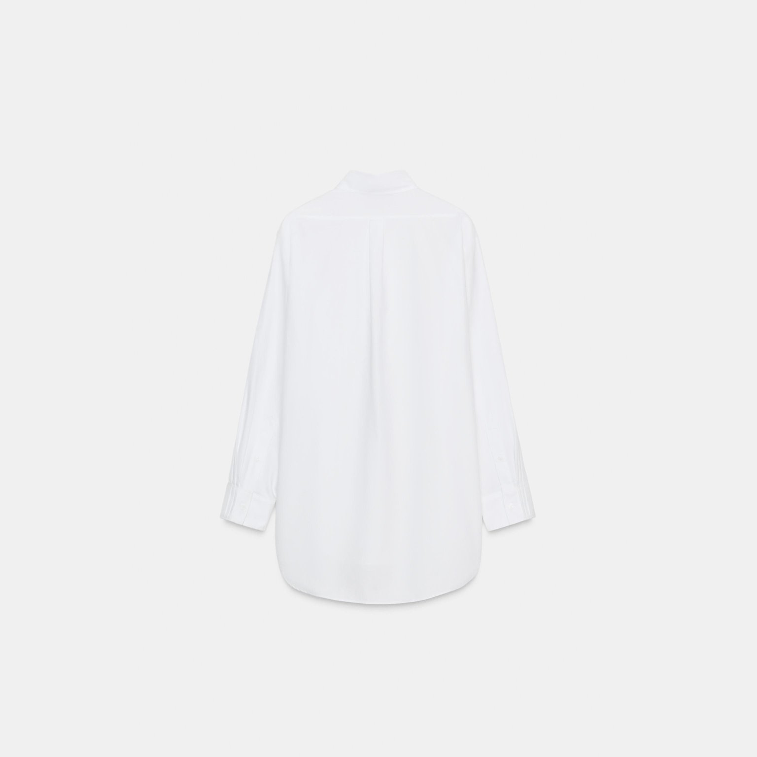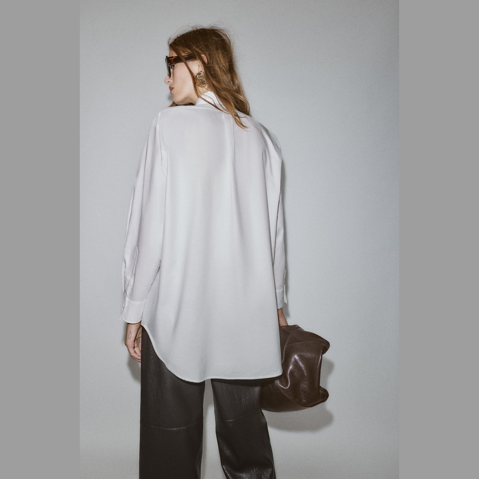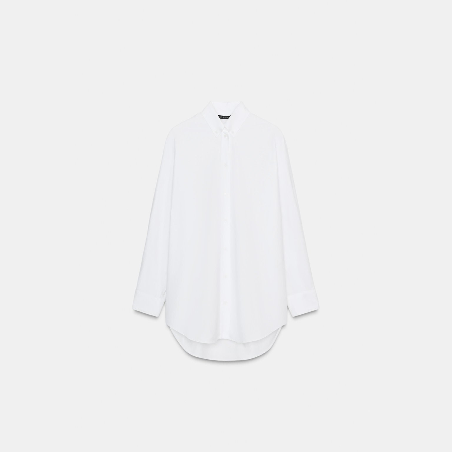 قميص أوكسفورد واسع بياقة كلاسيكية – لون أبيض – White (Oversize Oxford Shirt) قميص واسع بتصميم عصري مريح، يتميز بياقة كلاسيكية وأكمام طويلة مع أساور مطوية تمنح لمسة راقية. يأتي بحافة غير متناظرة تضيف انسيابية جميلة، إضافة إلى إغلاق أمامي بأزرار لمظهر نظيف يناسب الإطلالات اليومية والكاجوال الأنيقة.