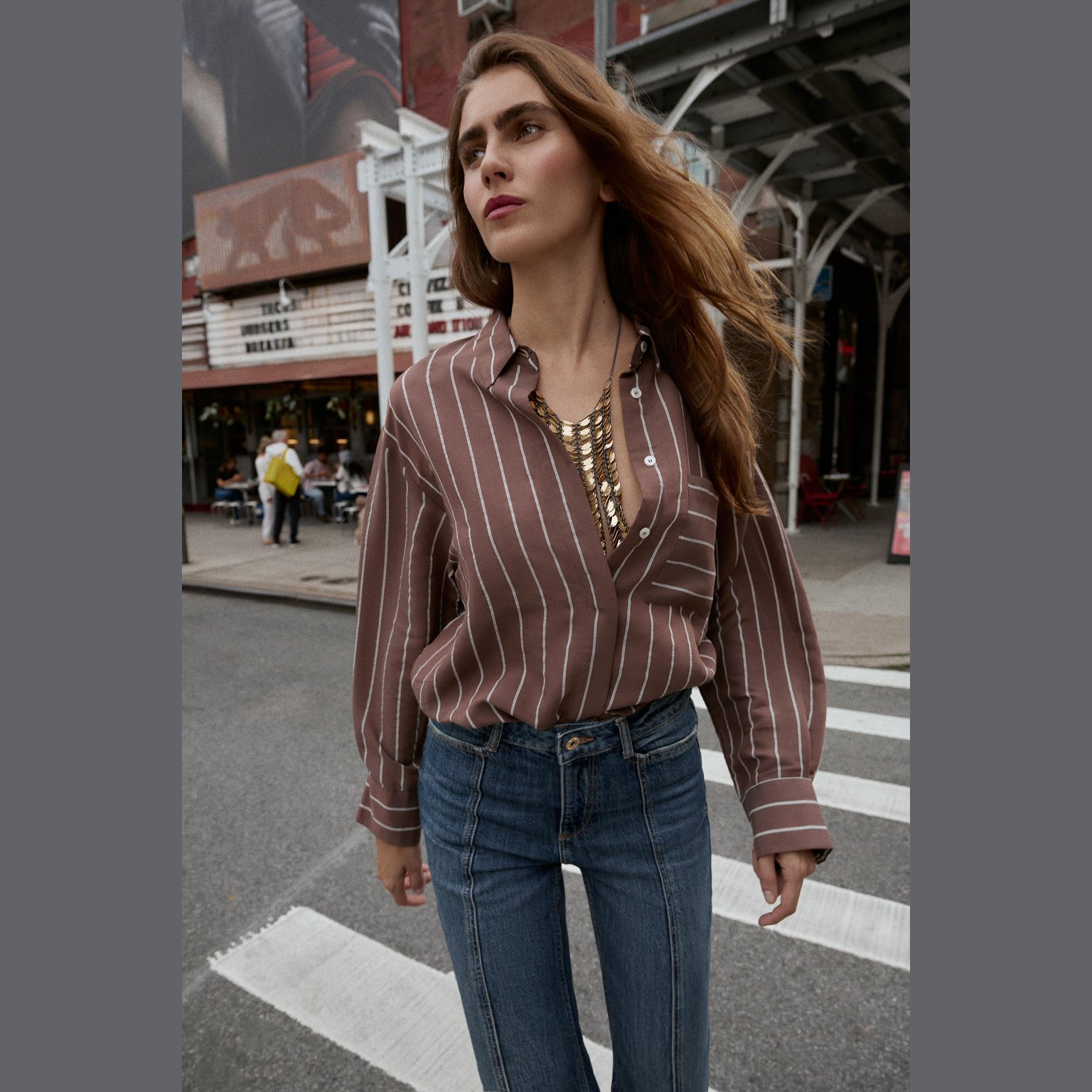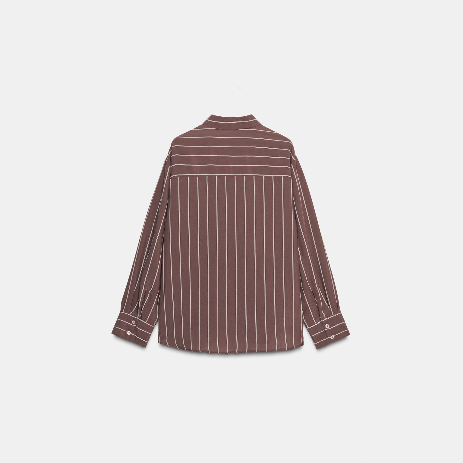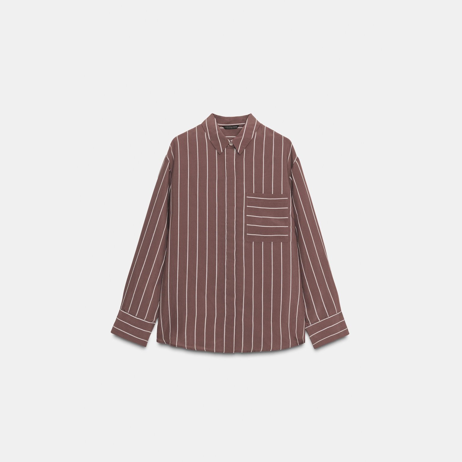 قميص مخطط بقصة انسيابية مع ياقة لابيل وجيب أمامي – لون بني/إيكرُو – Brown/Ecru (Striped Shirt with Pocket) قميص انسيابي بتصميم كلاسيكي أنيق، يتميز بياقة لابيل وأكمام طويلة، مع جيب رقعة أمامي يضيف لمسة عملية. يأتي بإغلاق أمامي بأزرار مخفية داخل السطرة لمظهر نظيف وراقي يناسب الإطلالات اليومية والكاجوال الأنيقة.