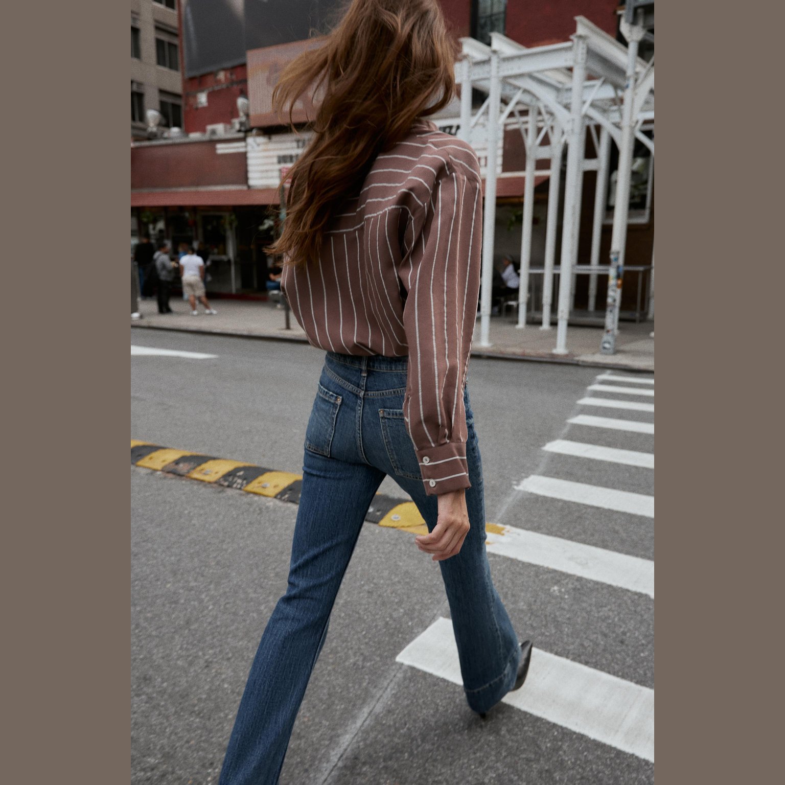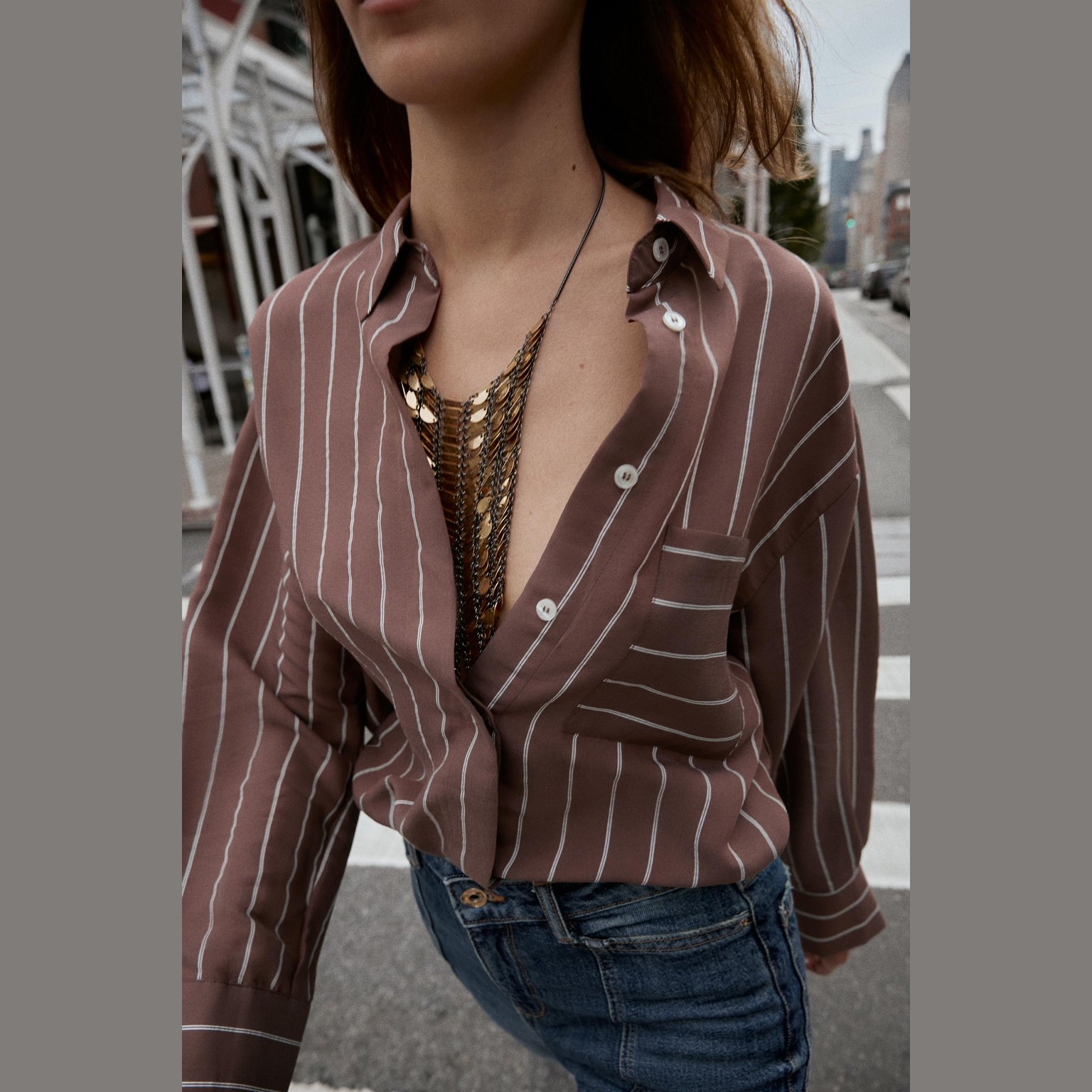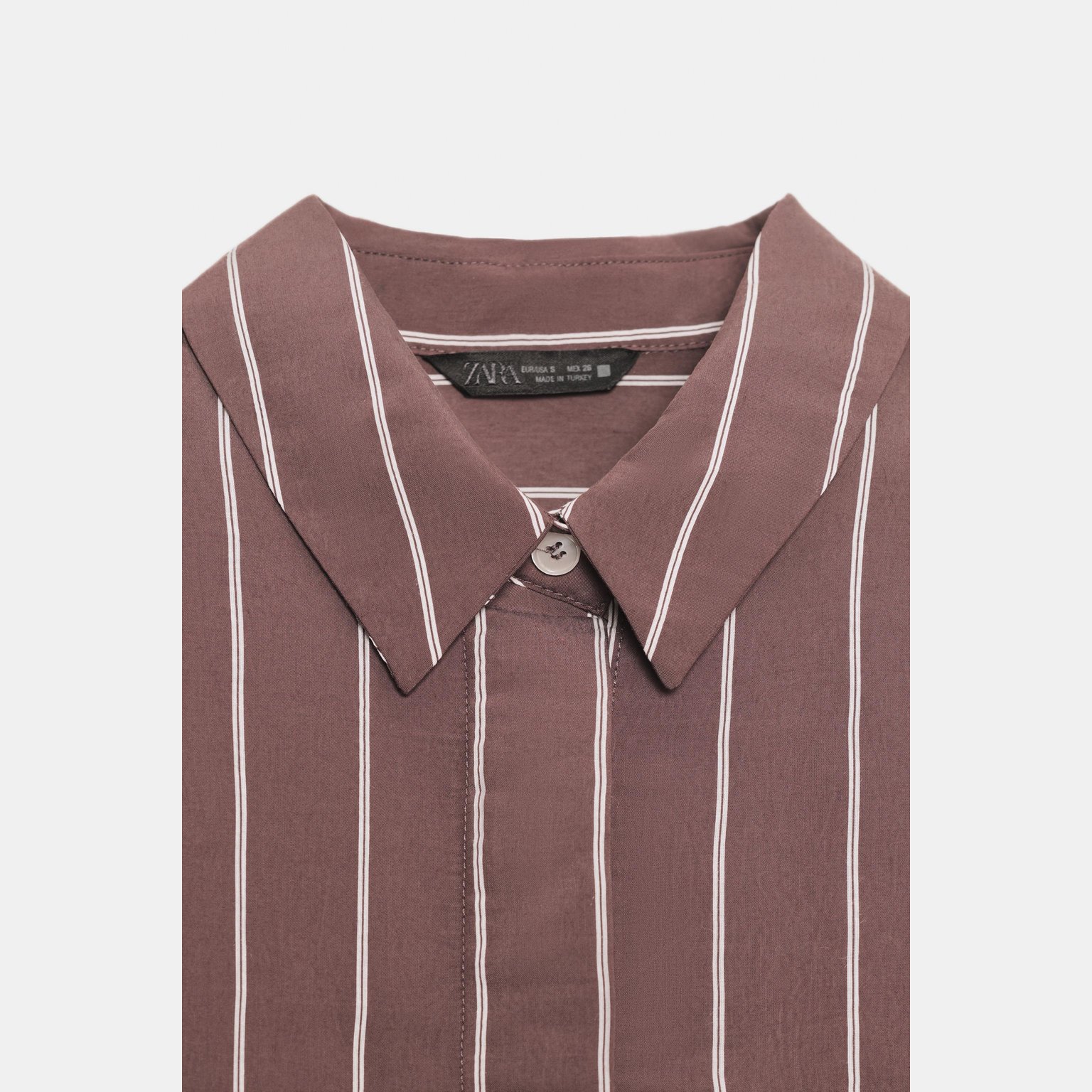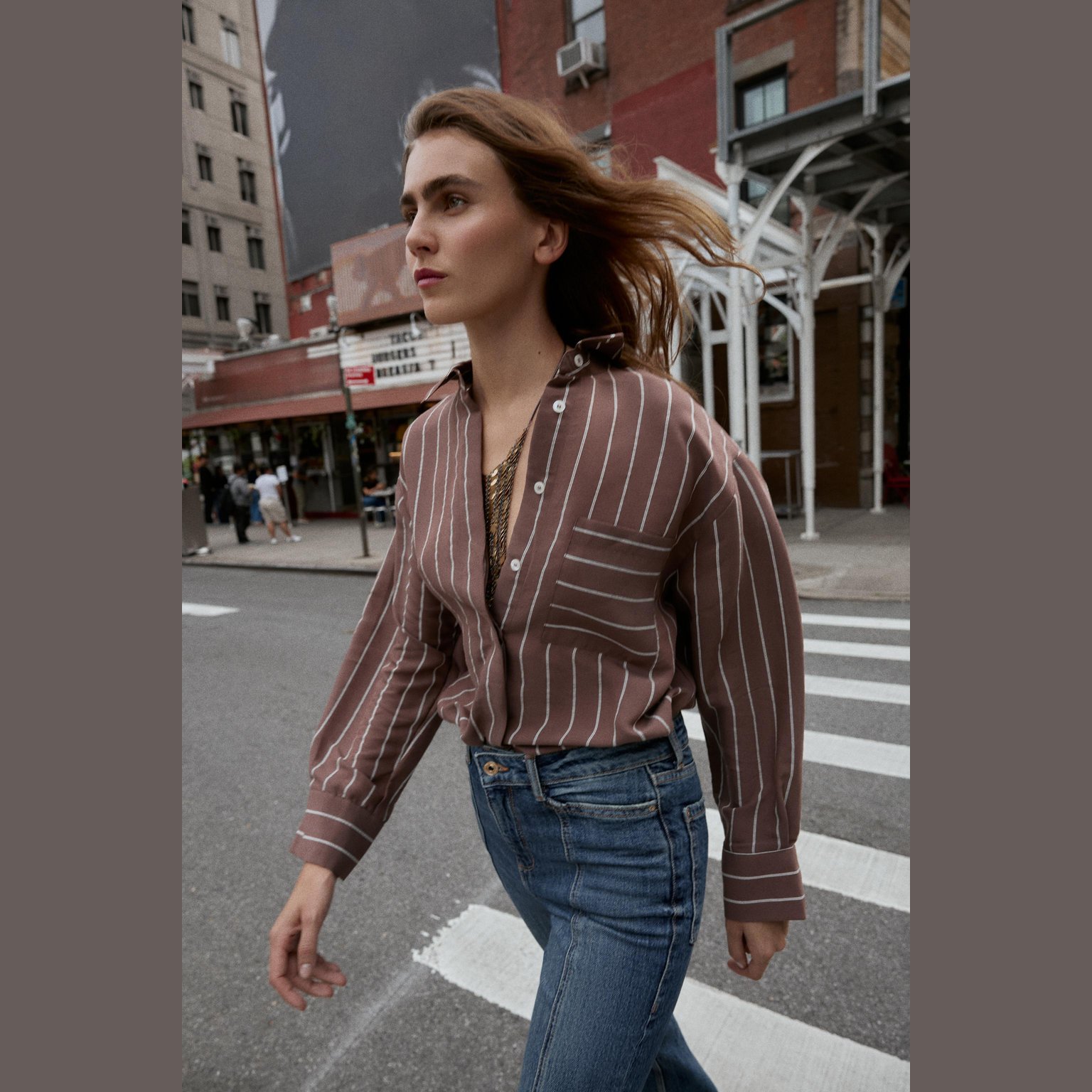 قميص مخطط بقصة انسيابية مع ياقة لابيل وجيب أمامي – لون بني/إيكرُو – Brown/Ecru (Striped Shirt with Pocket) قميص انسيابي بتصميم كلاسيكي أنيق، يتميز بياقة لابيل وأكمام طويلة، مع جيب رقعة أمامي يضيف لمسة عملية. يأتي بإغلاق أمامي بأزرار مخفية داخل السطرة لمظهر نظيف وراقي يناسب الإطلالات اليومية والكاجوال الأنيقة.