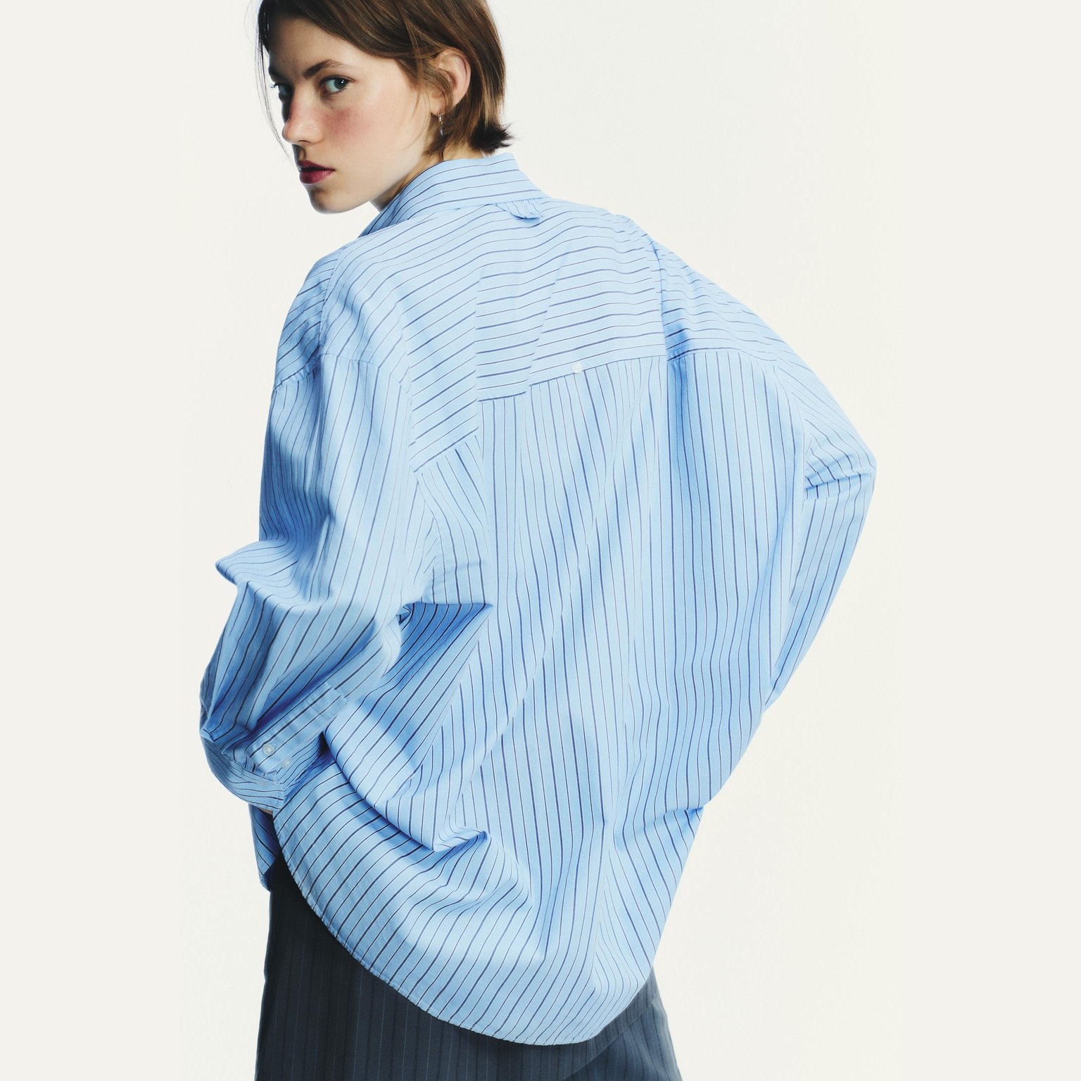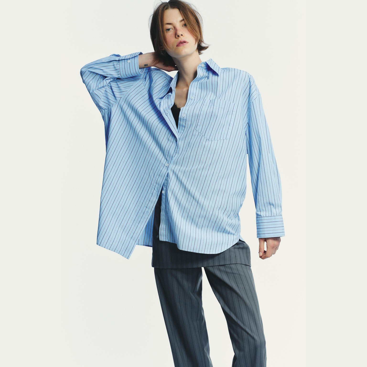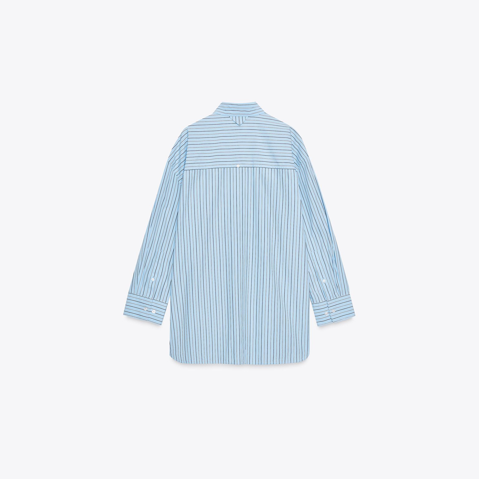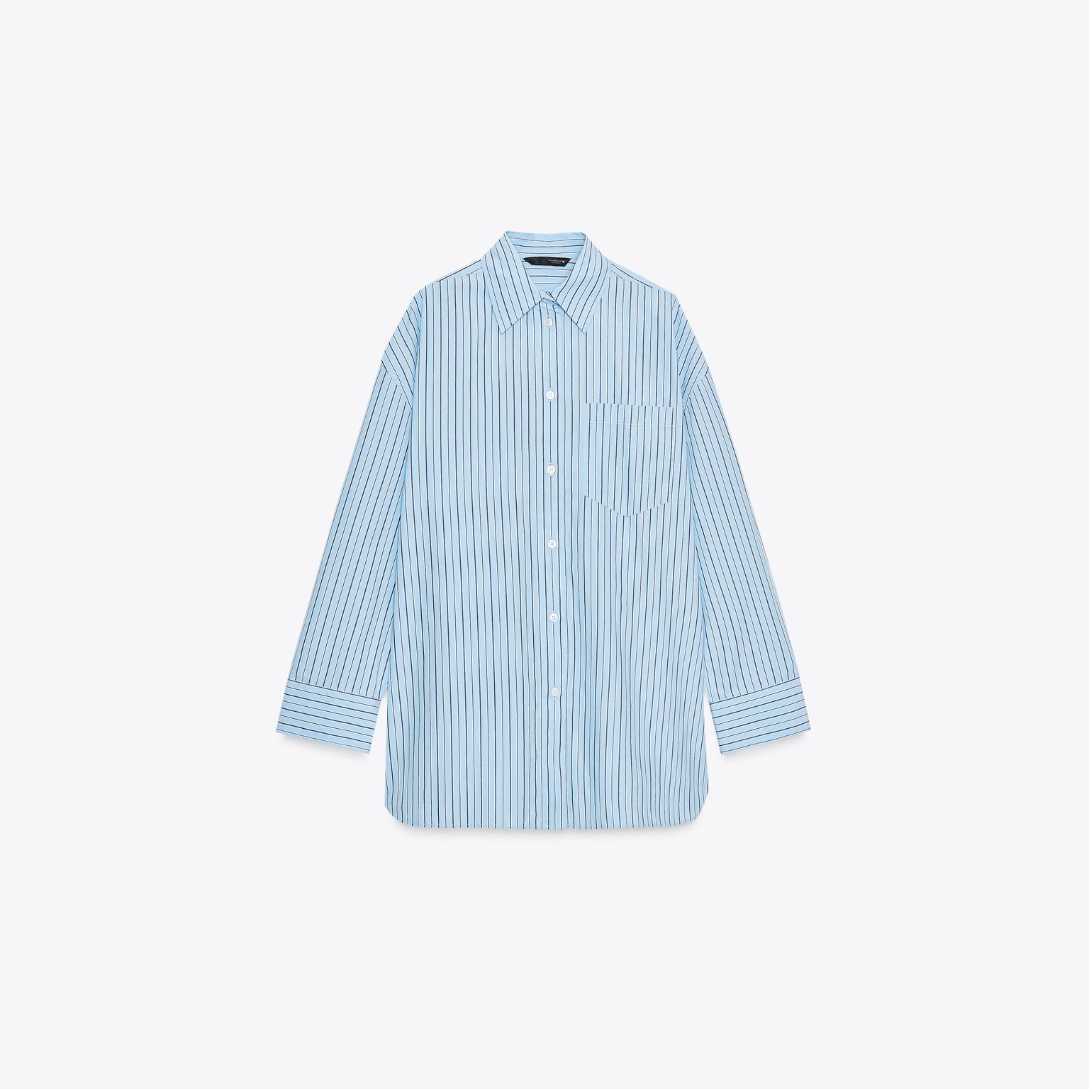 قميص بوبلين مخطط واسع بياقة كلاسيكية – لون أزرق/كحلي – Blue/Navy (Oversize Striped Poplin Shirt) قميص واسع بتصميم عصري مريح، يتميز بياقة كلاسيكية وأكمام طويلة مع كُفّ منخفض على الكتف يمنح مظهرًا انسيابيًا. يأتي بجيب رقعة أمامي وإغلاق كامل بأزرار، مما يجعله خيارًا مثاليًا للإطلالات اليومية والكاجوال الأنيقة.