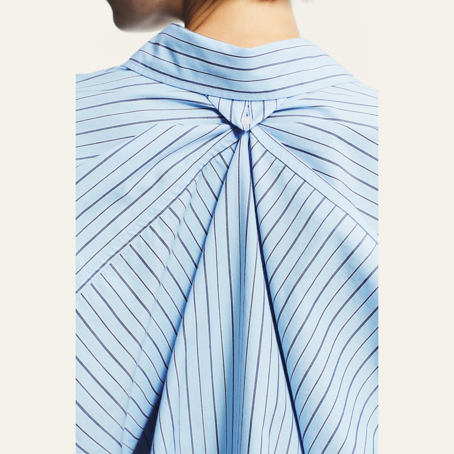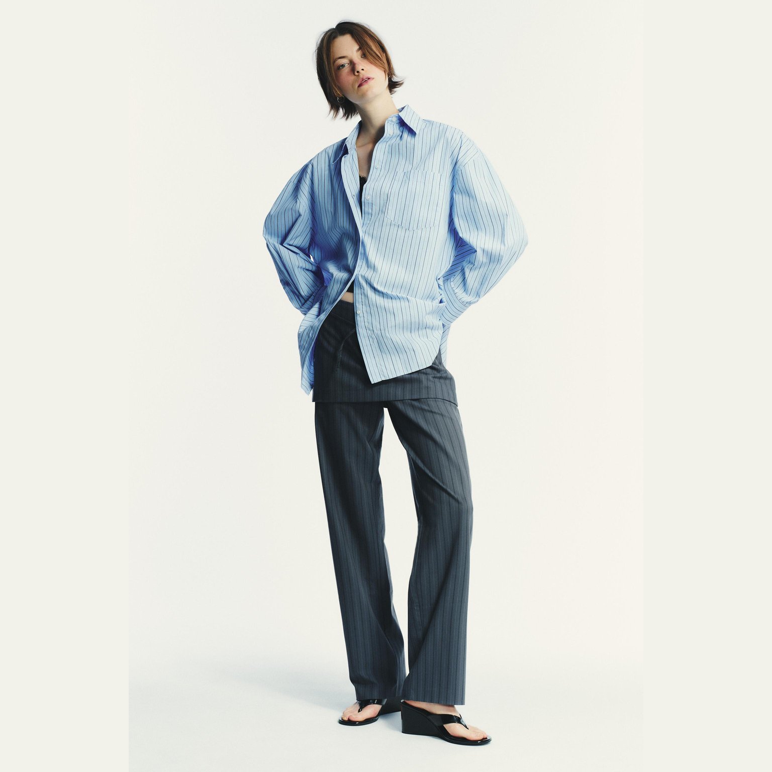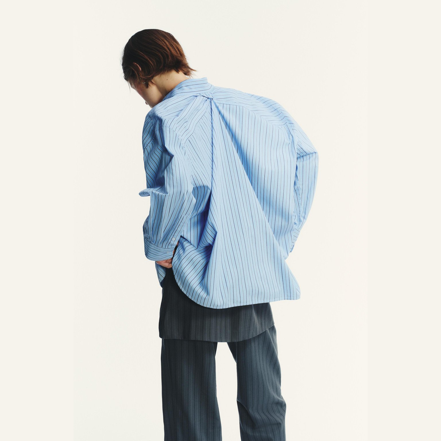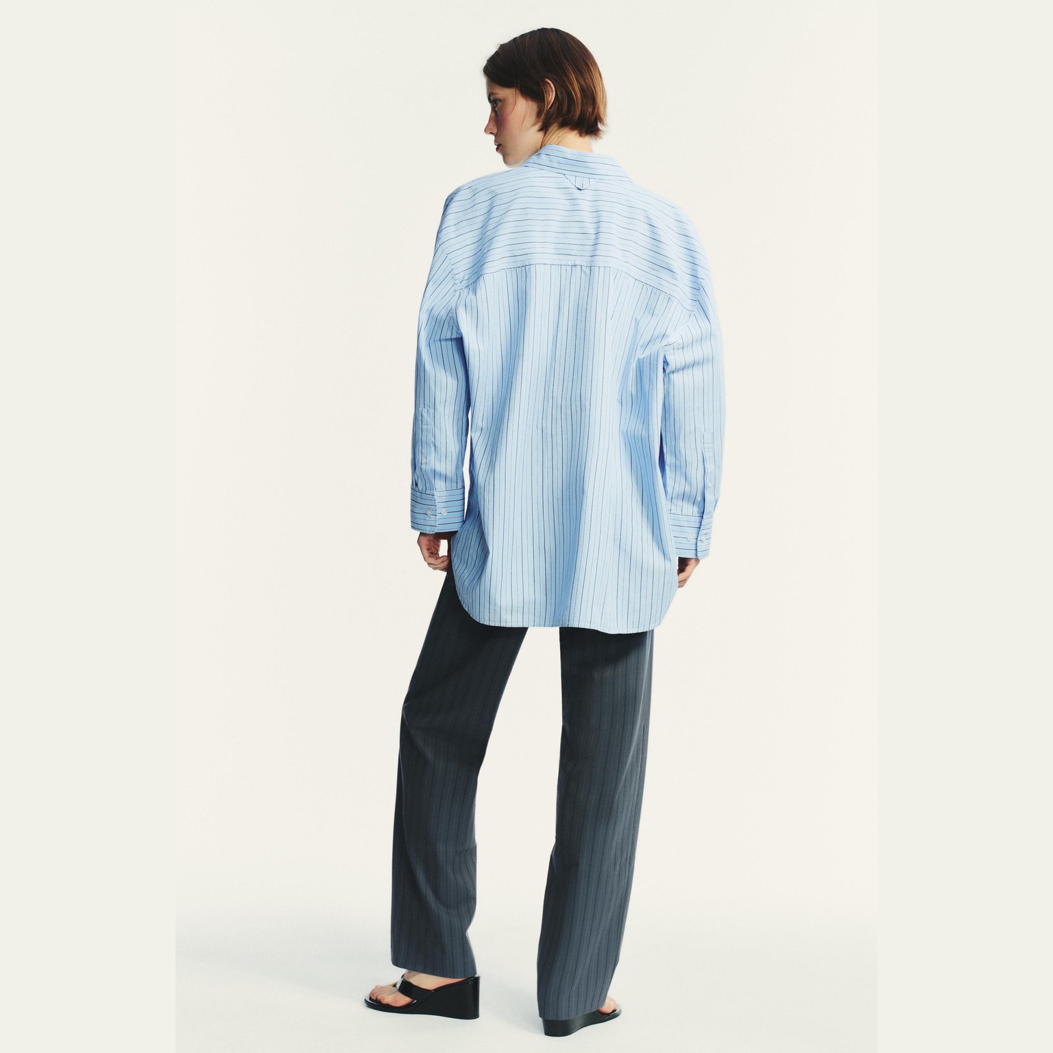 قميص بوبلين مخطط واسع بياقة كلاسيكية – لون أزرق/كحلي – Blue/Navy (Oversize Striped Poplin Shirt) قميص واسع بتصميم عصري مريح، يتميز بياقة كلاسيكية وأكمام طويلة مع كُفّ منخفض على الكتف يمنح مظهرًا انسيابيًا. يأتي بجيب رقعة أمامي وإغلاق كامل بأزرار، مما يجعله خيارًا مثاليًا للإطلالات اليومية والكاجوال الأنيقة.