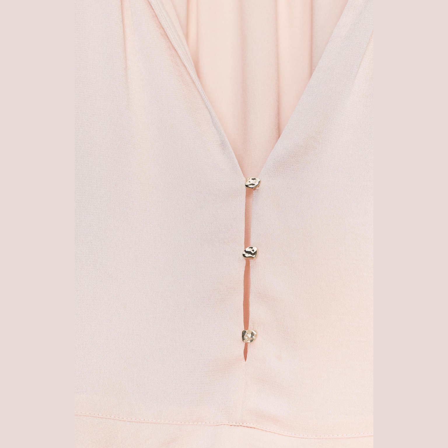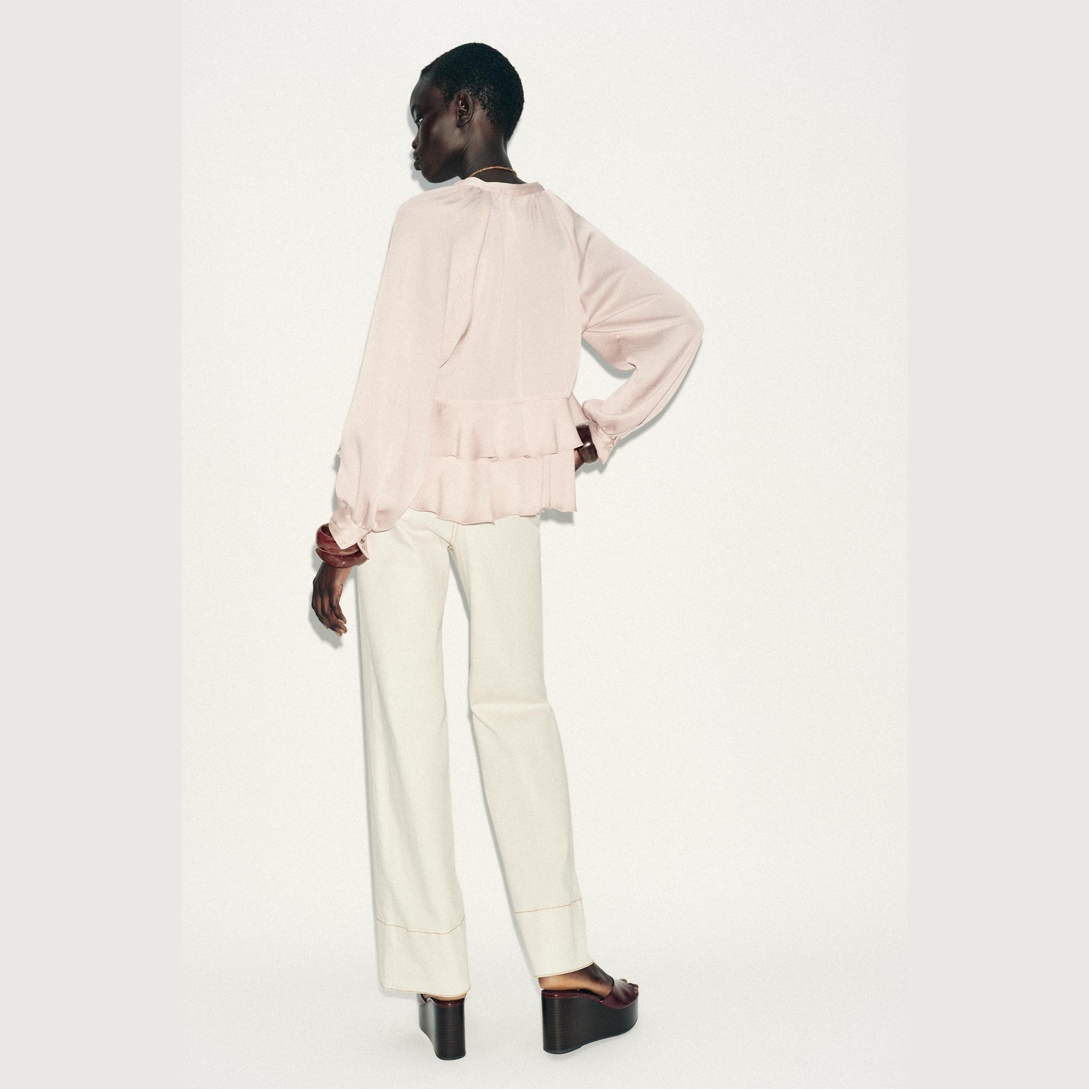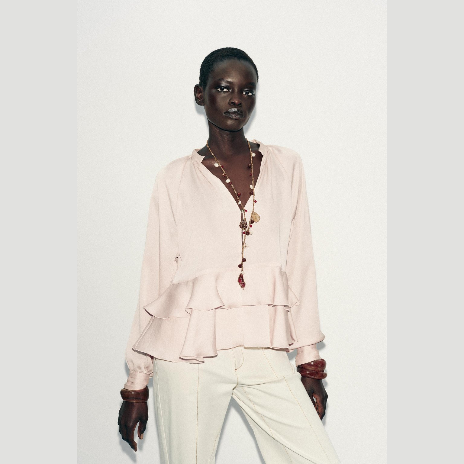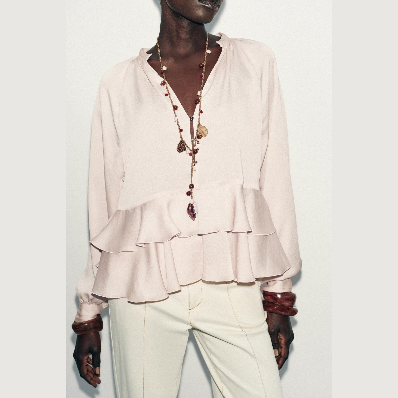 بلوزة بكشكش مع ياقة دائرية وفتحة V وأزرار معدنية – لون بيج‑وردي – Beige‑Pink (Ruffled Blouse) بلوزة أنيقة بتصميم ناعم، تتميز بياقة دائرية مع فتحة V وإغلاق أمامي بأزرار معدنية تضيف لمسة عصرية. تأتي بأكمام طويلة مع أساور بكسرات، إضافة إلى كشكش رقيق يمنح حركة وانسيابية للتصميم، مما يجعلها خيارًا مثاليًا للإطلالات اليومية والكاجوال الأنيقة.