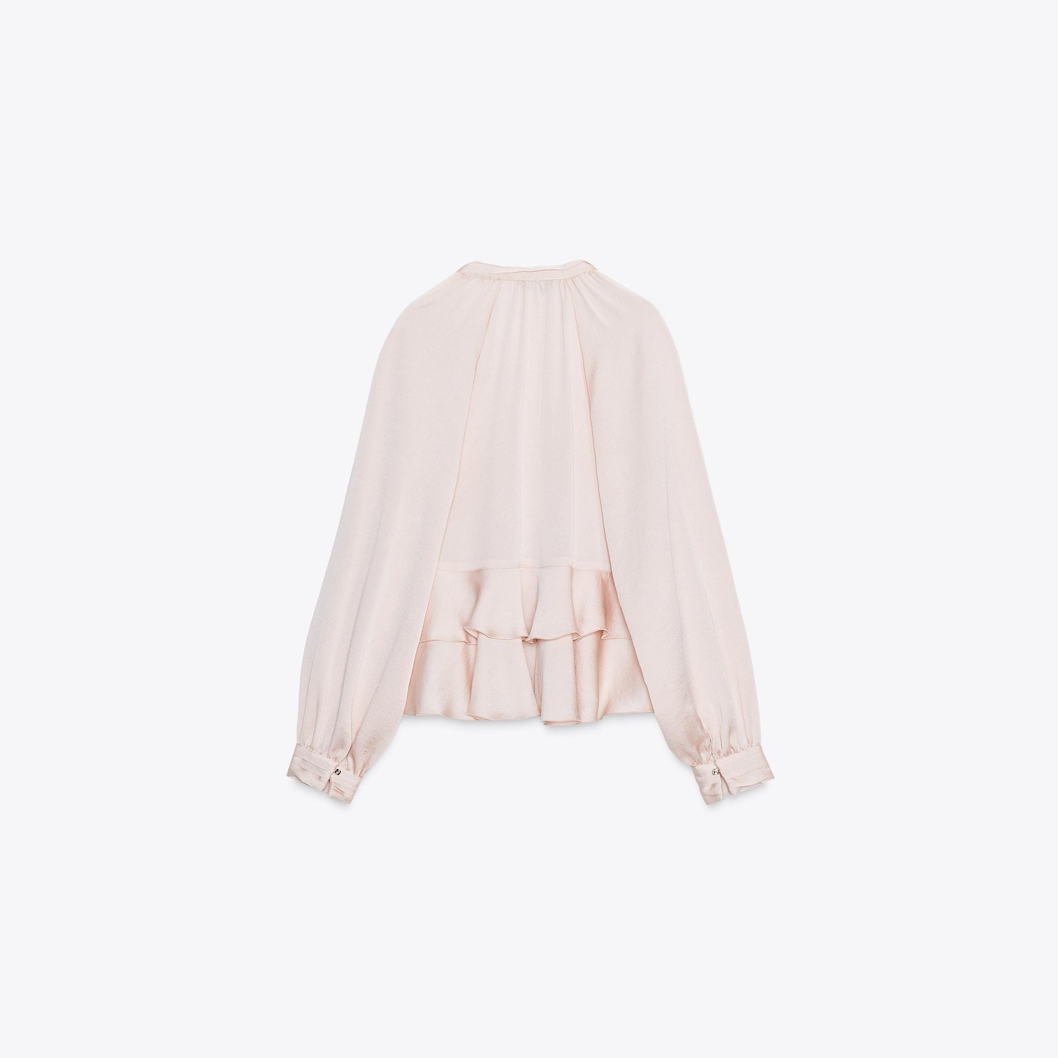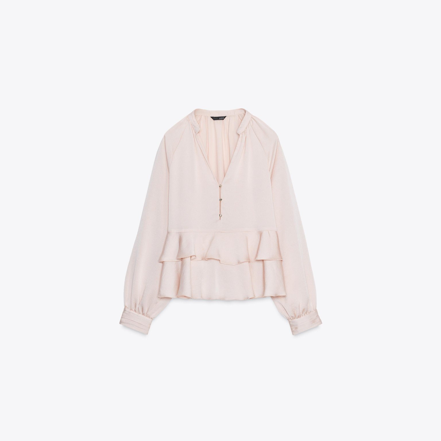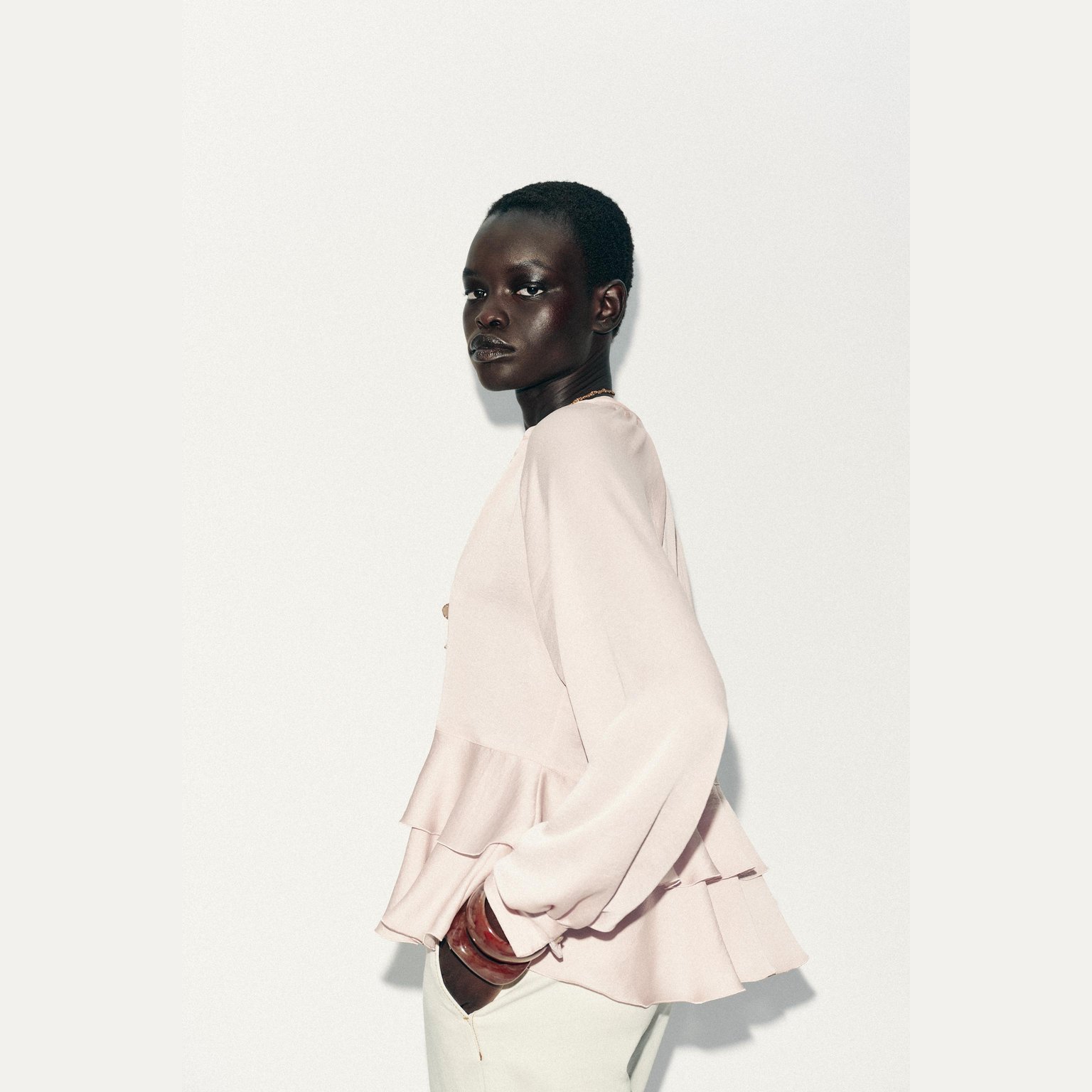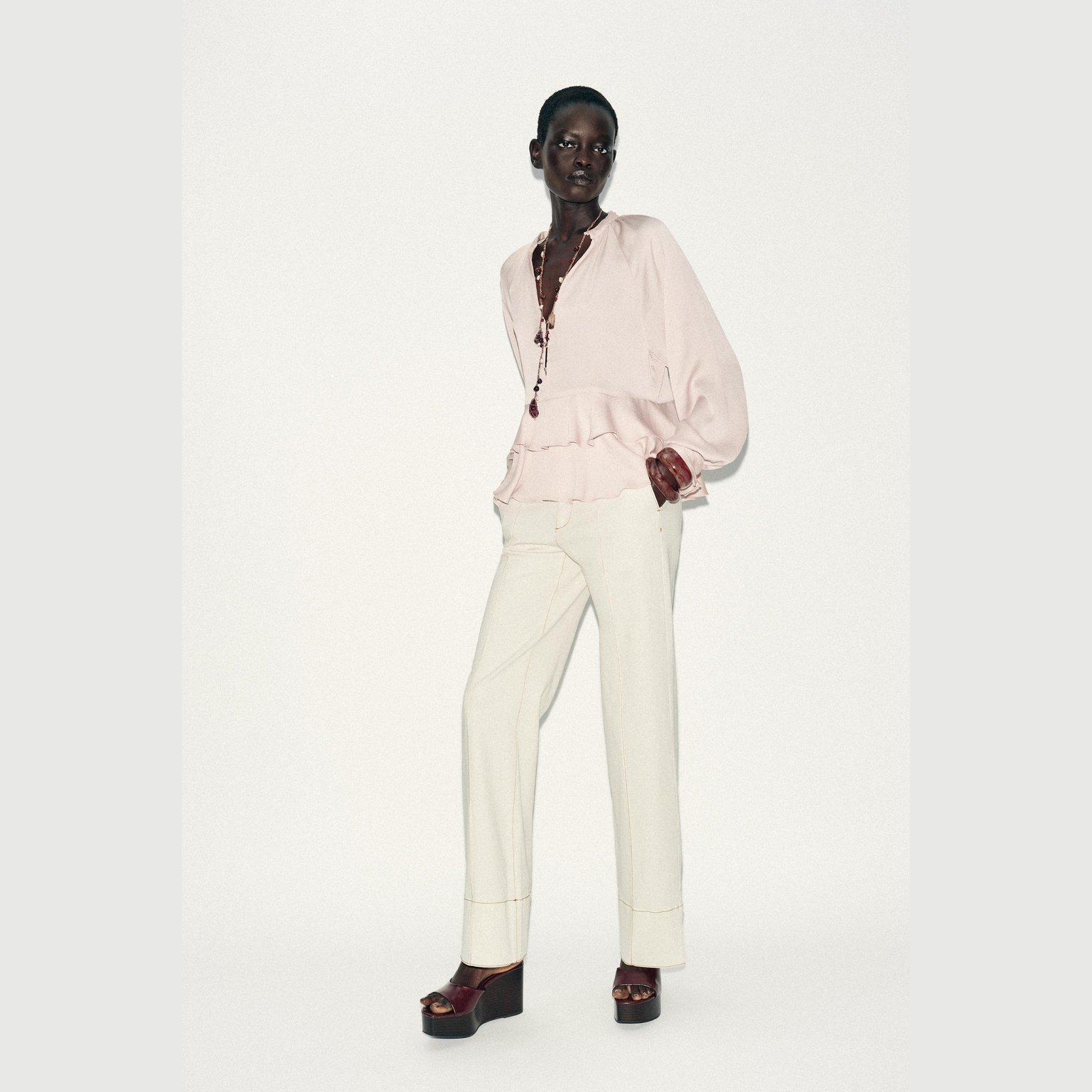 بلوزة بكشكش مع ياقة دائرية وفتحة V وأزرار معدنية – لون بيج‑وردي – Beige‑Pink (Ruffled Blouse) بلوزة أنيقة بتصميم ناعم، تتميز بياقة دائرية مع فتحة V وإغلاق أمامي بأزرار معدنية تضيف لمسة عصرية. تأتي بأكمام طويلة مع أساور بكسرات، إضافة إلى كشكش رقيق يمنح حركة وانسيابية للتصميم، مما يجعلها خيارًا مثاليًا للإطلالات اليومية والكاجوال الأنيقة.